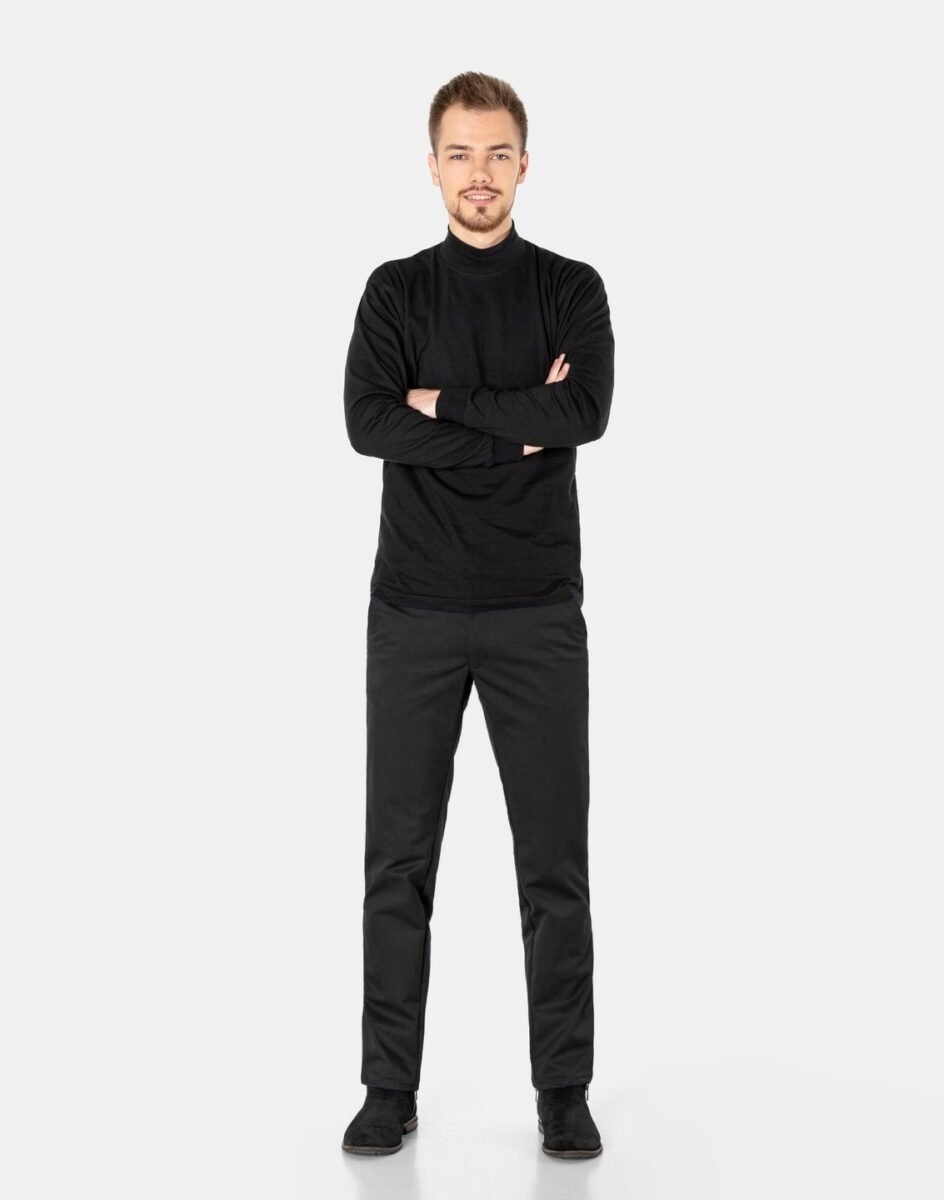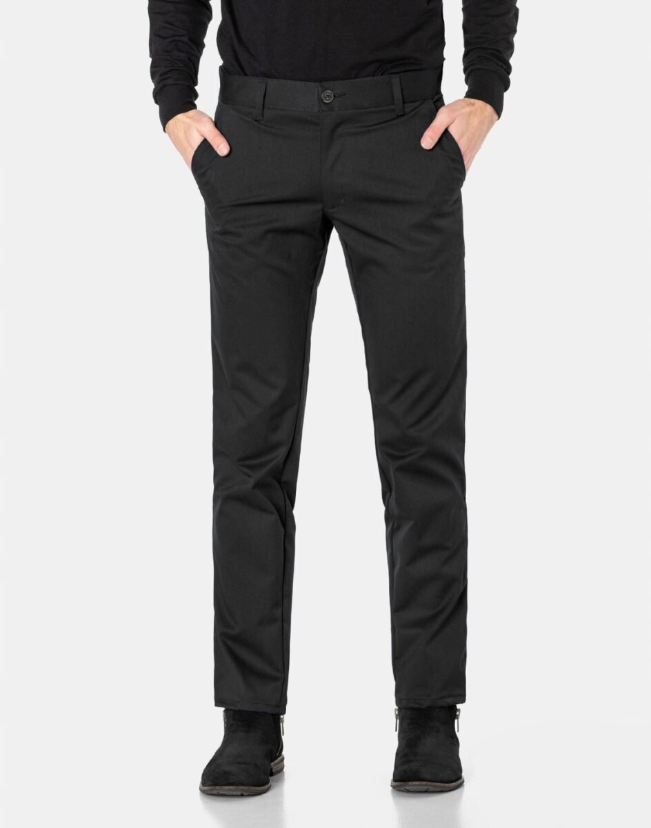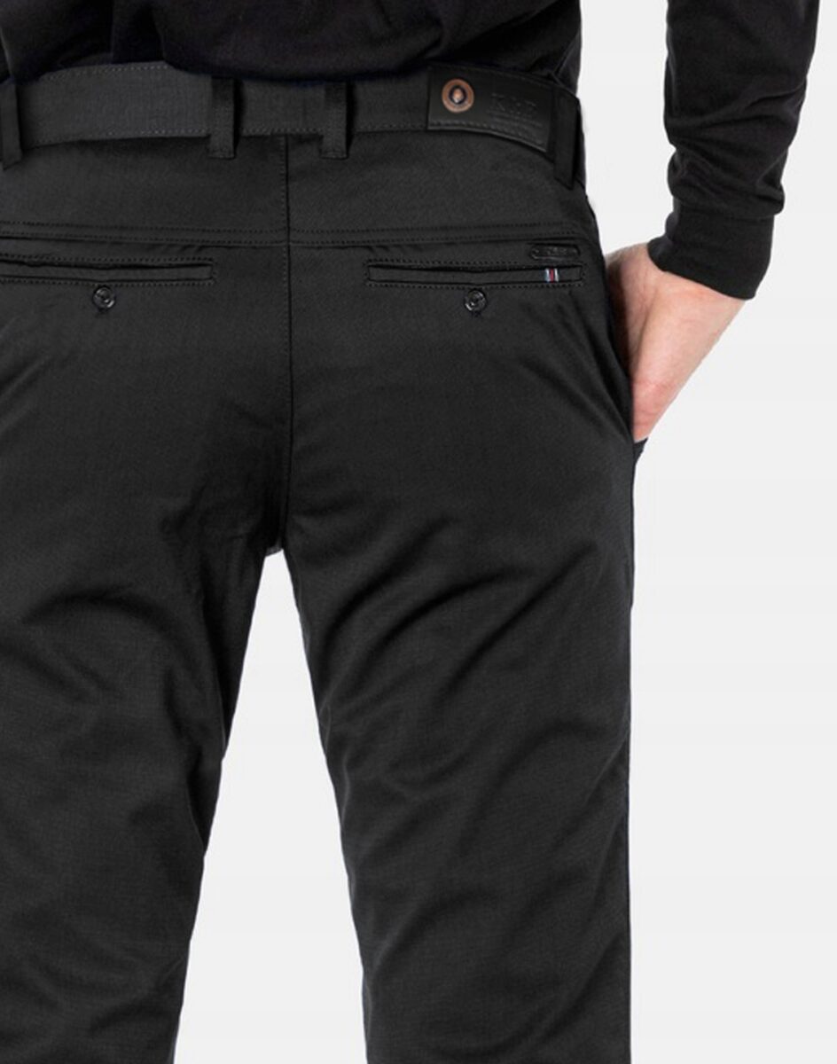 Spodnie męskie typu Chino zwane również Chinosami to klasyka wśród klasyki. Dedykowane są mężczyznom uwielbiającym elegancki i modny wygląd a jednocześnie sportowy charakter. Uszyte z wysokiej jakości, trwałej i mocnej, delikatnie elastycznej tkaniny bawełnianej średniej grubości o drobnym zapewniającym dużą wytrzymałość splocie. Niewielki dodatek elastan (lycra) sprawia, że spodnie są bardziej elastyczne, dobrze dopasowują się do sylwetki, i są bardzo komfortowe w użytkowaniu. Łatwo się je zakłada i są znacznie wygodniejsze od Chinosów, które lycry nie mają. Poza tym bawełna ma tendencję do kurczenia się w praniu, dlatego lycra sprawia, że spodnie są wyjątkowo praktyczne i można je bez problemu założyć po wysuszeniu. Pozwalają na pełną swobodę ruchów, co daje wygodę przy siadaniu i zapewnia ogromny komfort noszenia. Zapinane na kryty zamek błyskawiczny i guzik posiadają charakterystyczne dla Chinosów dwie skośne kieszenie na dłonie na bokach spodni oraz dwie wpuszczane kieszenie z tyłu. W pasie szlufki umożliwiające stylizacje z paskiem. Jak w typowych Chinosach nogawka lekko zwężana nie zaprasowana na kant sprawia, że sylwetka wygląda w nich lekko i zgrabnie.