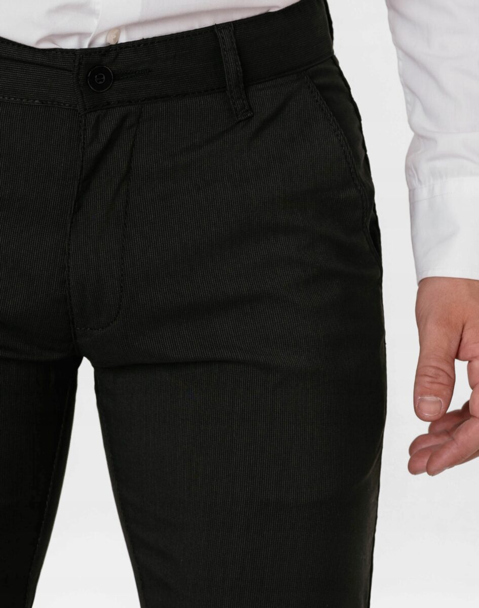 Spodnie męskie typu Chino zwane również Chinosami to klasyka wśród klasyki. Dedykowane są mężczyznom uwielbiającym elegancki i modny wygląd a jednocześnie sportowy charakter. Uszyte z wysokiej jakości, trwałej i mocnej, delikatnie elastycznej tkaniny bawełnianej średniej grubości o drobnym zapewniającym dużą wytrzymałość splocie. Niewielki dodatek elastanu ( stretch) sprawia że spodnie są bardziej elastyczne, dobrze dopasowują się do sylwetki, i są bardzo komfortowe w użytkowaniu. Łatwo się je zakłada i są znacznie wygodniejsze od spodni, które lycry nie mają. Pozwalają na pełną swobodę ruchów, co daje wygodę przy siadaniu i zapewnia ogromny komfort noszenia. Niewielka domieszka elastanu wystarczy, by nadać spodniom niezwykłych właściwości, odczuwanych przez cały dzień. Przez to że elastan trudno się gniecie, zapobiega to marszczeniu oraz zwiotczeniu tkaniny i latami może utrzymywać taką samą jakość jak z dnia zakupu, pomagając zadbać o elegancki wizerunek. Zapinane na kryty zamek błyskawiczny i guzik posiadają charakterystyczne dla Chinosów dwie skośne kieszenie na dłonie na bokach spodni oraz jedną mniejszą tzw. bilonówkę, dwie wpuszczane z tyłu. W pasie szlufki umożliwiające stylizacje z paskiem. Jak w typowych Chinosach nogawka lekko zwężana nie zaprasowana na kant sprawia, że sylwetka wygląda w nich lekko i zgrabnie.