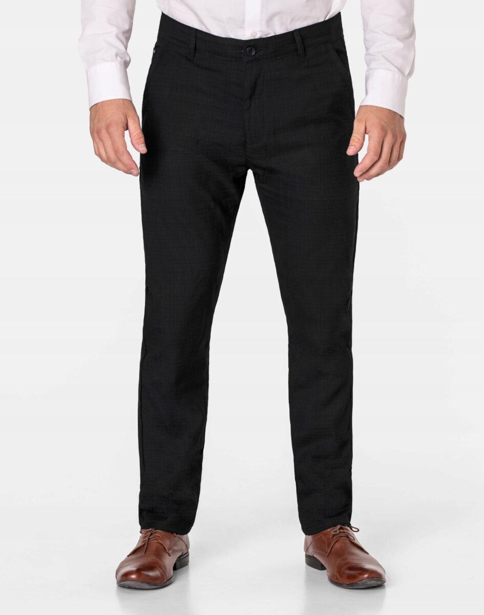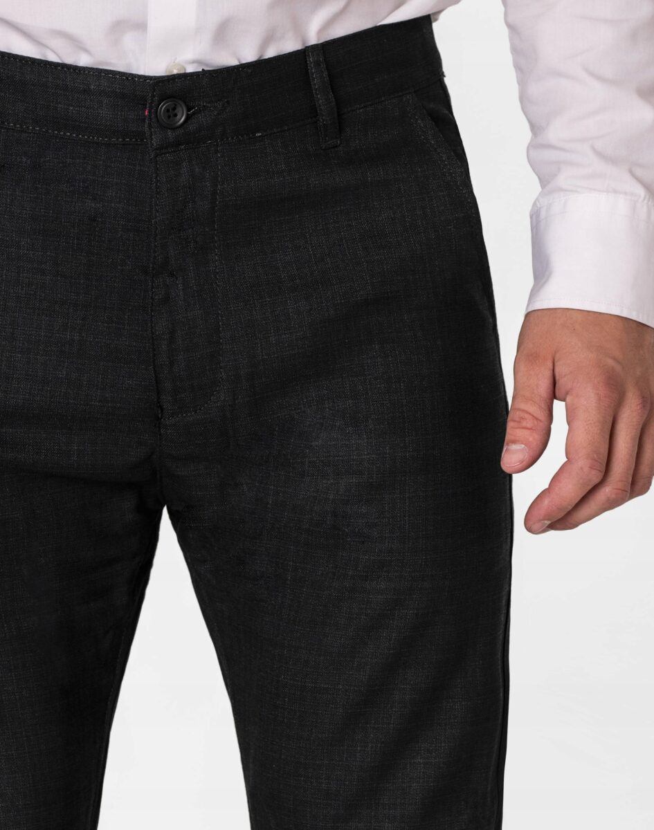 Spodnie męskie typu Chino zwane również Chinosami to klasyka wśród klasyki. Dedykowane są mężczyznom uwielbiającym elegancki i modny wygląd a jednocześnie sportowy charakter. Uszyte z wysokiej jakości, trwałej i mocnej, delikatnie elastycznej tkaniny bawełnianej średniej grubości o drobnym zapewniającym dużą wytrzymałość splocie. Pozwalają na pełną swobodę ruchów, co daje wygodę przy siadaniu i zapewnia ogromny komfort noszenia. Zapinane na kryty zamek błyskawiczny i guzik posiadają charakterystyczne dla Chinosów dwie skośne kieszenie na dłonie na bokach spodni oraz jedną mniejszą tzw. bilonówkę, dwie wpuszczane zapinane na guziki kieszenie z tyłu. W pasie szlufki umożliwiające stylizacje z paskiem. Jak w typowych Chinosach nogawka lekko zwężana nie zaprasowana na kant sprawia, że sylwetka wygląda w nich lekko i zgrabnie.