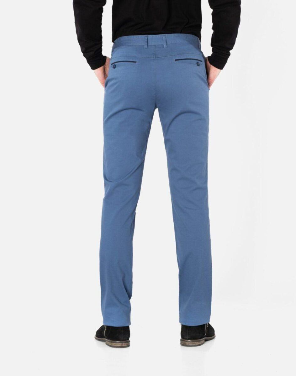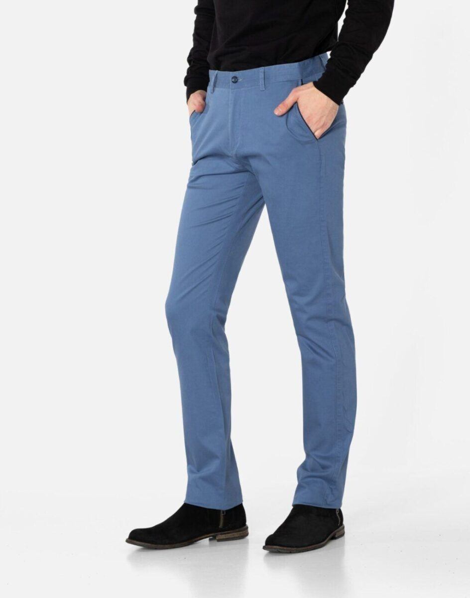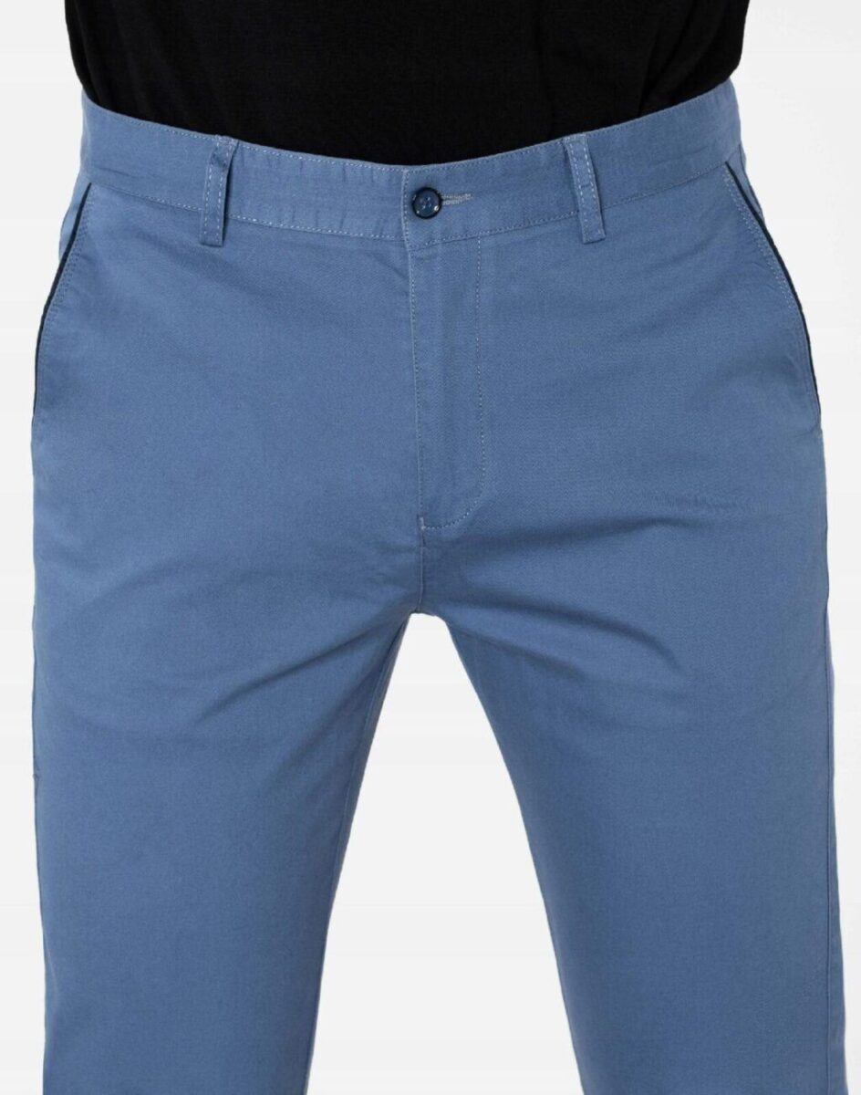 Eleganckie spodnie męskie typu Chino zwane również Chinosami to klasyka wśród klasyki. Uszyte z mocnej tkaniny bawełnianej o drobnym zapewniającym dużą wytrzymałość splocie. Zapinane na kryty zamek błyskawiczny i guzik posiadają charakterystyczne dla Chinosów dwie skośne kieszenie na dłonie na bokach spodni i dwie wpuszczane kieszenie z tyłu. W pasie szlufki umożliwiające stylizacje z paskiem. Użyta do produkcji spodni wysokiej jakości tkanina bawełniana jest delikatnie elastyczna co sprawia że spodnie są wyjątkowo wygodne w użytkowaniu, pozwalają na pełną swobodę ruchów co daje wygodę przy siadaniu i zapewnia ogromny komfort noszenia. Klasyczna lekko zwężana nogawka nie zaprasowana na kant.