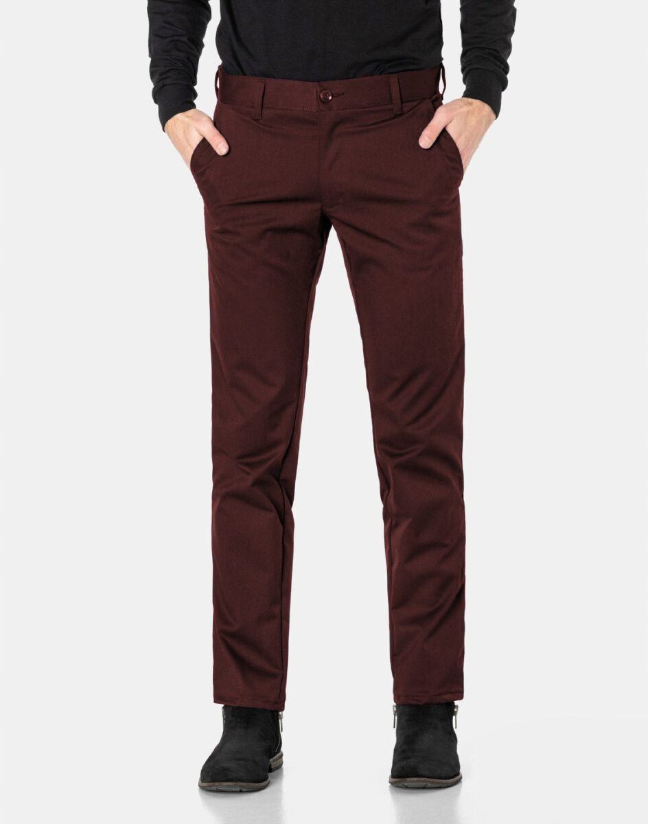 Spodnie męskie typu Chino zwane również Chinosami to klasyka wśród klasyki. Dedykowane są mężczyznom uwielbiającym elegancki i modny wygląd a jednocześnie sportowy charakter. Uszyte z wysokiej jakości, trwałej i mocnej, delikatnie elastycznej tkaniny bawełnianej średniej grubości o drobnym zapewniającym dużą wytrzymałość splocie. Niewielki dodatek elstanu (lycra) sprawia, że spodnie są bardziej elastyczne, dobrze dopasowują się do sylwetki, i są bardzo komfortowe w użytkowaniu. Łatwo się je zakłada i są znacznie wygodniejsze od Chinosów, które lycry nie mają. Poza tym bawełna ma tendencję do kurczenia się w praniu, dlatego lycra sprawia, że spodnie są wyjątkowo praktyczne i można je bez problemu założyć po wysuszeniu. Pozwalają na pełną swobodę ruchów, co daje wygodę przy siadaniu i zapewnia ogromny komfort noszenia. Zapinane na kryty zamek błyskawiczny i guzik posiadają charakterystyczne dla Chinosów dwie skośne kieszenie na dłonie na bokach spodni oraz dwie wpuszczane kieszenie z tyłu. W pasie szlufki umożliwiające stylizacje z paskiem. Jak w typowych Chinosach nogawka lekko zwężana nie zaprasowana na kant sprawia, że sylwetka wygląda w nich lekko i zgrabnie.
