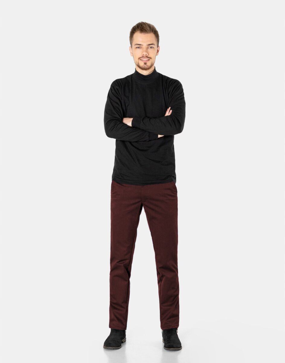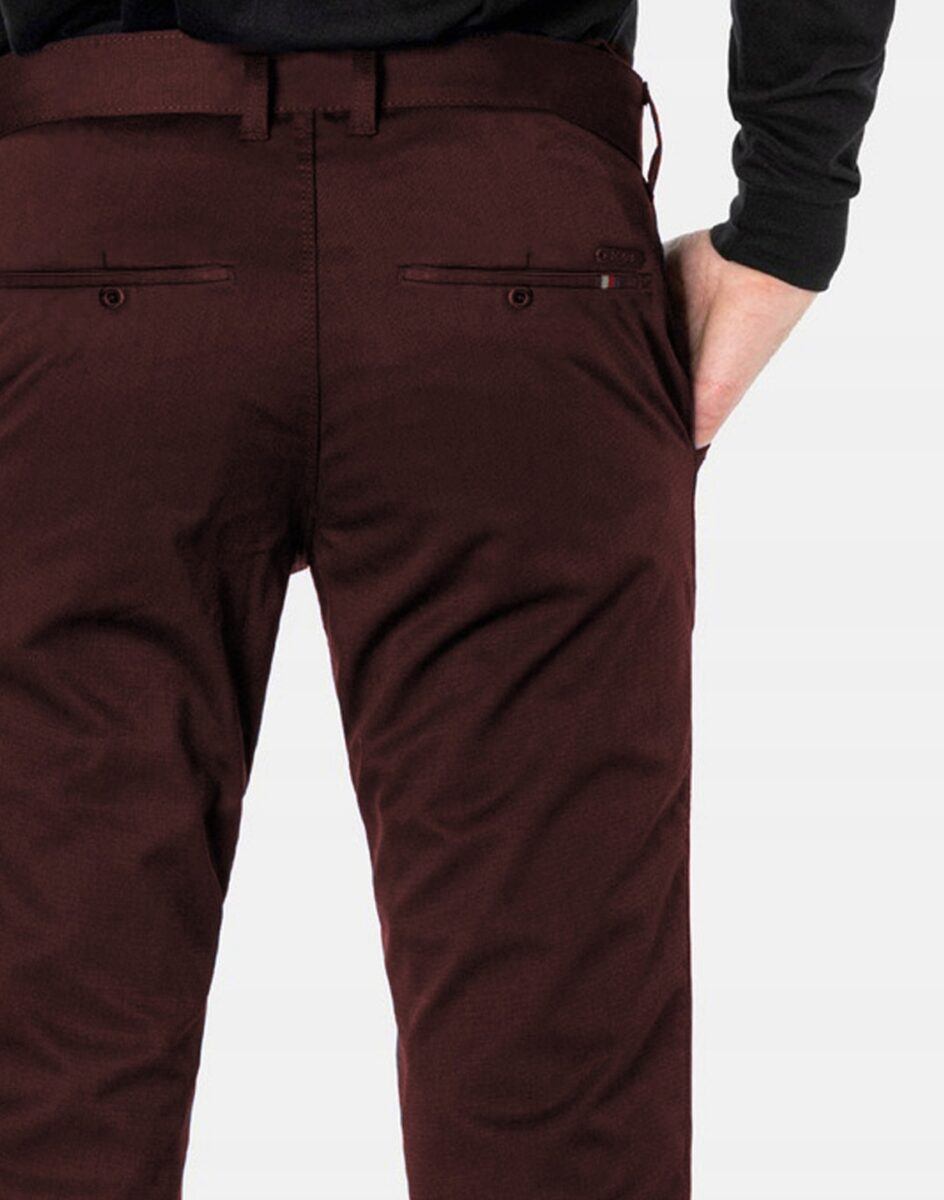 Spodnie męskie typu Chino zwane również Chinosami to klasyka wśród klasyki. Dedykowane są mężczyznom uwielbiającym elegancki i modny wygląd a jednocześnie sportowy charakter. Uszyte z wysokiej jakości, trwałej i mocnej, delikatnie elastycznej tkaniny bawełnianej średniej grubości o drobnym zapewniającym dużą wytrzymałość splocie. Niewielki dodatek elstanu (lycra) sprawia, że spodnie są bardziej elastyczne, dobrze dopasowują się do sylwetki, i są bardzo komfortowe w użytkowaniu. Łatwo się je zakłada i są znacznie wygodniejsze od Chinosów, które lycry nie mają. Poza tym bawełna ma tendencję do kurczenia się w praniu, dlatego lycra sprawia, że spodnie są wyjątkowo praktyczne i można je bez problemu założyć po wysuszeniu. Pozwalają na pełną swobodę ruchów, co daje wygodę przy siadaniu i zapewnia ogromny komfort noszenia. Zapinane na kryty zamek błyskawiczny i guzik posiadają charakterystyczne dla Chinosów dwie skośne kieszenie na dłonie na bokach spodni oraz dwie wpuszczane kieszenie z tyłu. W pasie szlufki umożliwiające stylizacje z paskiem. Jak w typowych Chinosach nogawka lekko zwężana nie zaprasowana na kant sprawia, że sylwetka wygląda w nich lekko i zgrabnie.