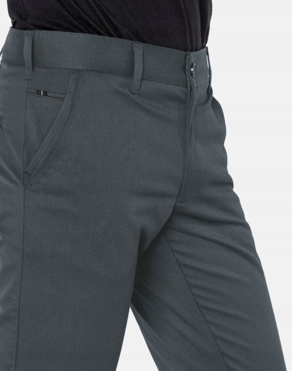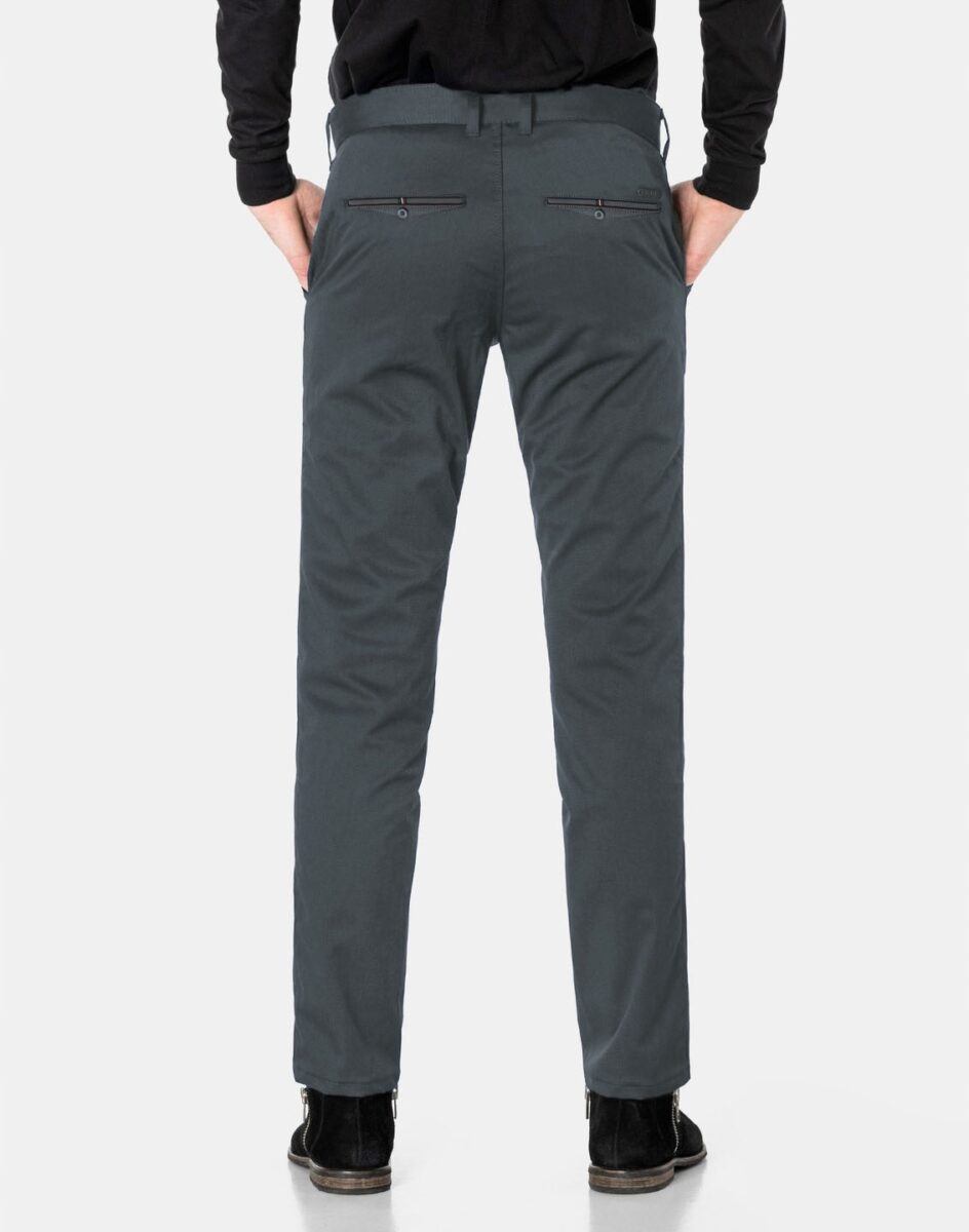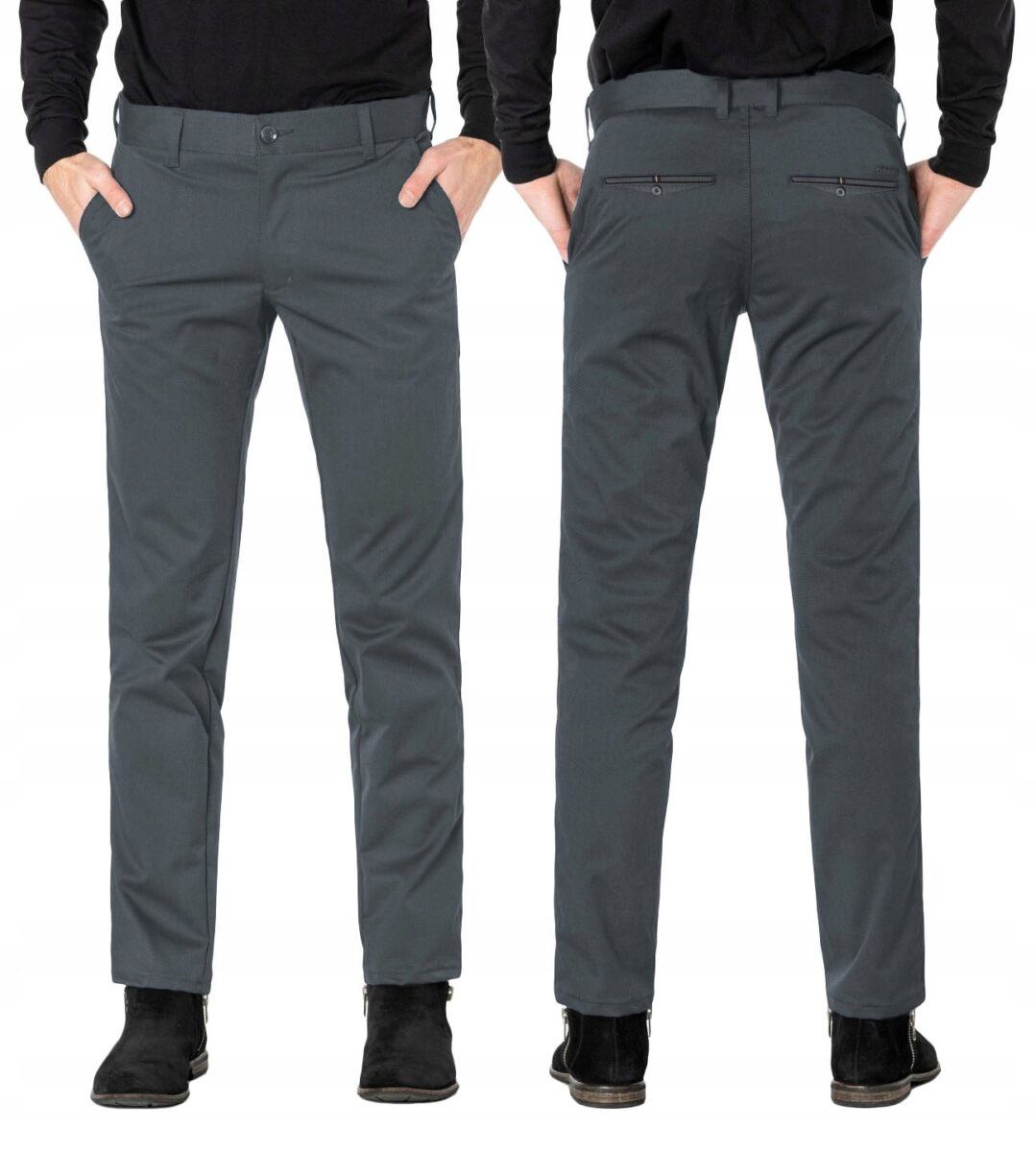 Spodnie męskie typu Chino zwane również Chinosami to klasyka wśród klasyki. Dedykowane są mężczyznom uwielbiającym elegancki i modny wygląd a jednocześnie sportowy charakter. Uszyte z wysokiej jakości, trwałej i mocnej, delikatnie elastycznej tkaniny bawełnianej średniej grubości o drobnym zapewniającym dużą wytrzymałość splocie. Niewielki dodatek elstanu (lycra) sprawia, że spodnie są bardziej elastyczne, dobrze dopasowują się do sylwetki, i są bardzo komfortowe w użytkowaniu. Łatwo się je zakłada i są znacznie wygodniejsze od Chinosów, które lycry nie mają. Poza tym bawełna ma tendencję do kurczenia się w praniu, dlatego lycra sprawia, że spodnie są wyjątkowo praktyczne i można je bez problemu założyć po wysuszeniu. Pozwalają na pełną swobodę ruchów, co daje wygodę przy siadaniu i zapewnia ogromny komfort noszenia. Zapinane na kryty zamek błyskawiczny i guzik posiadają charakterystyczne dla Chinosów dwie skośne kieszenie na dłonie na bokach spodni oraz bilonówka, dwie wpuszczane kieszenie z tyłu. W pasie szlufki umożliwiające stylizacje z paskiem. Jak w typowych Chinosach nogawka lekko zwężana nie zaprasowana na kant sprawia, że sylwetka wygląda w nich lekko i zgrabnie.