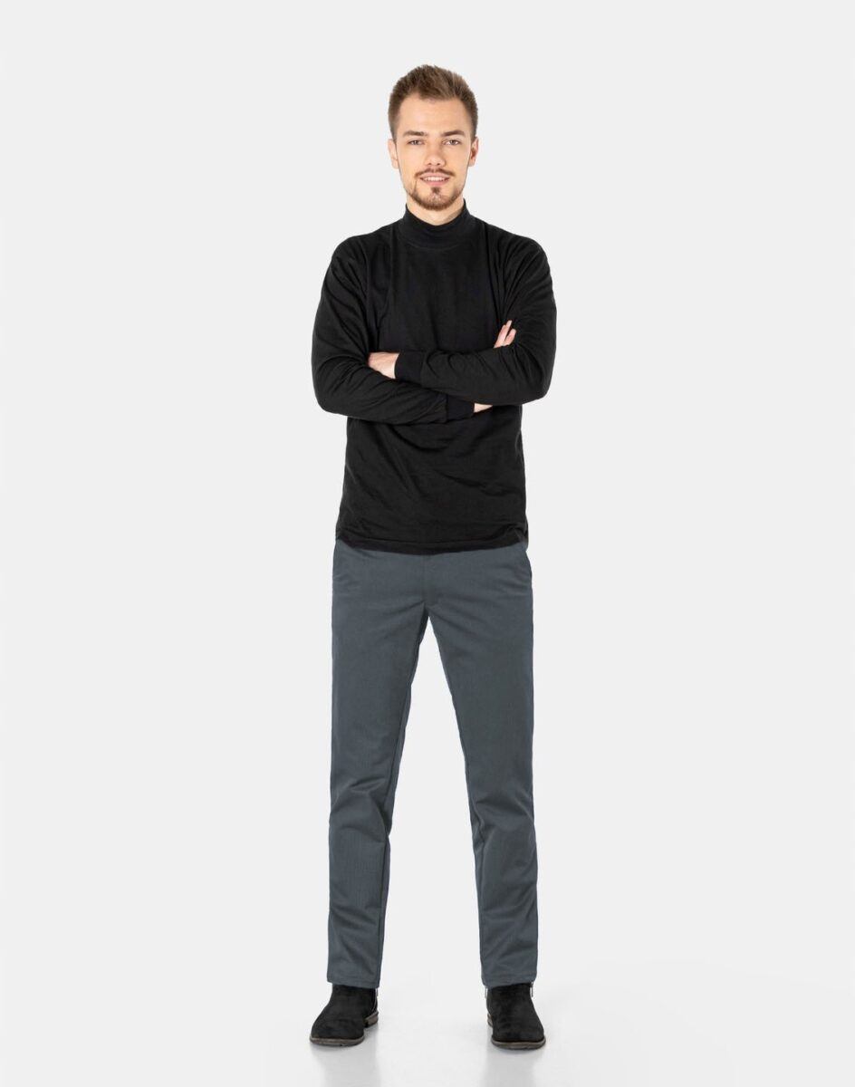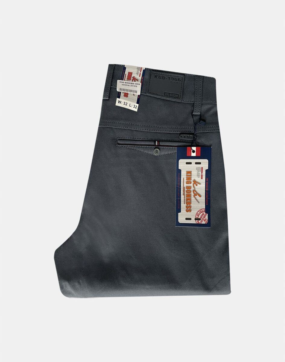 Spodnie męskie typu Chino zwane również Chinosami to klasyka wśród klasyki. Dedykowane są mężczyznom uwielbiającym elegancki i modny wygląd a jednocześnie sportowy charakter. Uszyte z wysokiej jakości, trwałej i mocnej, delikatnie elastycznej tkaniny bawełnianej średniej grubości o drobnym zapewniającym dużą wytrzymałość splocie. Niewielki dodatek elstanu (lycra) sprawia, że spodnie są bardziej elastyczne, dobrze dopasowują się do sylwetki, i są bardzo komfortowe w użytkowaniu. Łatwo się je zakłada i są znacznie wygodniejsze od Chinosów, które lycry nie mają. Poza tym bawełna ma tendencję do kurczenia się w praniu, dlatego lycra sprawia, że spodnie są wyjątkowo praktyczne i można je bez problemu założyć po wysuszeniu. Pozwalają na pełną swobodę ruchów, co daje wygodę przy siadaniu i zapewnia ogromny komfort noszenia. Zapinane na kryty zamek błyskawiczny i guzik posiadają charakterystyczne dla Chinosów dwie skośne kieszenie na dłonie na bokach spodni oraz bilonówka, dwie wpuszczane kieszenie z tyłu. W pasie szlufki umożliwiające stylizacje z paskiem. Jak w typowych Chinosach nogawka lekko zwężana nie zaprasowana na kant sprawia, że sylwetka wygląda w nich lekko i zgrabnie.