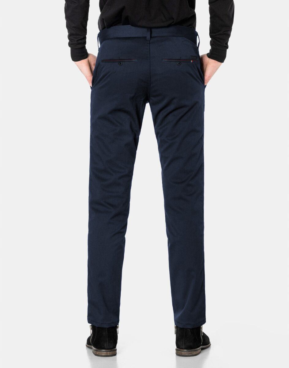 Spodnie męskie typu Chino zwane również Chinosami to klasyka wśród klasyki. Dedykowane są mężczyznom uwielbiającym elegancki i modny wygląd a jednocześnie sportowy charakter. Uszyte z wysokiej jakości, trwałej i mocnej, delikatnie elastycznej tkaniny bawełnianej średniej grubości o drobnym zapewniającym dużą wytrzymałość splocie. Niewielki dodatek elstanu (lycra) sprawia, że spodnie są bardziej elastyczne, dobrze dopasowują się do sylwetki, i są bardzo komfortowe w użytkowaniu. Łatwo się je zakłada i są znacznie wygodniejsze od Chinosów, które lycry nie mają. Poza tym bawełna ma tendencję do kurczenia się w praniu, dlatego lycra sprawia, że spodnie są wyjątkowo praktyczne i można je bez problemu założyć po wysuszeniu. Pozwalają na pełną swobodę ruchów, co daje wygodę przy siadaniu i zapewnia ogromny komfort noszenia. Zapinane na kryty zamek błyskawiczny i guzik posiadają charakterystyczne dla Chinosów dwie skośne kieszenie na dłonie na bokach spodni oraz dwie wpuszczane kieszenie z tyłu. W pasie szlufki umożliwiające stylizacje z paskiem. Jak w typowych Chinosach nogawka lekko zwężana nie zaprasowana na kant sprawia, że sylwetka wygląda w nich lekko i zgrabnie.