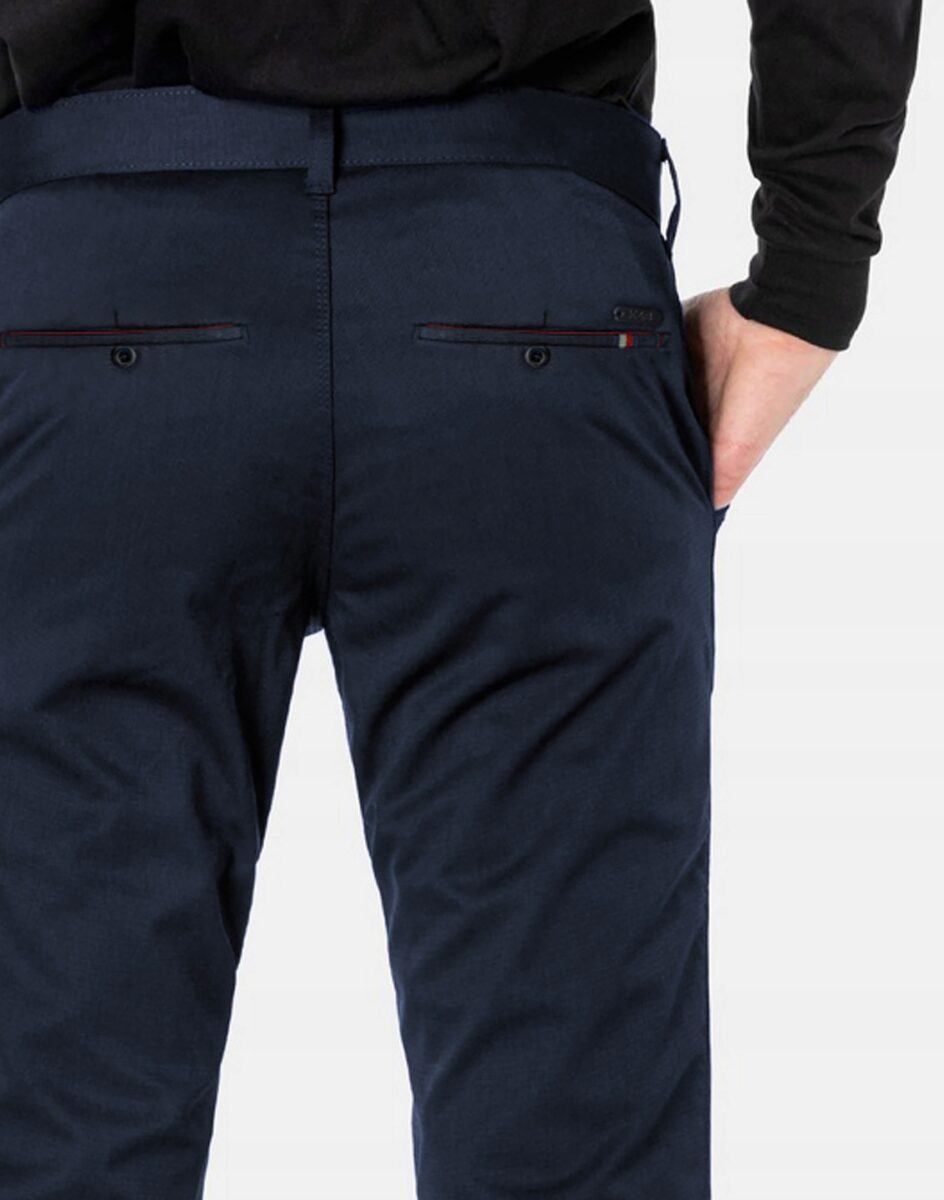 Spodnie męskie typu Chino zwane również Chinosami to klasyka wśród klasyki. Dedykowane są mężczyznom uwielbiającym elegancki i modny wygląd a jednocześnie sportowy charakter. Uszyte z wysokiej jakości, trwałej i mocnej, delikatnie elastycznej tkaniny bawełnianej średniej grubości o drobnym zapewniającym dużą wytrzymałość splocie. Niewielki dodatek elstanu (lycra) sprawia, że spodnie są bardziej elastyczne, dobrze dopasowują się do sylwetki, i są bardzo komfortowe w użytkowaniu. Łatwo się je zakłada i są znacznie wygodniejsze od Chinosów, które lycry nie mają. Poza tym bawełna ma tendencję do kurczenia się w praniu, dlatego lycra sprawia, że spodnie są wyjątkowo praktyczne i można je bez problemu założyć po wysuszeniu. Pozwalają na pełną swobodę ruchów, co daje wygodę przy siadaniu i zapewnia ogromny komfort noszenia. Zapinane na kryty zamek błyskawiczny i guzik posiadają charakterystyczne dla Chinosów dwie skośne kieszenie na dłonie na bokach spodni oraz dwie wpuszczane kieszenie z tyłu. W pasie szlufki umożliwiające stylizacje z paskiem. Jak w typowych Chinosach nogawka lekko zwężana nie zaprasowana na kant sprawia, że sylwetka wygląda w nich lekko i zgrabnie.