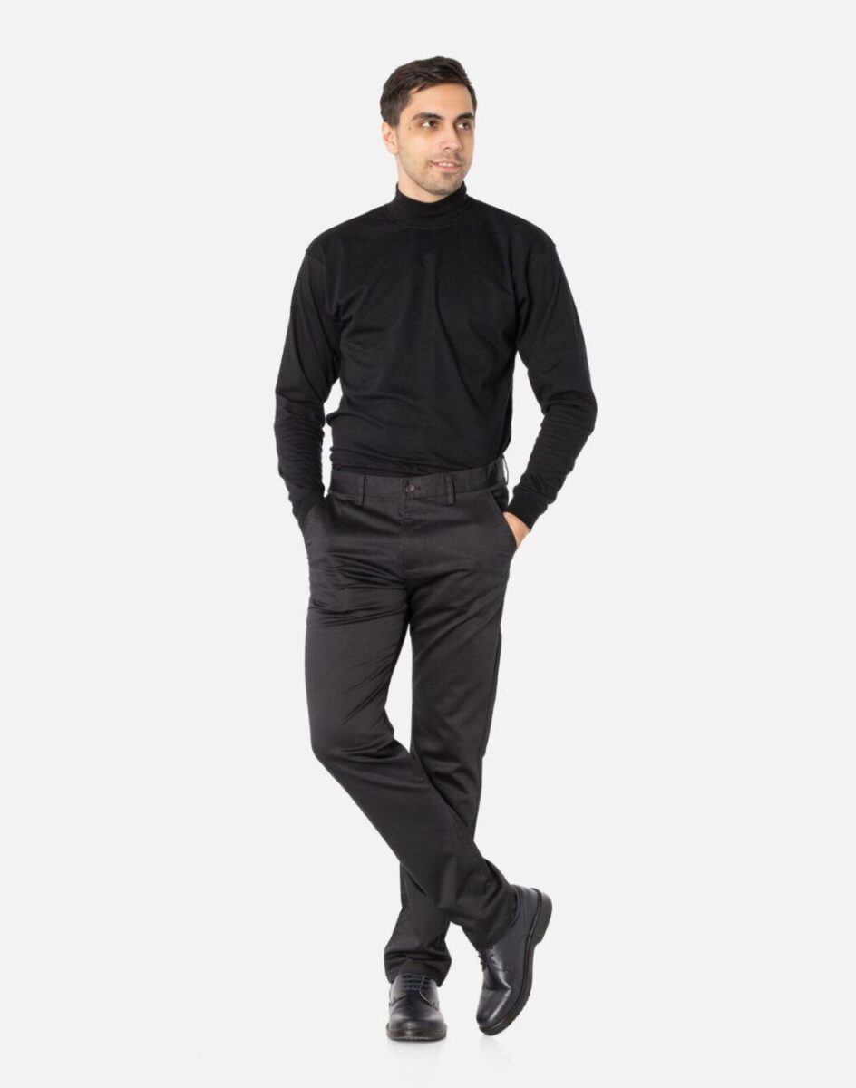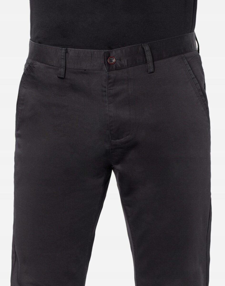 Spodnie męskie typu Chino zwane również Chinosami to klasyka wśród klasyki. Dedykowane mężczyznom uwielbiającym elegancki i modny wygląd a jednocześnie sportowy charakter. Uszyte z mocnej tkaniny bawełnianej średniej grubości o drobnym zapewniającym dużą wytrzymałość splocie. Zapinane na kryty zamek błyskawiczny i guzik posiadają charakterystyczne dla Chinosów dwie skośne kieszenie na dłonie na bokach spodni i dwie wpuszczane kieszenie z tyłu zapinane na guziki. W pasie szlufki umożliwiające stylizacje z paskiem. Użyta do produkcji spodni wysokiej jakości tkanina bawełniana dzięki niewielkiemu dodatkowi lycry jest delikatnie elastyczna co sprawia że spodnie są wyjątkowo wygodne w użytkowaniu, pozwalają na pełną swobodę ruchów co daje wygodę przy siadaniu i zapewnia ogromny komfort noszenia. Klasyczna lekko zwężana nogawka nie zaprasowana na kant.