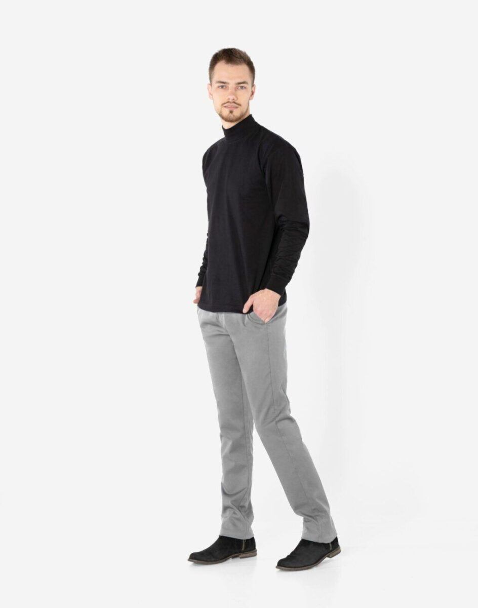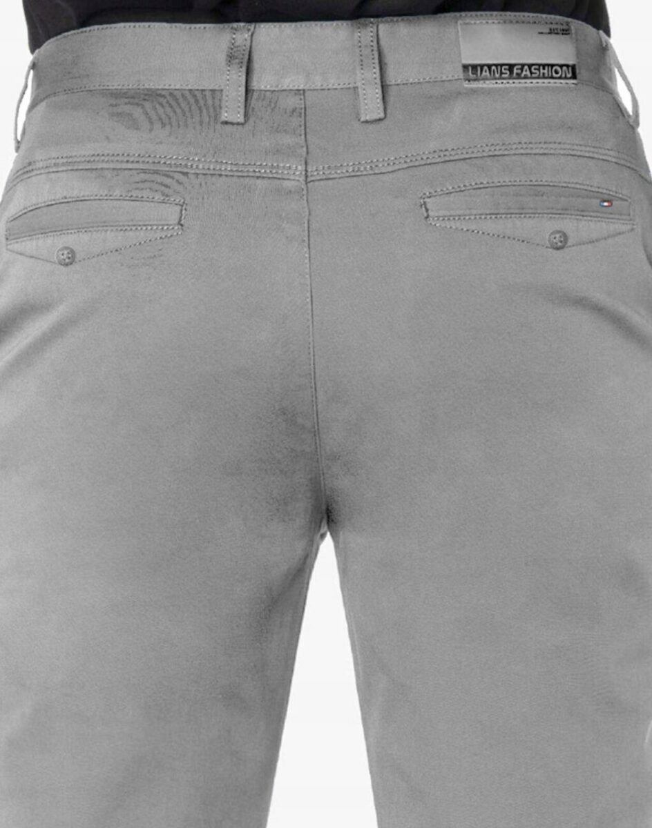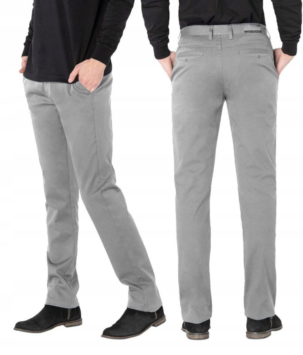 Spodnie męskie typu Chino zwane również Chinosami to klasyka wśród klasyki. Dedykowane mężczyznom uwielbiającym elegancki i modny wygląd a jednocześnie sportowy charakter. Uszyte z mocnej tkaniny bawełnianej średniej grubości o drobnym zapewniającym dużą wytrzymałość splocie. Zapinane na kryty zamek błyskawiczny i guzik posiadają charakterystyczne dla Chinosów dwie skośne kieszenie na dłonie na bokach spodni oraz mniejszą kieszonkę tzw. bilonówkę i dwie wpuszczane kieszenie ozdobione guzikami z tyłu spodni. W pasie szlufki umożliwiające stylizacje z paskiem. Użyta do produkcji spodni wysokiej jakości tkanina bawełniana dzięki niewielkiemu dodatkowi lycry (elastan) jest delikatnie elastyczna co sprawia że spodnie są wyjątkowo wygodne w użytkowaniu, pozwalają na pełną swobodę ruchów co daje wygodę przy siadaniu i zapewnia ogromny komfort noszenia. Klasyczna lekko zwężana nogawka nie zaprasowana na kant.