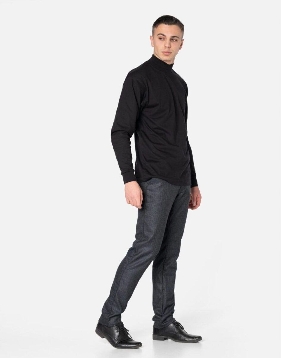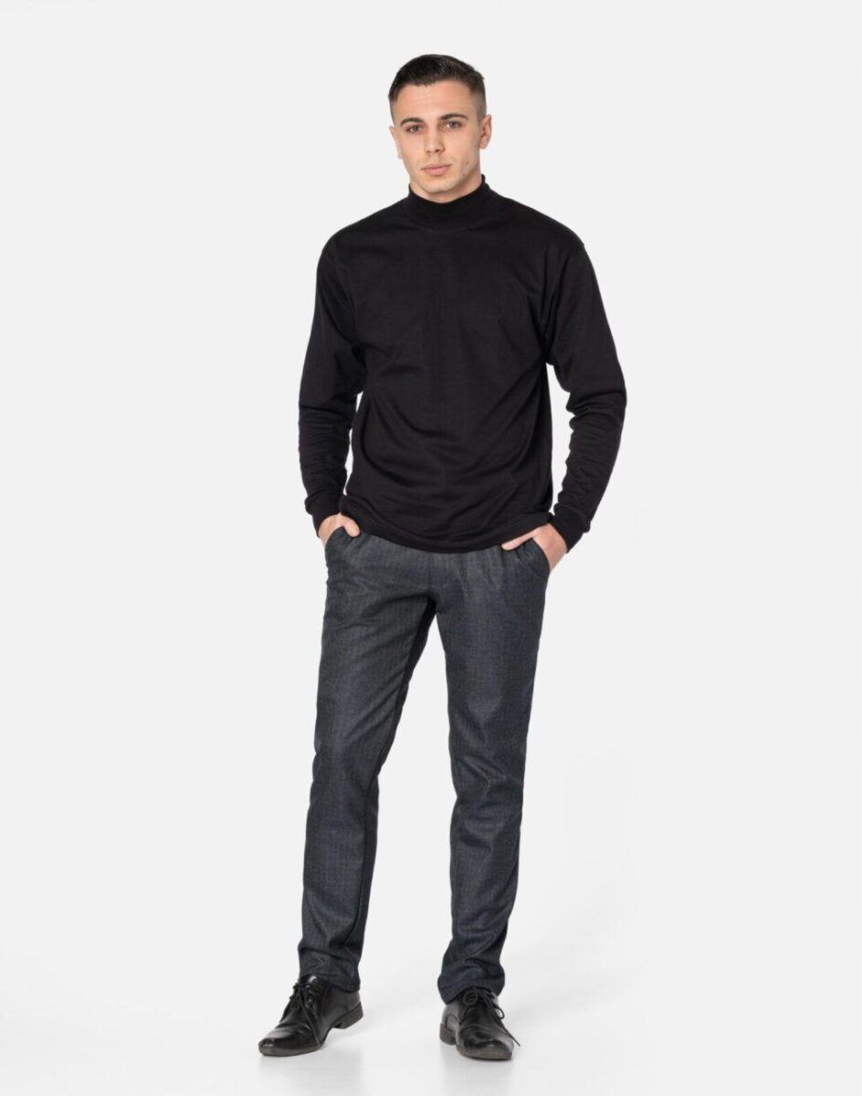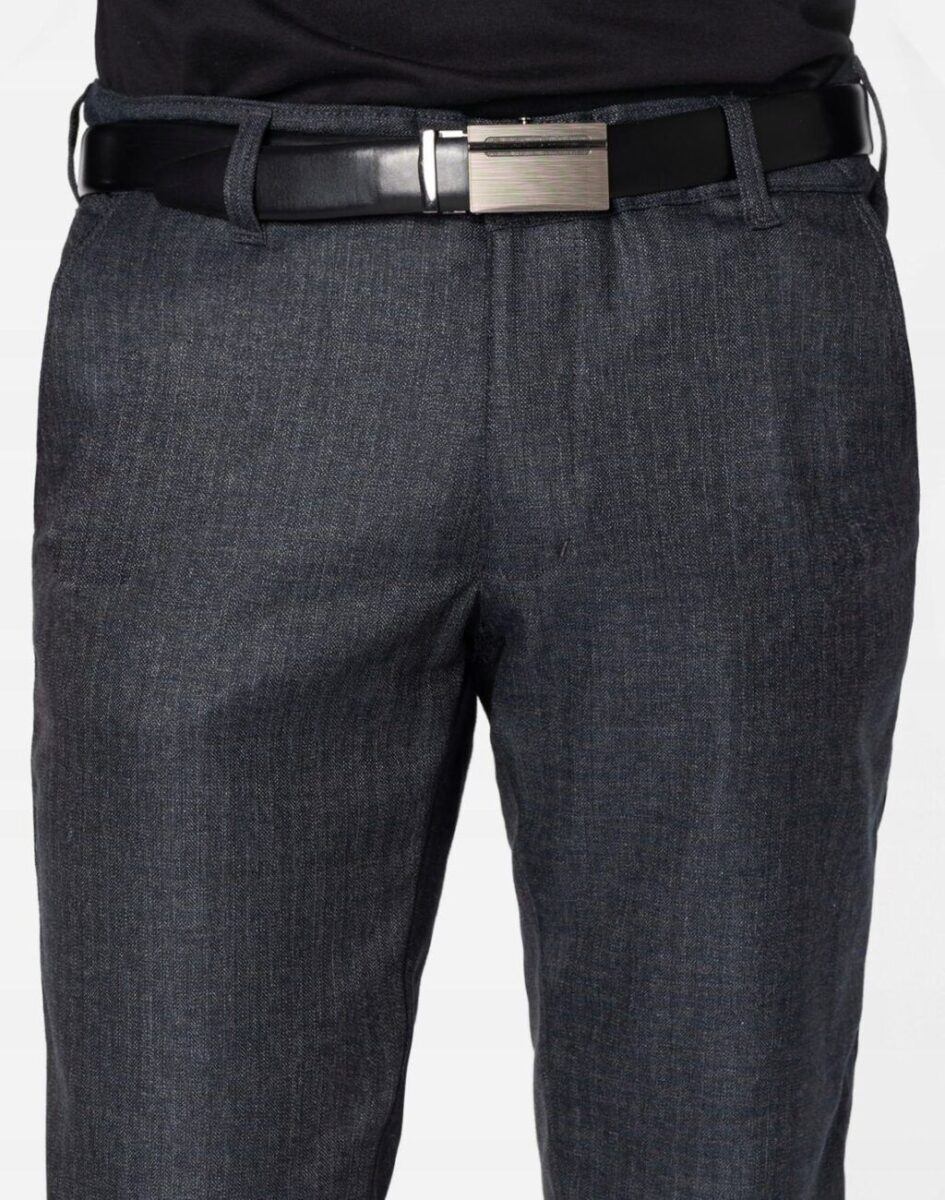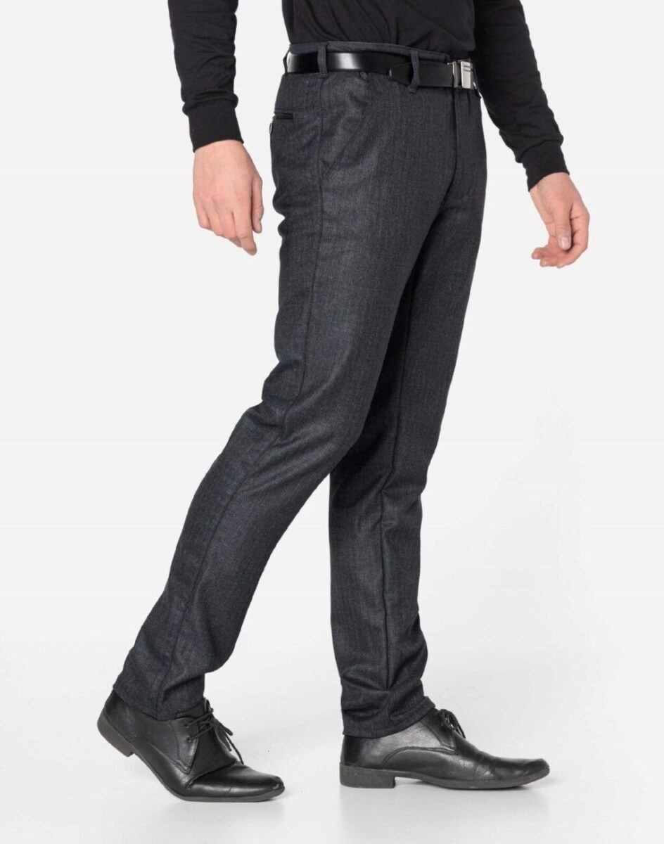 Klasyczne spodnie męskie bawełniane ze standardowym stanem i klasyczną lekko zwężaną nogawką to jeden z najczęściej wybieranych modeli spodni. Wykonane z wysokiej jakości gęstej, trwałej i mocnej tkaniny bawełnianej o jednolitym wybarwieniu z dodatkiem elastanu. Spodnie są bardzo elastyczne, pozwalają na pełną swobodę ruchów co daje użytkownikowi wygodę przy siadaniu i zapewnia ogromny komfort noszenia. Zapinane są na kryty zamek błyskawiczny i guzik. Z przodu mają dwie kieszonki zaokrąglone, a na tyle klasyczne kieszenie zapinane na guzik. W pasie szlufki umożliwiające stylizacje z paskiem. Najbardziej podatne na uszkodzenia miejsca wzmocnione są dodatkowymi przeszyciami i nitami.