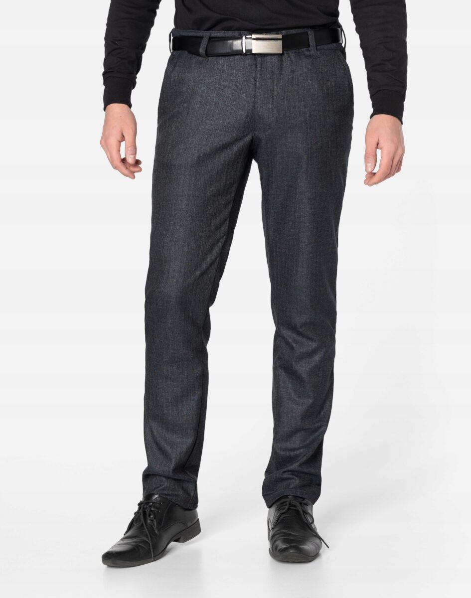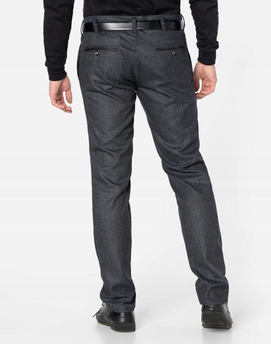 Klasyczne spodnie męskie bawełniane ze standardowym stanem i klasyczną lekko zwężaną nogawką to jeden z najczęściej wybieranych modeli spodni. Wykonane z wysokiej jakości gęstej, trwałej i mocnej tkaniny bawełnianej o jednolitym wybarwieniu z dodatkiem elastanu. Spodnie są bardzo elastyczne, pozwalają na pełną swobodę ruchów co daje użytkownikowi wygodę przy siadaniu i zapewnia ogromny komfort noszenia. Zapinane są na kryty zamek błyskawiczny i guzik. Z przodu mają dwie kieszonki zaokrąglone, a na tyle klasyczne kieszenie zapinane na guzik. W pasie szlufki umożliwiające stylizacje z paskiem. Najbardziej podatne na uszkodzenia miejsca wzmocnione są dodatkowymi przeszyciami i nitami.