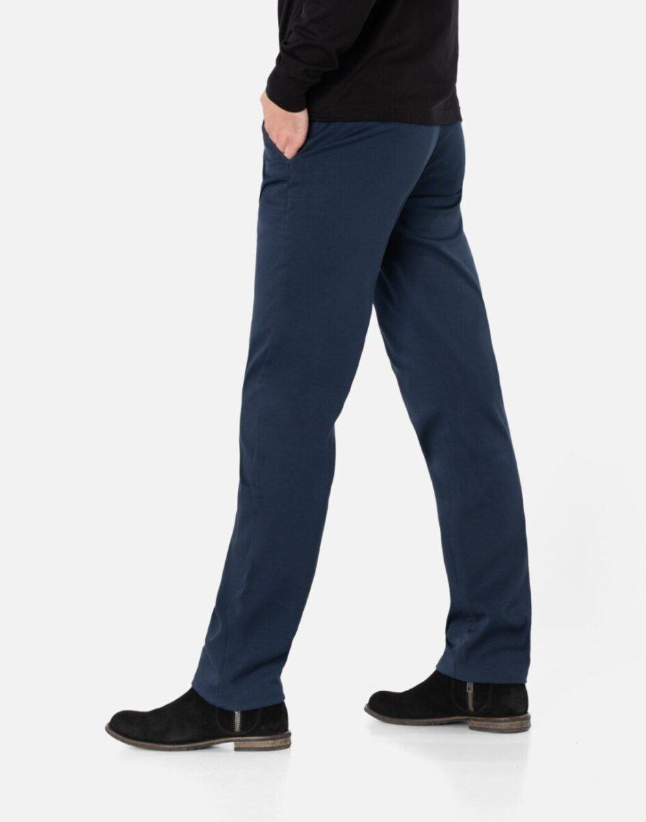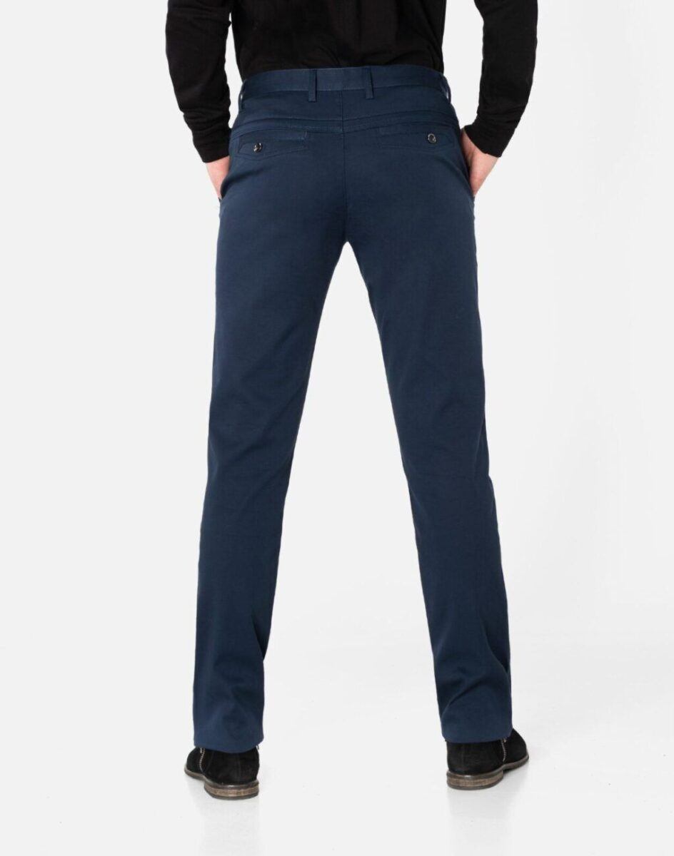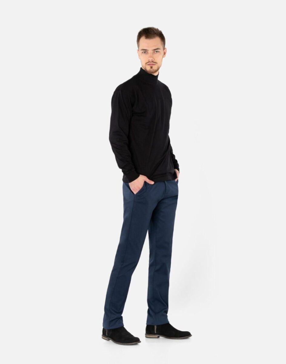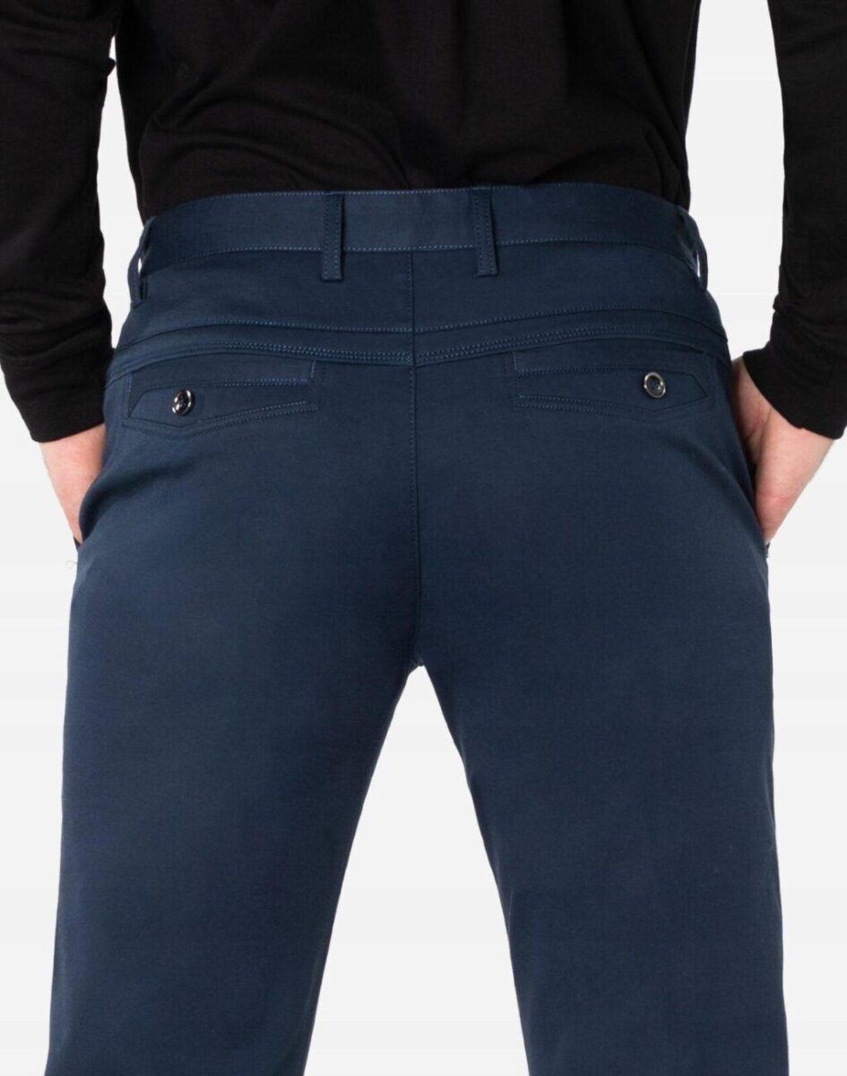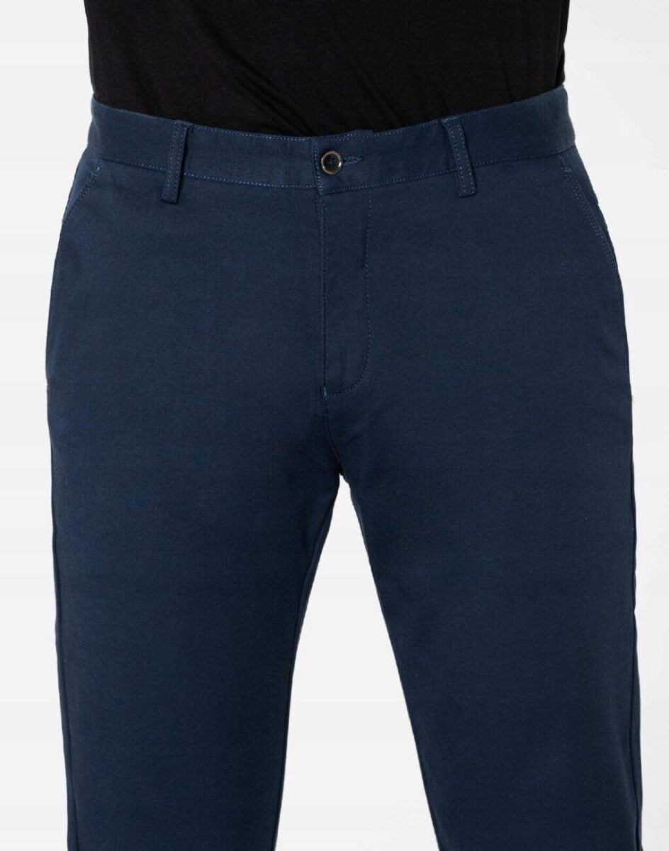 Eleganckie spodnie męskie typu Chino zwane również Chinosami to klasyka wśród klasyki. Uszyte z mocnej tkaniny bawełnianej o drobnym zapewniającym dużą wytrzymałość splocie. Zapinane na kryty zamek błyskawiczny i guzik posiadają charakterystyczne dla Chinosów dwie skośne kieszenie na dłonie na bokach spodni i dwie wpuszczane kieszenie z tyłu. W pasie szlufki umożliwiające stylizacje z paskiem. Użyta do produkcji spodni wysokiej jakości tkanina bawełniana jest delikatnie elastyczna co sprawia że spodnie są wyjątkowo wygodne w użytkowaniu, pozwalają na pełną swobodę ruchów co daje wygodę przy siadaniu i zapewnia ogromny komfort noszenia. Klasyczna lekko zwężana nogawka nie zaprasowana na kant.