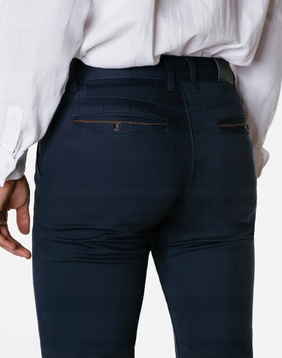 Spodnie męskie typu Chino zwane również Chinosami to klasyka wśród klasyki. Dedykowane mężczyznom uwielbiającym elegancki i modny wygląd a jednocześnie sportowy charakter. Uszyte z mocnej tkaniny bawełnianej średniej grubości o drobnym zapewniającym dużą wytrzymałość splocie. Zapinane na kryty zamek błyskawiczny i guzik posiadają charakterystyczne dla Chinosów dwie skośne kieszenie na dłonie na bokach spodni oraz jedną mniejszą tzw. bilonówkę, dwie wpuszczane kieszenie z tyłu. W pasie szlufki umożliwiające stylizacje z paskiem. Użyta do produkcji spodni wysokiej jakości tkanina bawełniana dzięki niewielkiemu dodatkowi lycry (elastan) jest delikatnie elastyczna co sprawia że spodnie są wyjątkowo wygodne w użytkowaniu, pozwalają na pełną swobodę ruchów co daje wygodę przy siadaniu i zapewnia ogromny komfort noszenia. Jak w typowych Chinosach nogawka lekko zwężana nie zaprasowana na kant sprawia, że sylwetka wygląda w nich lekko i zgrabnie.