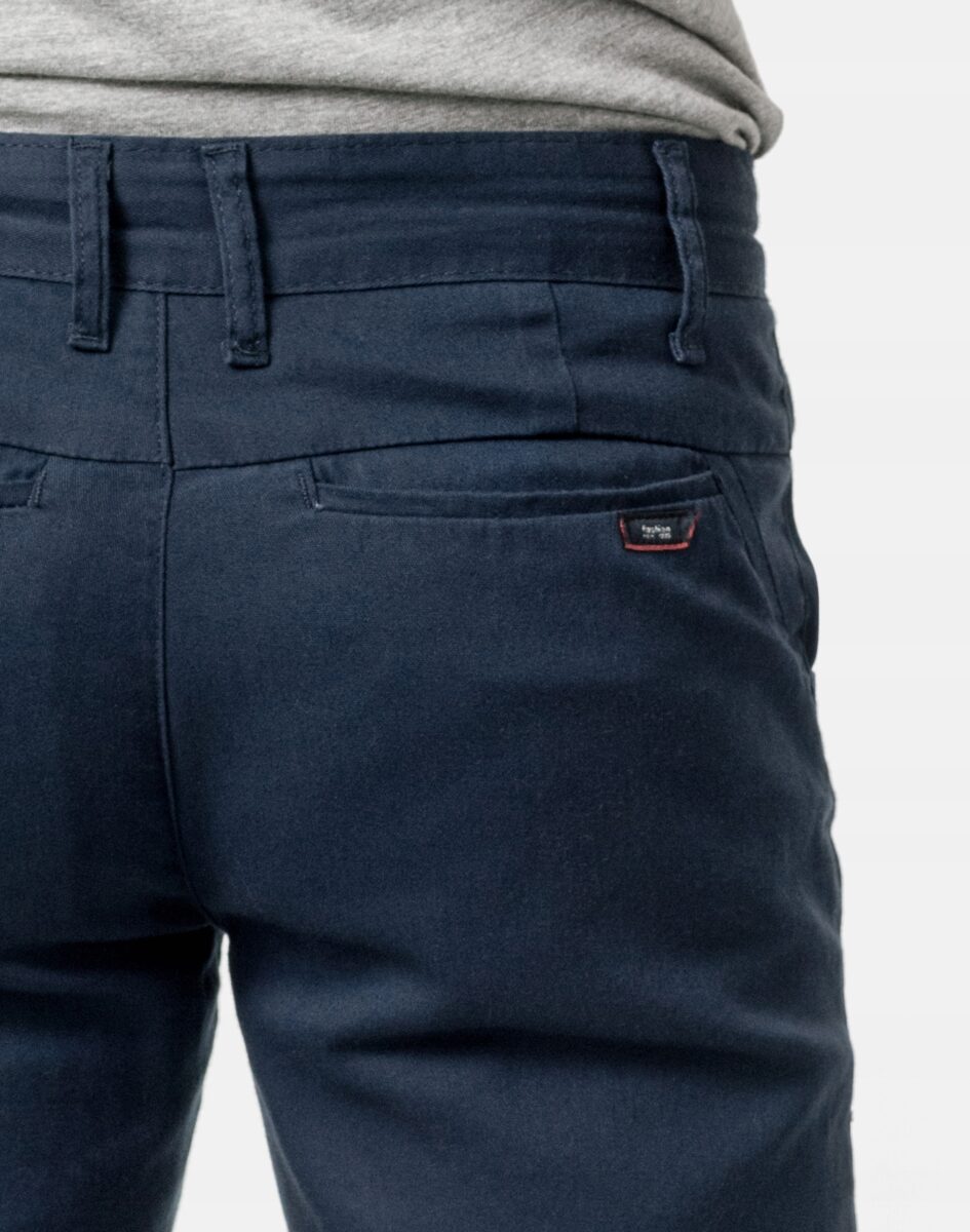Spodnie męskie typu Chino zwane również Chinosami to klasyka wśród klasyki. Uszyte z tkaniny 100% bawełnianej o drobnym zapewniającym dużą wytrzymałość splocie. Zapinane na kryty zamek błyskawiczny i guzik posiadają charakterystyczne dla Chinosów dwie kieszenie na dłonie na bokach spodni i dwie wpuszczane kieszenie z tyłu. W pasie szlufki umożliwiające stylizacje z paskiem. Użyta do produkcji spodni wysokiej jakości tkanina bawełniana jest delikatnie elastyczna co sprawia że spodnie są wyjątkowo wygodne w użytkowaniu. Pozwalają na pełną swobodę ruchów co daje wygodę przy siadaniu i zapewnia ogromny komfort noszenia. Klasyczna lekko zwężana nogawka nie zaprasowana na kant.