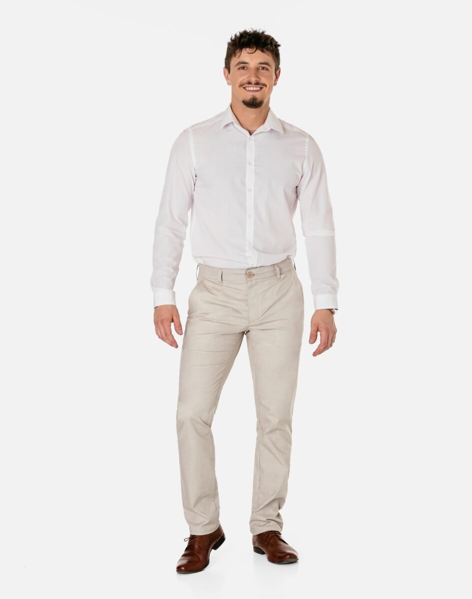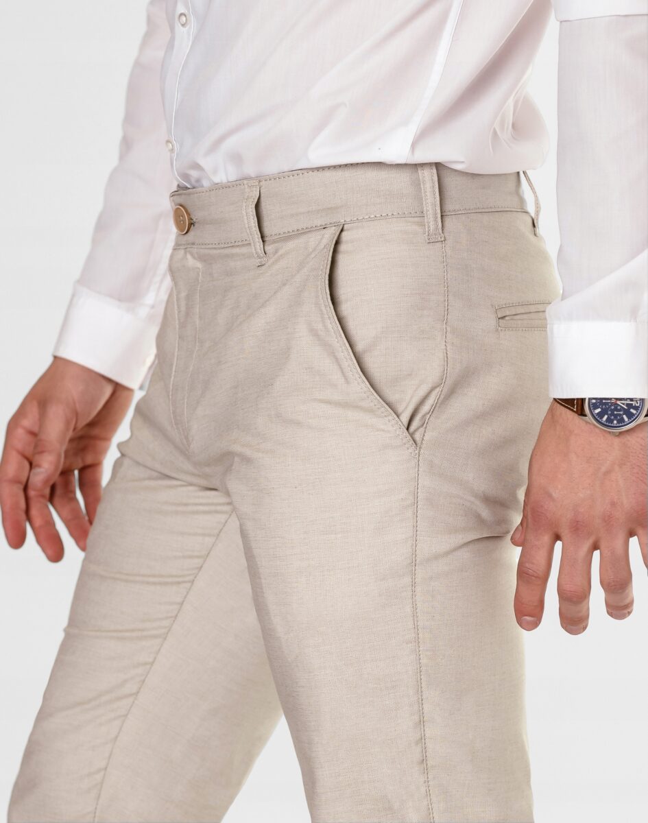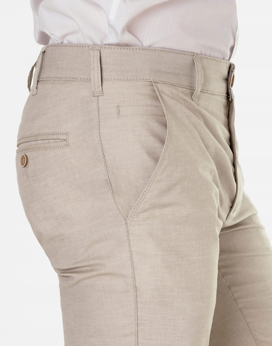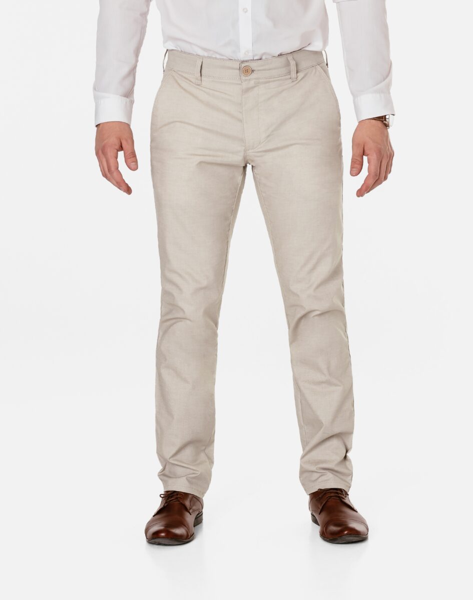 Spodnie męskie polskiej firmy HUNTER typu Chino zwane również Chinosami to klasyka wśród klasyki. Dedykowane są mężczyznom uwielbiającym elegancki i modny wygląd a jednocześnie sportowy charakter. Uszyte z wysokiej jakości, trwałej i mocnej, delikatnie elastycznej tkaniny bawełnianej średniej grubości do złudzenia przypominającej naturalny len. Przewiewne i wygodne, idealne na co dzień jako element casualowego stroju, czyniąc go lekkim i dostosowanym do wysokich temperatur. Niewielki dodatek elastanu (lycra) sprawia, że spodnie są bardziej elastyczne, dobrze dopasowują się do sylwetki, i są bardzo komfortowe w użytkowaniu. Łatwo się je zakłada i są znacznie wygodniejsze od Chinosów, które lycry nie mają. Poza tym bawełna ma tendencję do kurczenia się w praniu, dlatego lycra sprawia, że spodnie są wyjątkowo praktyczne i można je bez problemu założyć po wysuszeniu. Pozwalają na pełną swobodę ruchów, co daje wygodę przy siadaniu i zapewnia ogromny komfort noszenia. Zapinane na kryty zamek błyskawiczny i guzik posiadają charakterystyczne dla Chinosów dwie skośne kieszenie na dłonie na bokach spodni oraz dwie wpuszczane zapinane na guziki kieszenie z tyłu. W pasie szlufki umożliwiające stylizacje z paskiem. Jak w typowych Chinosach nogawka lekko zwężana nie zaprasowana na kant sprawia, że sylwetka wygląda w nich lekko i zgrabnie.