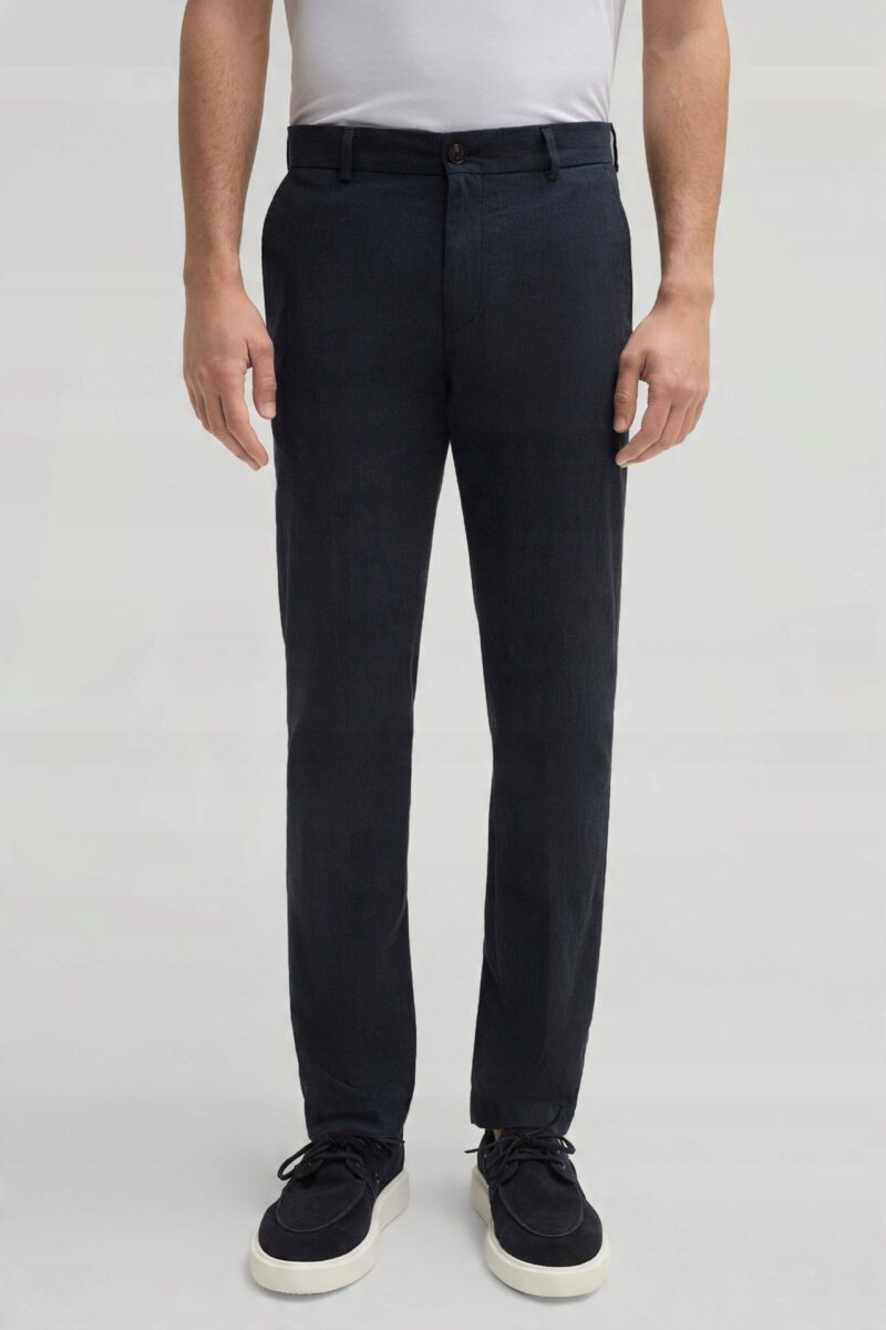 Spodnie męskie typu Chino zwane również Chinosami to klasyka wśród klasyki. Dedykowane są mężczyznom uwielbiającym elegancki i modny wygląd a jednocześnie sportowy charakter. Uszyte z wysokiej jakości, trwałej i mocnej, delikatnie elastycznej tkaniny bawełnianej średniej grubości o drobnym zapewniającym dużą wytrzymałość splocie. Niewielki dodatek spandexu (stretch) sprawia że spodnie są bardziej elastyczne, dobrze dopasowują się do sylwetki, i są bardzo komfortowe w użytkowaniu. Łatwo się je zakłada i są znacznie wygodniejsze od spodni, które lycry nie mają. Domieszka elastanu wystarczy, by nadać spodniom niezwykłych właściwości, odczuwanych przez cały dzień. Przez to, że spandex trudno się gniecie, zapobiega marszczeniu i zwiotczeniu tkaniny i latami może utrzymywać jakość z dnia zakupu, pomagając zadbać o elegancki wizerunek. Zapinane na kryty zamek błyskawiczny i guzik posiadają charakterystyczne dla Chinosów dwie skośne kieszenie na dłonie na bokach spodni oraz dwie wpuszczane kieszenie z tyłu. W pasie szlufki umożliwiające stylizacje z paskiem. Jak w typowych Chinosach nogawka lekko zwężana nie zaprasowana na kant sprawia, że sylwetka wygląda w nich lekko i zgrabnie.