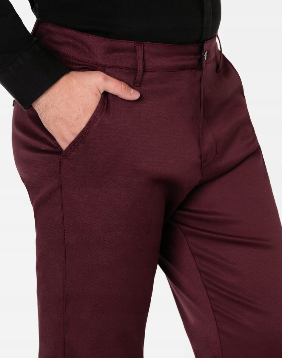 Spodnie męskie model # 11984 typu Chino zwane również Chinosami to klasyka wśród klasyki. Dedykowane są mężczyznom uwielbiającym elegancki i modny wygląd a jednocześnie sportowy charakter. Uszyte z wysokiej jakości, trwałej i mocnej, delikatnie elastycznej tkaniny bawełnianej średniej grubości o drobnym zapewniającym dużą wytrzymałość splocie. Niewielki dodatek elastanu (lycra) sprawia, że spodnie są bardziej elastyczne, dobrze dopasowują się do sylwetki, i są bardzo komfortowe w użytkowaniu. Łatwo się je zakłada i są znacznie wygodniejsze od Chinosów, które lycry nie mają. Poza tym bawełna ma tendencję do kurczenia się w praniu, dlatego lycra sprawia, że spodnie są wyjątkowo praktyczne i można je bez problemu założyć po wysuszeniu. Pozwalają na pełną swobodę ruchów, co daje wygodę przy siadaniu i zapewnia ogromny komfort noszenia. Zapinane na kryty zamek błyskawiczny i guzik z firmowym logo posiadają charakterystyczne dla Chinosów dwie skośne kieszenie na dłonie na bokach spodni, oraz mniejszą tzw. bilonówkę i dwie wpuszczane kieszenie z tyłu. W pasie szlufki umożliwiające stylizacje z paskiem. Jak w typowych Chinosach nogawka lekko zwężana nie zaprasowana na kant sprawia, że sylwetka wygląda w nich lekko i zgrabnie.