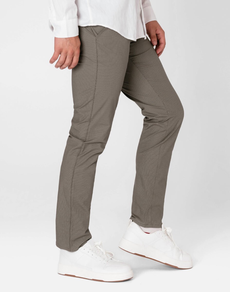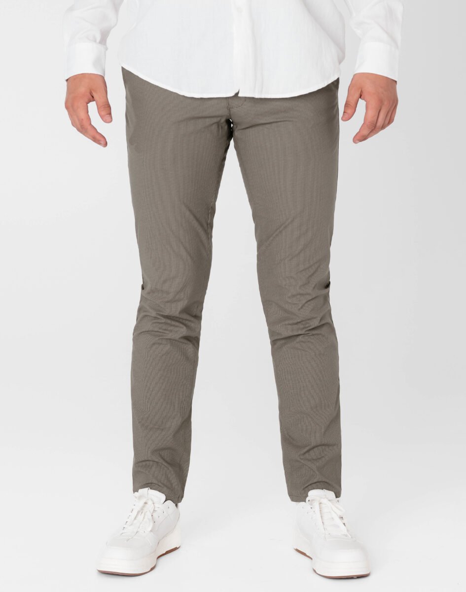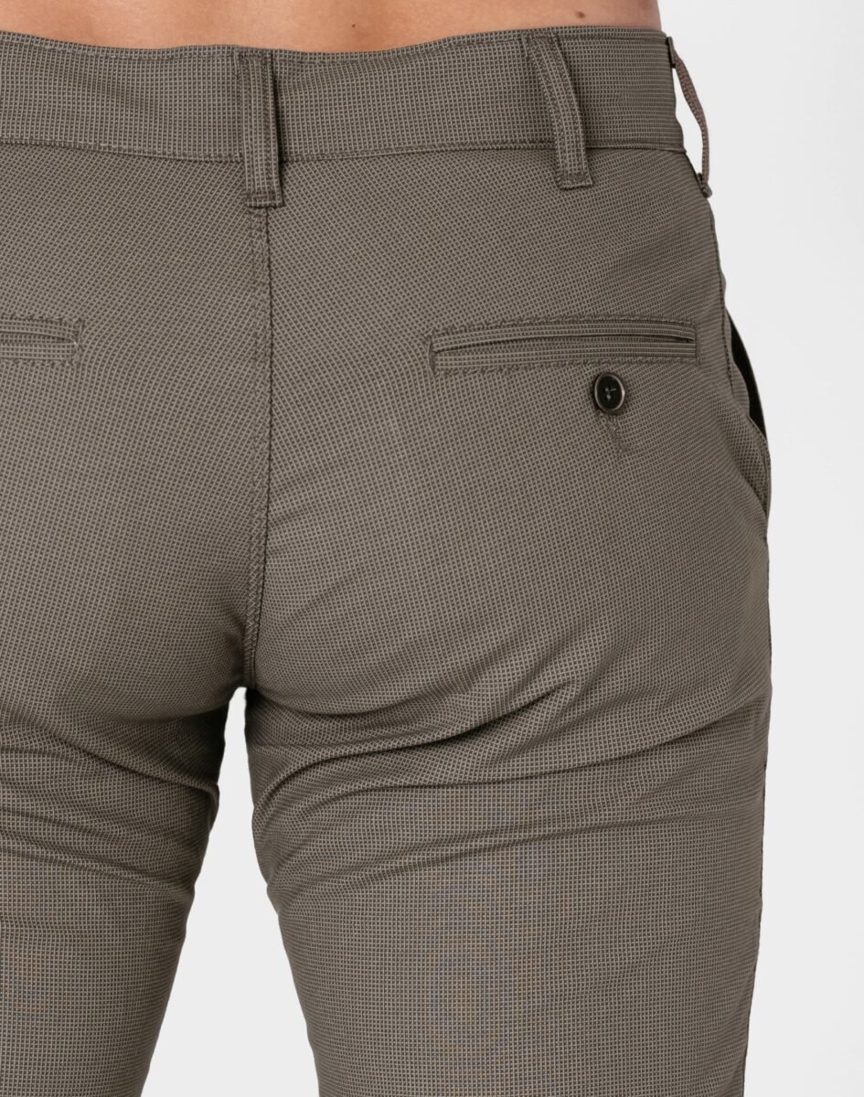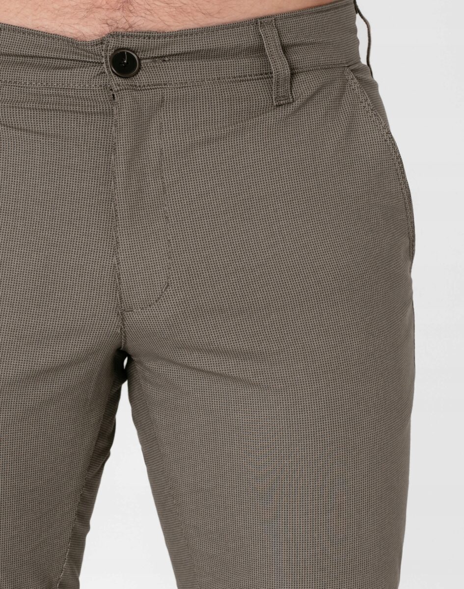 Spodnie męskie typu Chino zwane również Chinosami to klasyka wśród klasyki. Dedykowane są mężczyznom uwielbiającym elegancki i modny wygląd a jednocześnie sportowy charakter. Uszyte z wysokiej jakości, trwałej i mocnej, delikatnie elastycznej tkaniny bawełnianej średniej grubości o drobnym zapewniającym dużą wytrzymałość splocie. Niewielki dodatek spandexu (stretch) sprawia że spodnie są bardziej elastyczne, dobrze dopasowują się do sylwetki, i są bardzo komfortowe w użytkowaniu. Łatwo się je zakłada i są znacznie wygodniejsze od spodni, które lycry nie mają. Domieszka elastanu wystarczy, by nadać spodniom niezwykłych właściwości, odczuwanych przez cały dzień. Przez to, że spandex trudno się gniecie, zapobiega marszczeniu i zwiotczeniu tkaniny i latami może utrzymywać jakość z dnia zakupu, pomagając zadbać o elegancki wizerunek. Zapinane na kryty zamek błyskawiczny i guzik posiadają charakterystyczne dla Chinosów dwie skośne kieszenie na dłonie na bokach spodni oraz dwie wpuszczane kieszenie z tyłu. W pasie szlufki umożliwiające stylizacje z paskiem. Jak w typowych Chinosach nogawka lekko zwężana nie zaprasowana na kant sprawia, że sylwetka wygląda w nich lekko i zgrabnie.