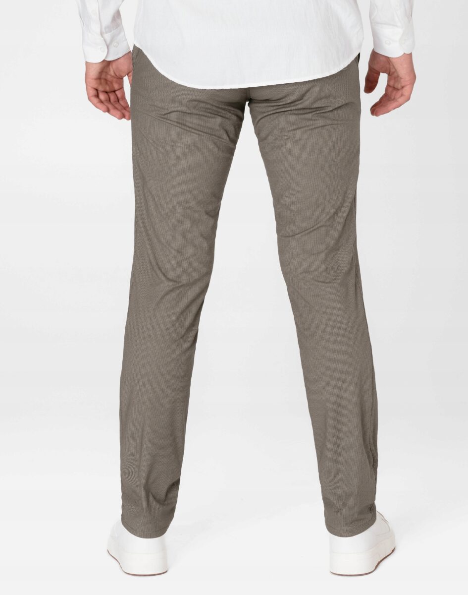 Spodnie męskie typu Chino zwane również Chinosami to klasyka wśród klasyki. Dedykowane są mężczyznom uwielbiającym elegancki i modny wygląd a jednocześnie sportowy charakter. Uszyte z wysokiej jakości, trwałej i mocnej, delikatnie elastycznej tkaniny bawełnianej średniej grubości o drobnym zapewniającym dużą wytrzymałość splocie. Niewielki dodatek spandexu (stretch) sprawia że spodnie są bardziej elastyczne, dobrze dopasowują się do sylwetki, i są bardzo komfortowe w użytkowaniu. Łatwo się je zakłada i są znacznie wygodniejsze od spodni, które lycry nie mają. Domieszka elastanu wystarczy, by nadać spodniom niezwykłych właściwości, odczuwanych przez cały dzień. Przez to, że spandex trudno się gniecie, zapobiega marszczeniu i zwiotczeniu tkaniny i latami może utrzymywać jakość z dnia zakupu, pomagając zadbać o elegancki wizerunek. Zapinane na kryty zamek błyskawiczny i guzik posiadają charakterystyczne dla Chinosów dwie skośne kieszenie na dłonie na bokach spodni oraz dwie  wpuszczane kieszenie z tyłu. W pasie szlufki umożliwiające stylizacje z paskiem. Jak w typowych Chinosach nogawka lekko zwężana nie zaprasowana na kant sprawia, że sylwetka wygląda w nich lekko i zgrabnie.