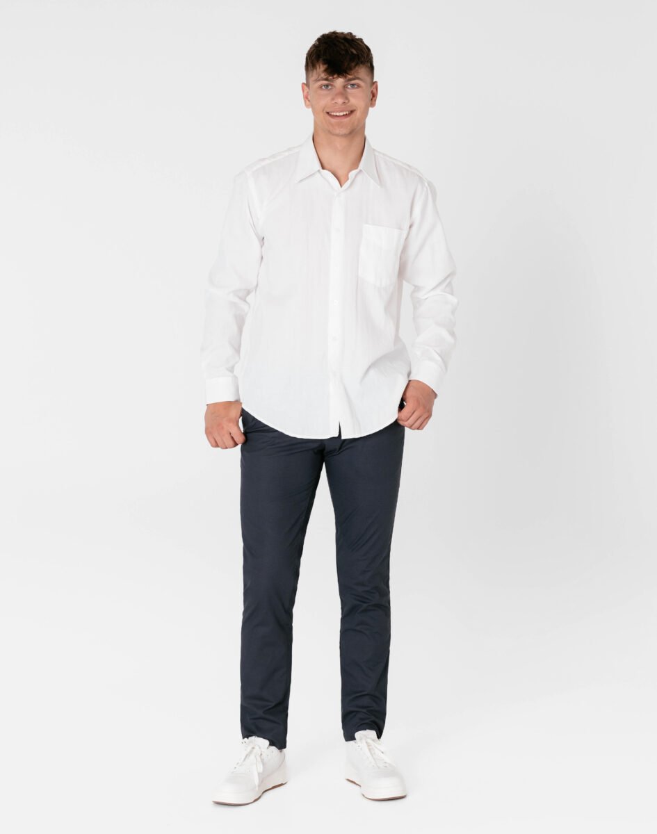 Spodnie męskie typu Chino zwane również Chinosami to klasyka wśród klasyki. Dedykowane są mężczyznom uwielbiającym elegancki i modny wygląd a jednocześnie sportowy charakter. Uszyte z wysokiej jakości, trwałej i mocnej, delikatnie elastycznej tkaniny bawełnianej średniej grubości o drobnym zapewniającym dużą wytrzymałość splocie. Niewielki dodatek spandexu (stretch) sprawia że spodnie są bardziej elastyczne, dobrze dopasowują się do sylwetki, i są bardzo komfortowe w użytkowaniu. Łatwo się je zakłada i są znacznie wygodniejsze od spodni, które lycry nie mają. Domieszka elastanu wystarczy, by nadać spodniom niezwykłych właściwości, odczuwanych przez cały dzień. Przez to, że spandex trudno się gniecie, zapobiega marszczeniu i zwiotczeniu tkaniny i latami może utrzymywać jakość z dnia zakupu, pomagając zadbać o elegancki wizerunek. Zapinane na kryty zamek błyskawiczny i guzik posiadają charakterystyczne dla Chinosów dwie skośne kieszenie na dłonie na bokach spodni oraz dwie wpuszczane kieszenie z tyłu. W pasie szlufki umożliwiające stylizacje z paskiem. Jak w typowych Chinosach nogawka lekko zwężana nie zaprasowana na kant sprawia, że sylwetka wygląda w nich lekko i zgrabnie.
