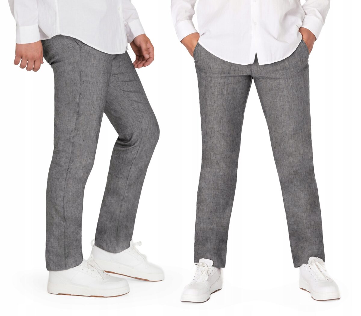 Spodnie męskie typu Chino zwane również Chinosami to klasyka wśród klasyki. Dedykowane są mężczyznom uwielbiającym elegancki i modny wygląd a jednocześnie sportowy charakter. Uszyte z wysokiej jakości, trwałej i mocnej, delikatnie elastycznej tkaniny bawełnianej średniej grubości o drobnym zapewniającym dużą wytrzymałość splocie. Niewielki dodatek elastanu (stretch) sprawia że spodnie są bardziej elastyczne, dobrze dopasowują się do sylwetki, i są bardzo komfortowe w użytkowaniu. Łatwo się je zakłada i są znacznie wygodniejsze od spodni, które lycry nie mają. Domieszka elastanu wystarczy, by nadać spodniom niezwykłych właściwości, odczuwanych przez cały dzień. Przez to, że elastan trudno się gniecie, zapobiega marszczeniu i zwiotczeniu tkaniny i latami może utrzymywać jakość z dnia zakupu, pomagając zadbać o elegancki wizerunek. Zapinane na kryty zamek błyskawiczny i guzik posiadają charakterystyczne dla Chinosów dwie skośne kieszenie na dłonie na bokach spodni oraz dwie wpuszczane kieszenie z tyłu. W pasie szlufki umożliwiające stylizacje z paskiem. Jak w typowych Chinosach nogawka lekko zwężana nie zaprasowana na kant sprawia, że sylwetka wygląda w nich lekko i zgrabnie.