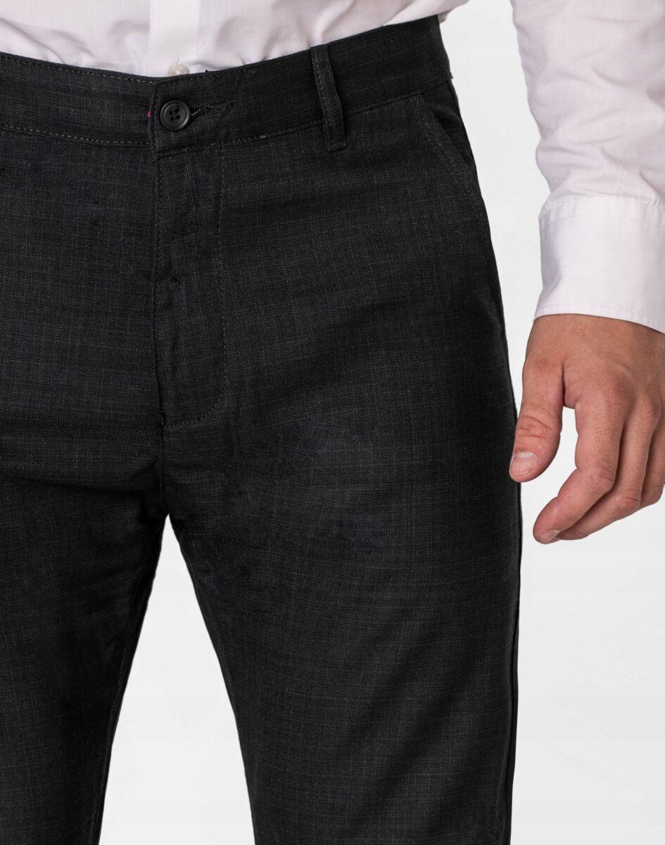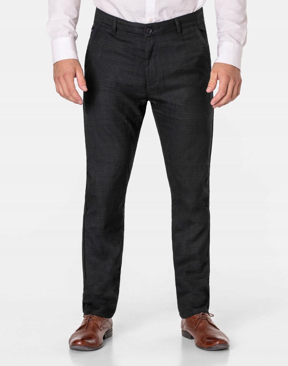 Spodnie męskie typu Chino zwane również Chinosami to klasyka wśród klasyki. Dedykowane są mężczyznom uwielbiającym elegancki i modny wygląd a jednocześnie sportowy charakter. Uszyte z wysokiej jakości, trwałej i mocnej, delikatnie elastycznej tkaniny bawełnianej średniej grubości o drobnym zapewniającym dużą wytrzymałość splocie. Niewielki dodatek poliestru (lycra) sprawia, że spodnie są bardziej elastyczne, dobrze dopasowują się do sylwetki, i są bardzo komfortowe w użytkowaniu. Łatwo się je zakłada i są znacznie wygodniejsze od Chinosów, które lycry nie mają. Poza tym bawełna ma tendencję do kurczenia się w praniu, dlatego lycra sprawia, że spodnie są wyjątkowo praktyczne i można je bez problemu założyć po wysuszeniu. Pozwalają na pełną swobodę ruchów, co daje wygodę przy siadaniu i zapewnia ogromny komfort noszenia. Zapinane na kryty zamek błyskawiczny i guzik posiadają charakterystyczne dla Chinosów dwie skośne kieszenie na dłonie na bokach spodni oraz jedną mniejszą tzw. bilonówkę, dwie wpuszczane zapinane na guziki kieszenie z tyłu. W pasie szlufki umożliwiające stylizacje z paskiem. Jak w typowych Chinosach nogawka lekko zwężana nie zaprasowana na kant sprawia, że sylwetka wygląda w nich lekko i zgrabnie.
