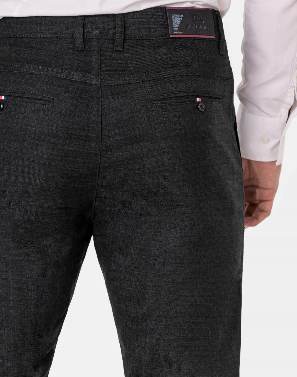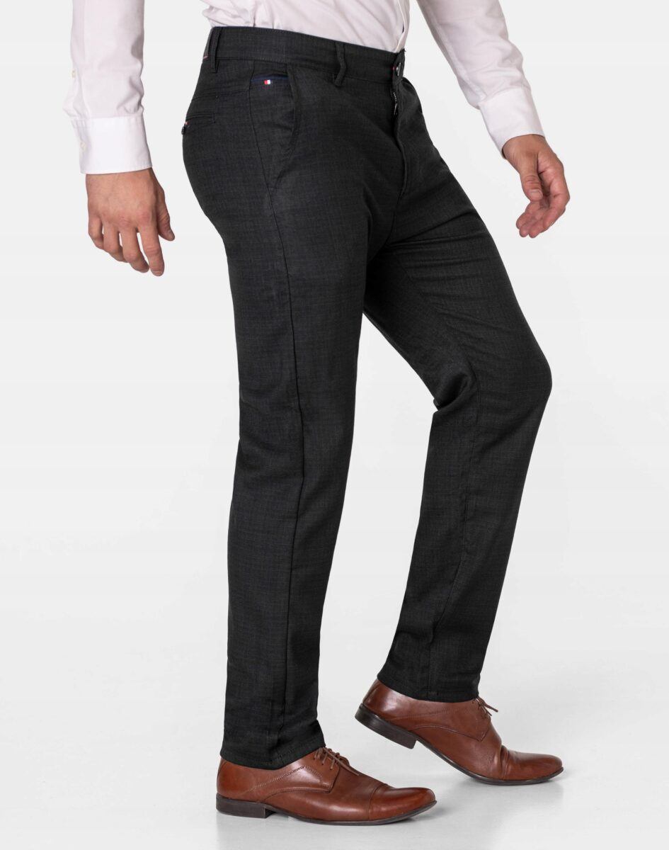 Spodnie męskie typu Chino zwane również Chinosami to klasyka wśród klasyki. Dedykowane są mężczyznom uwielbiającym elegancki i modny wygląd a jednocześnie sportowy charakter. Uszyte z wysokiej jakości, trwałej i mocnej, delikatnie elastycznej tkaniny bawełnianej średniej grubości o drobnym zapewniającym dużą wytrzymałość splocie. Niewielki dodatek poliestru (lycra) sprawia, że spodnie są bardziej elastyczne, dobrze dopasowują się do sylwetki, i są bardzo komfortowe w użytkowaniu. Łatwo się je zakłada i są znacznie wygodniejsze od Chinosów, które lycry nie mają. Poza tym bawełna ma tendencję do kurczenia się w praniu, dlatego lycra sprawia, że spodnie są wyjątkowo praktyczne i można je bez problemu założyć po wysuszeniu. Pozwalają na pełną swobodę ruchów, co daje wygodę przy siadaniu i zapewnia ogromny komfort noszenia. Zapinane na kryty zamek błyskawiczny i guzik posiadają charakterystyczne dla Chinosów dwie skośne kieszenie na dłonie na bokach spodni oraz jedną mniejszą tzw. bilonówkę, dwie wpuszczane zapinane na guziki kieszenie z tyłu. W pasie szlufki umożliwiające stylizacje z paskiem. Jak w typowych Chinosach nogawka lekko zwężana nie zaprasowana na kant sprawia, że sylwetka wygląda w nich lekko i zgrabnie.