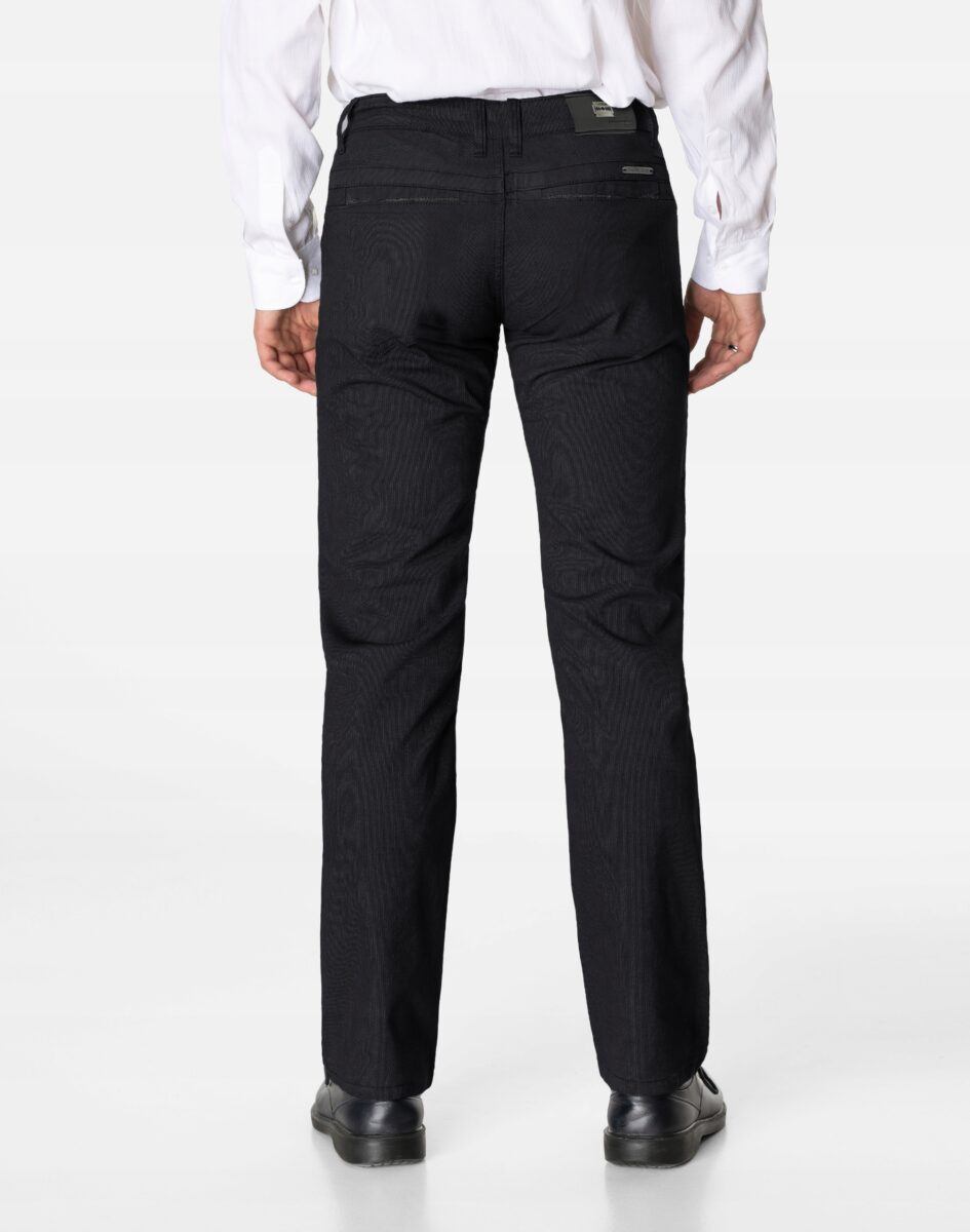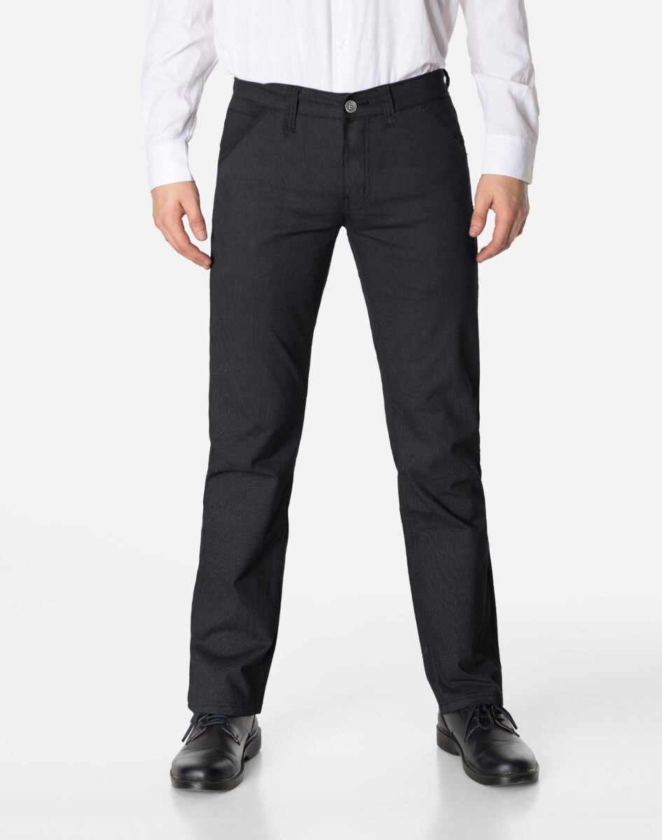 Spodnie męskie typu Chino zwane również Chinosami to klasyka wśród klasyki. Dedykowane są mężczyznom uwielbiającym elegancki i modny wygląd a jednocześnie sportowy charakter. Uszyte z wysokiej jakości, trwałej i mocnej, delikatnie elastycznej tkaniny bawełnianej średniej grubości o drobnym zapewniającym dużą wytrzymałość splocie. Niewielki dodatek spandexu (lycra) sprawia, że spodnie są bardziej elastyczne, dobrze dopasowują się do sylwetki, i są bardzo komfortowe w użytkowaniu. Łatwo się je zakłada i są znacznie wygodniejsze od Chinosów, które lycry nie mają. Poza tym bawełna ma tendencję do kurczenia się w praniu, dlatego lycra sprawia, że spodnie są wyjątkowo praktyczne i można je bez problemu założyć po wysuszeniu. Pozwalają na pełną swobodę ruchów, co daje wygodę przy siadaniu i zapewnia ogromny komfort noszenia. Zapinane na kryty zamek błyskawiczny i guzik posiadają charakterystyczne dla Chinosów dwie skośne kieszenie na dłonie na bokach spodni oraz jedną mniejszą tzw. bilonówkę, dwie wpuszczane zapinane na guziki kieszenie z tyłu. W pasie szlufki umożliwiające stylizacje z paskiem. Nogawka klasyczna, prosta nie zaprasowana na kant sprawia, że sylwetka wygląda w ich lekko i zgrabnie.