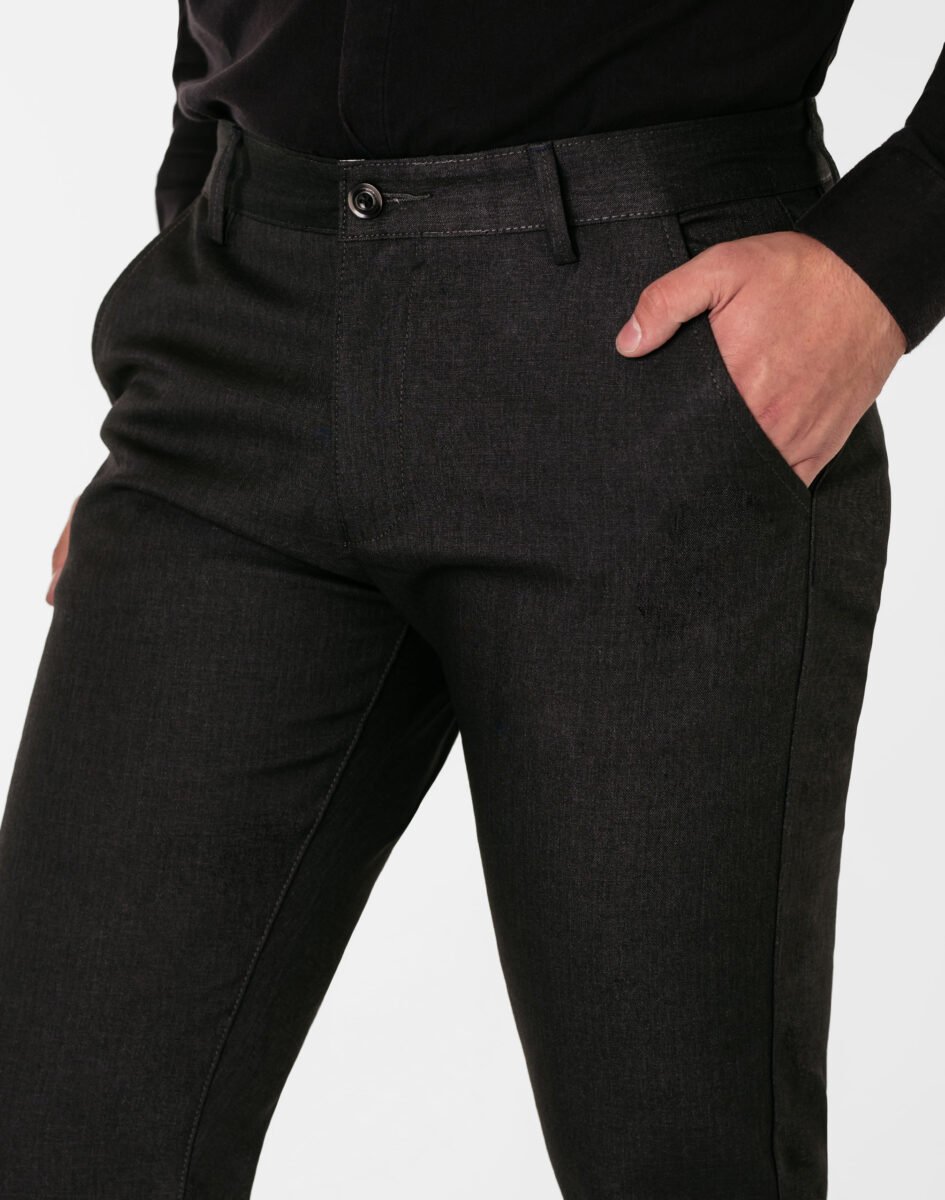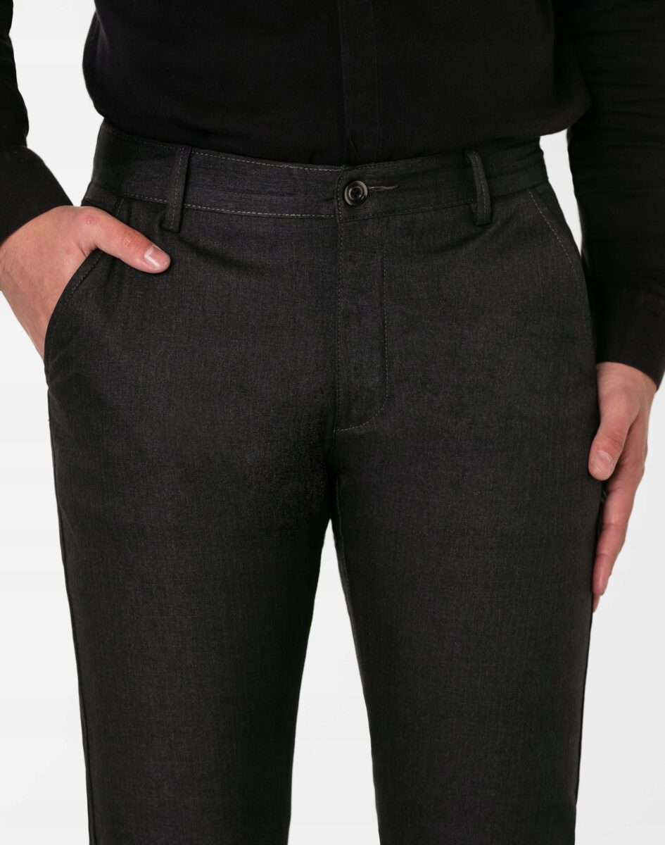 Spodnie męskie model # QC10A typu Chino zwane również Chinosami to klasyka wśród klasyki. Dedykowane są mężczyznom uwielbiającym elegancki i modny wygląd a jednocześnie sportowy charakter. Uszyte z wysokiej jakości, trwałej i mocnej, delikatnie elastycznej tkaniny spodniowej średniej grubości o drobnym zapewniającym dużą wytrzymałość splocie. Niewielki dodatek spandexu (lycra) sprawia, że spodnie są bardziej elastyczne, dobrze dopasowują się do sylwetki, i są bardzo komfortowe w użytkowaniu. Łatwo się je zakłada i są znacznie wygodniejsze od Chinosów, które lycry nie mają. Pozwalają na pełną swobodę ruchów, co daje wygodę przy siadaniu i zapewnia ogromny komfort noszenia. Zapinane na kryty zamek błyskawiczny oraz guzik posiadają charakterystyczne dla Chinosów dwie skośne kieszenie na dłonie na bokach spodni, oraz mniejszą tzw. bilonówkę i dwie wpuszczane kieszenie z tyłu. W pasie szlufki umożliwiające stylizacje z paskiem. Jak w typowych Chinosach nogawka lekko zwężana nie zaprasowana na kant sprawia, że sylwetka wygląda w nich lekko i zgrabnie.