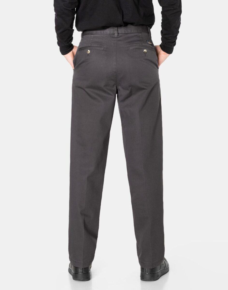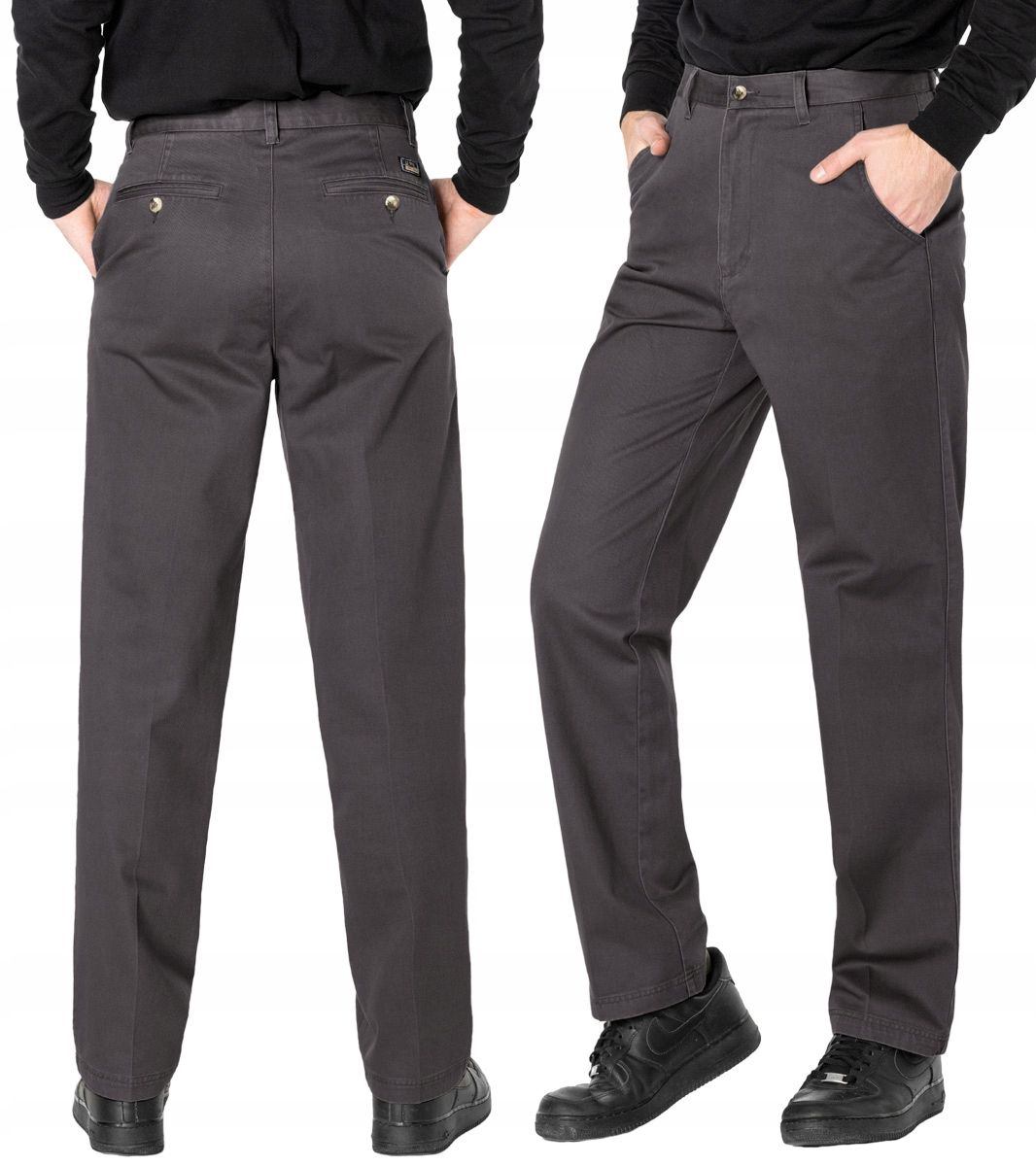Spodnie męskie 100% bawełniane ze standardowym stanem i klasyczną prostą nogawką to klasyka wśród klasyki i jeden z najczęściej wybieranych modeli spodni. Wykonane z wysokiej jakości trwałej i mocnej tkaniny bawełnianej o drobnym, gęstym, zapewniającym dużą wytrzymałość splocie i jednolitym wybarwieniu. Zapinane na kryty zamek błyskawiczny i guzik posiadają charakterystyczne dwie skośne kieszenie na dłonie na bokach spodni i dwie wpuszczane kieszenie z tyłu zapinane na guziki. W pasie szlufki umożliwiające stylizacje z paskiem. Użyta do produkcji spodni wysokiej jakości tkanina bawełniana jest delikatnie elastyczna co sprawia że spodnie są wyjątkowo wygodne w użytkowaniu, pozwalają na pełną swobodę ruchów co daje wygodę przy siadaniu i zapewnia ogromny komfort noszenia. Najbardziej podatne na uszkodzenia miejsca wzmocnione są dodatkowymi przeszyciami.