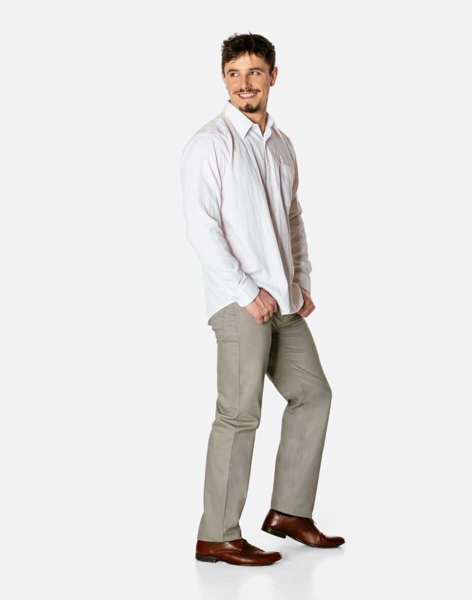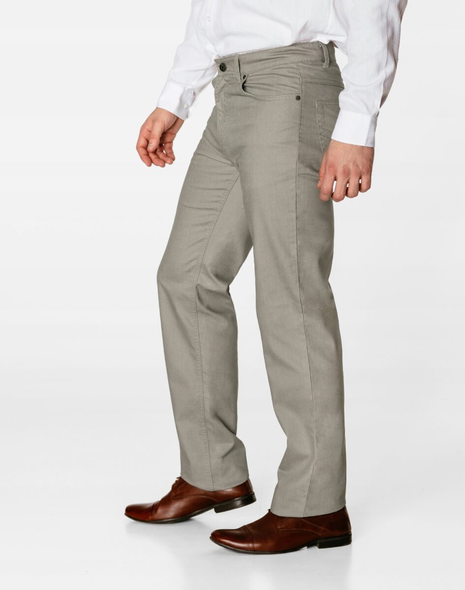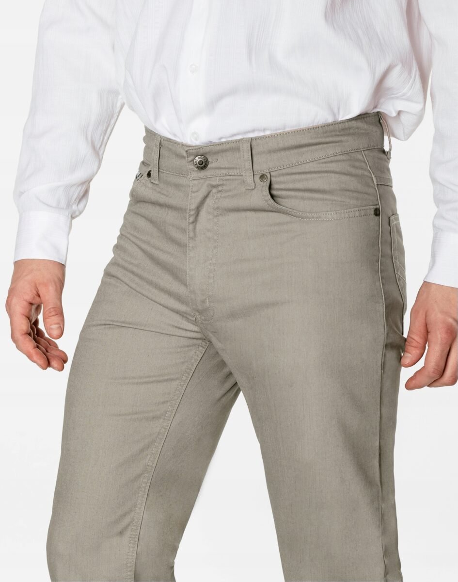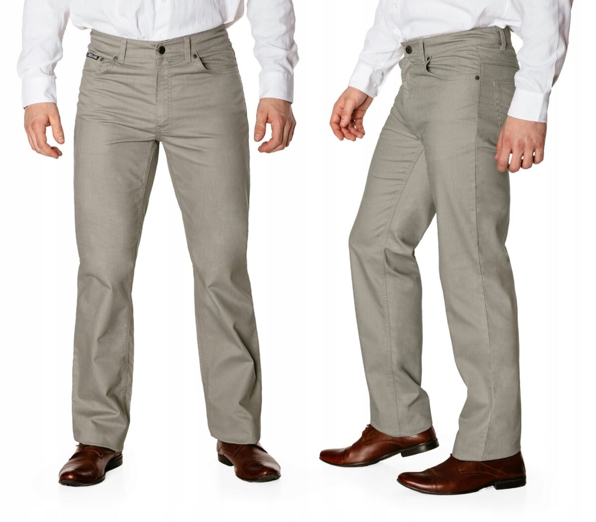 Klasyczne i ponadczasowe spodnie męskie bawełniane, umiarkowanie swobodne w biodrach, o prostych, smukłych nogawkach to jeden z najczęściej wybieranych przez mężczyzn modeli spodni. Wykonane z wysokiej jakości trwałej i mocnej tkaniny 100% bawełnianej o drobnym, gęstym splocie i eleganckim beżowo-szarym wybarwieniu, wyjątkowo wygodnej w użytkowaniu. Zapinane na kryty zamek błyskawiczny i metalowy guzik sygnowany logiem firmy. Z przodu mają dwie zaokrąglone kieszonki oraz jedną mniejszą tzw. bilonówkę, a na tyle klasyczne naszywane kieszenie jak w typowych spodniach jeansowych. Najbardziej podatne na uszkodzenia miejsca wzmocnione są podwójnymi przeszyciami oraz metalowymi nitami. W pasie szlufki umożliwiające eleganckie stylizacje z paskiem.