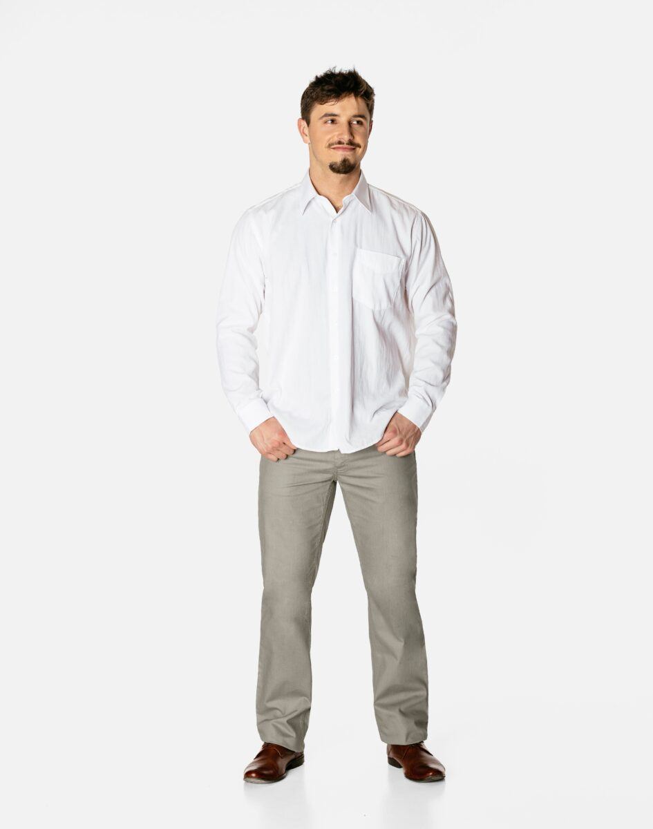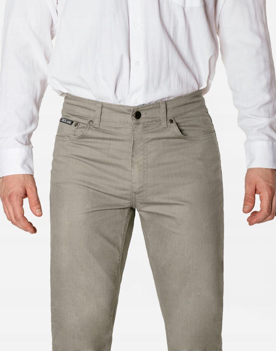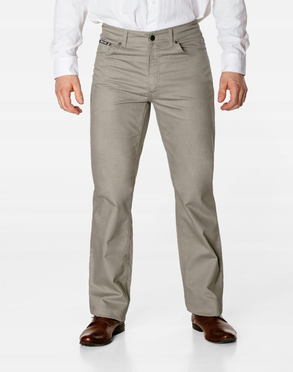 Klasyczne i ponadczasowe spodnie męskie bawełniane, umiarkowanie swobodne w biodrach, o prostych, smukłych nogawkach to jeden z najczęściej wybieranych przez mężczyzn modeli spodni. Wykonane z wysokiej jakości trwałej i mocnej tkaniny 100% bawełnianej o drobnym, gęstym splocie i eleganckim beżowo-szarym wybarwieniu, wyjątkowo wygodnej w użytkowaniu. Zapinane na kryty zamek błyskawiczny i metalowy guzik sygnowany logiem firmy. Z przodu mają dwie zaokrąglone kieszonki oraz jedną mniejszą tzw. bilonówkę, a na tyle klasyczne naszywane kieszenie jak w typowych spodniach jeansowych. Najbardziej podatne na uszkodzenia miejsca wzmocnione są podwójnymi przeszyciami oraz metalowymi nitami. W pasie szlufki umożliwiające eleganckie stylizacje z paskiem.