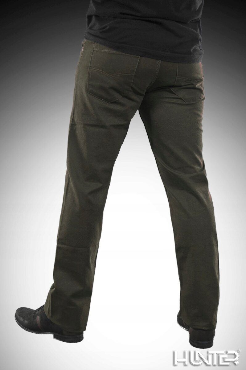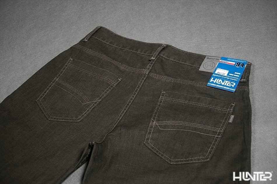 Spodnie męskie bawełniane polskiej firmy HUNTER ze standardowym stanem i klasyczną lekko zwężaną nogawką to jeden z najczęściej wybieranych modeli spodni. Wykonane z wysokiej jakości trwałej i mocnej tkaniny bawełnianej o drobnym, gęstym splocie i jednolitym wybarwieniu. Zapinane są na kryty zamek błyskawiczny i metalowy guzik sygnowany logiem firmy. Z przodu mają dwie kieszonki zaokrąglone oraz mniejszą kieszonkę tzw. bilonówkę, a na tyle klasyczne kieszenie naszywane jak w typowych spodniach jeansowych. W pasie szlufki umożliwiające stylizacje z paskiem. Najbardziej podatne na uszkodzenia miejsca wzmocnione są dodatkowymi przeszyciami oraz nitami.