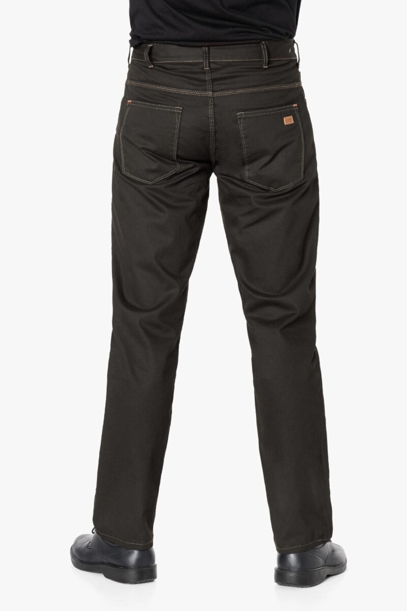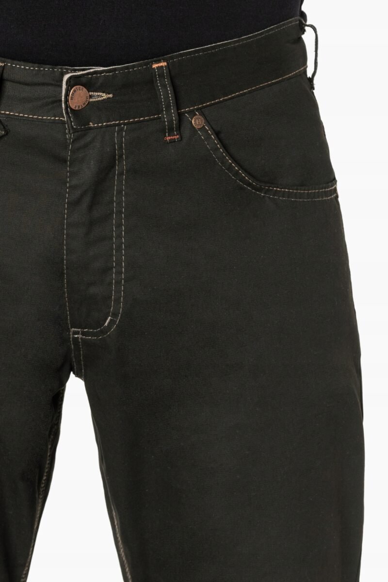 - Kieszenie: dwie wpuszczane kieszenie z przodu oraz bilonówka, dwie naszywane kieszenie z tyłu spodni