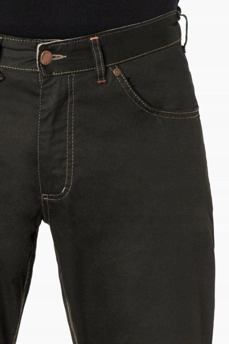 Niesłychanie wygodne i praktyczne podczas użytkowania spodnie męskie bawełniane polskiej firmy HUNTER ze standardowym stanem i klasyczną lekko zwężaną nogawką to jeden z najczęściej wybieranych modeli spodni. Wykonane z wysokiej jakości trwałej i mocnej tkaniny bawełnianej o gęstym, drobnym splocie i jednolitym wybarwieniu. Zapinane są na kryty zamek błyskawiczny i metalowy guzik sygnowany logiem firmy. Z przodu mają dwie kieszonki zaokrąglone oraz mniejszą kieszonkę tzw. bilonówkę, a na tyle klasyczne kieszenie naszywane jak w typowych spodniach jeansowych. W pasie szlufki umożliwiające stylizacje z paskiem. Najbardziej podatne na uszkodzenia miejsca wzmocnione są dodatkowymi przeszyciami oraz nitami.