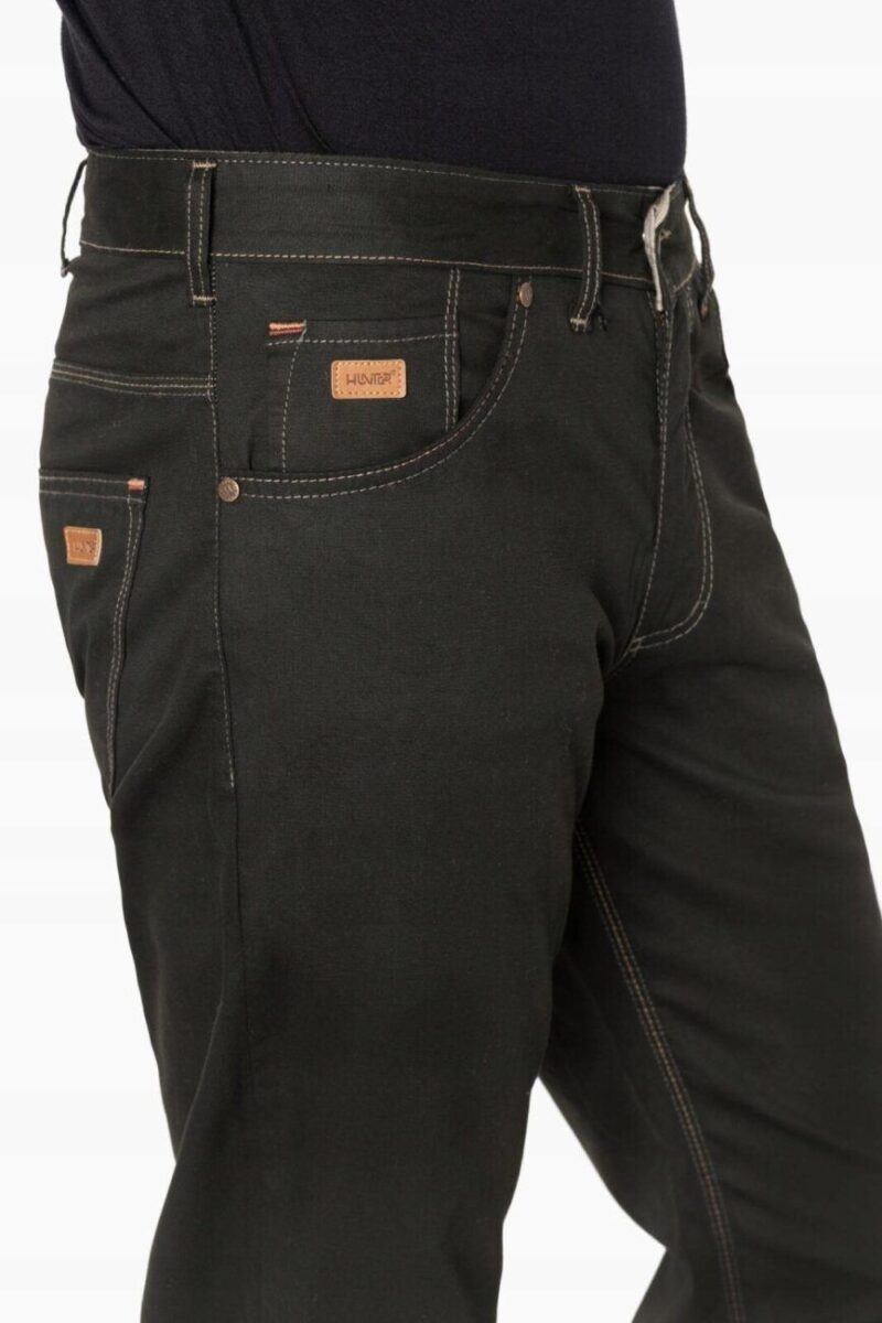 Niesłychanie wygodne i praktyczne podczas użytkowania spodnie męskie bawełniane polskiej firmy HUNTER ze standardowym stanem i klasyczną lekko zwężaną nogawką to jeden z najczęściej wybieranych modeli spodni. Wykonane z wysokiej jakości trwałej i mocnej tkaniny bawełnianej o gęstym, drobnym splocie i jednolitym wybarwieniu. Zapinane są na kryty zamek błyskawiczny i metalowy guzik sygnowany logiem firmy. Z przodu mają dwie kieszonki zaokrąglone oraz mniejszą kieszonkę tzw. bilonówkę, a na tyle klasyczne kieszenie naszywane jak w typowych spodniach jeansowych. W pasie szlufki umożliwiające stylizacje z paskiem. Najbardziej podatne na uszkodzenia miejsca wzmocnione są dodatkowymi przeszyciami oraz nitami.