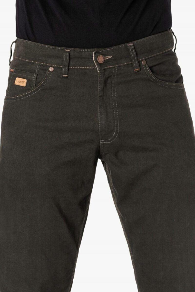 Niesłychanie wygodne i praktyczne podczas użytkowania spodnie męskie bawełniane polskiej firmy HUNTER ze standardowym stanem i klasyczną lekko zwężaną nogawką to jeden z najczęściej wybieranych modeli spodni. Wykonane z wysokiej jakości trwałej i mocnej tkaniny bawełnianej o gęstym, drobnym splocie i jednolitym wybarwieniu. Zapinane są na kryty zamek błyskawiczny i metalowy guzik sygnowany logiem firmy. Z przodu mają dwie kieszonki zaokrąglone oraz mniejszą kieszonkę tzw. bilonówkę, a na tyle klasyczne kieszenie naszywane jak w typowych spodniach jeansowych. W pasie szlufki umożliwiające stylizacje z paskiem. Najbardziej podatne na uszkodzenia miejsca wzmocnione są dodatkowymi przeszyciami oraz nitami.
