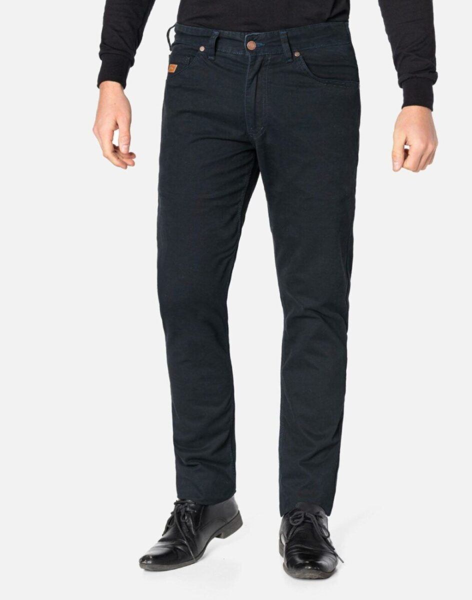 Niesłychanie wygodne i praktyczne podczas użytkowania spodnie męskie bawełniane polskiej firmy HUNTER ze standardowym stanem i klasyczną lekko zwężaną nogawką to jeden z najczęściej wybieranych modeli spodni. Wykonane z wysokiej jakości trwałej i mocnej tkaniny bawełnianej z niewielkim dodatkiem elastanu (strecz) o gęstym, drobnym splocie i jednolitym ciemnym granatowym wybarwieniu „Midnight Blue”. Niewielki dodatek elastanu sprawia, że spodnie są bardziej elastyczne co pozwala na pełną swobodę ruchów, daje komfort przy siadaniu i zapewnia ogromny komfort noszenia. Zapinane są na kryty zamek błyskawiczny i metalowy guzik sygnowany logiem firmy. Z przodu mają dwie kieszonki zaokrąglone oraz mniejszą kieszonkę tzw. bilonówkę, a na tyle klasyczne kieszenie naszywane jak w typowych spodniach jeansowych. W pasie szlufki umożliwiające stylizacje z paskiem. Najbardziej podatne na uszkodzenia miejsca wzmocnione są dodatkowymi przeszyciami oraz nitami.
