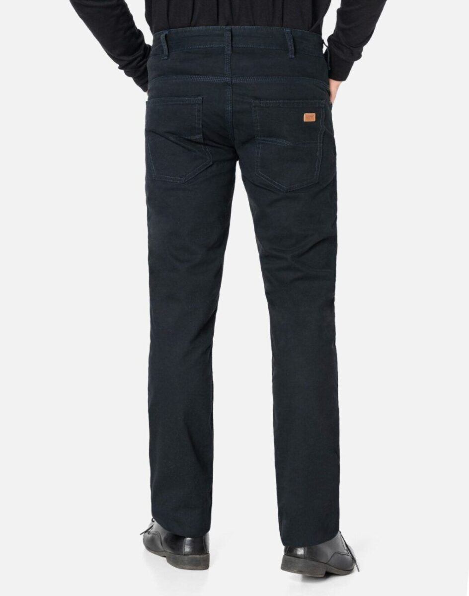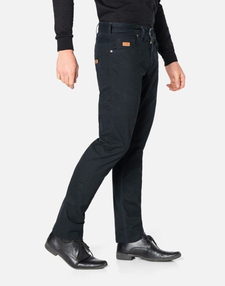 Niesłychanie wygodne i praktyczne podczas użytkowania spodnie męskie bawełniane polskiej firmy HUNTER ze standardowym stanem i klasyczną lekko zwężaną nogawką to jeden z najczęściej wybieranych modeli spodni. Wykonane z wysokiej jakości trwałej i mocnej tkaniny bawełnianej z niewielkim dodatkiem elastanu (strecz) o gęstym, drobnym splocie i jednolitym ciemnym granatowym wybarwieniu „Midnight Blue”. Niewielki dodatek elastanu sprawia, że spodnie są bardziej elastyczne co pozwala na pełną swobodę ruchów, daje komfort przy siadaniu i zapewnia ogromny komfort noszenia. Zapinane są na kryty zamek błyskawiczny i metalowy guzik sygnowany logiem firmy. Z przodu mają dwie kieszonki zaokrąglone oraz mniejszą kieszonkę tzw. bilonówkę, a na tyle klasyczne kieszenie naszywane jak w typowych spodniach jeansowych. W pasie szlufki umożliwiające stylizacje z paskiem. Najbardziej podatne na uszkodzenia miejsca wzmocnione są dodatkowymi przeszyciami oraz nitami.