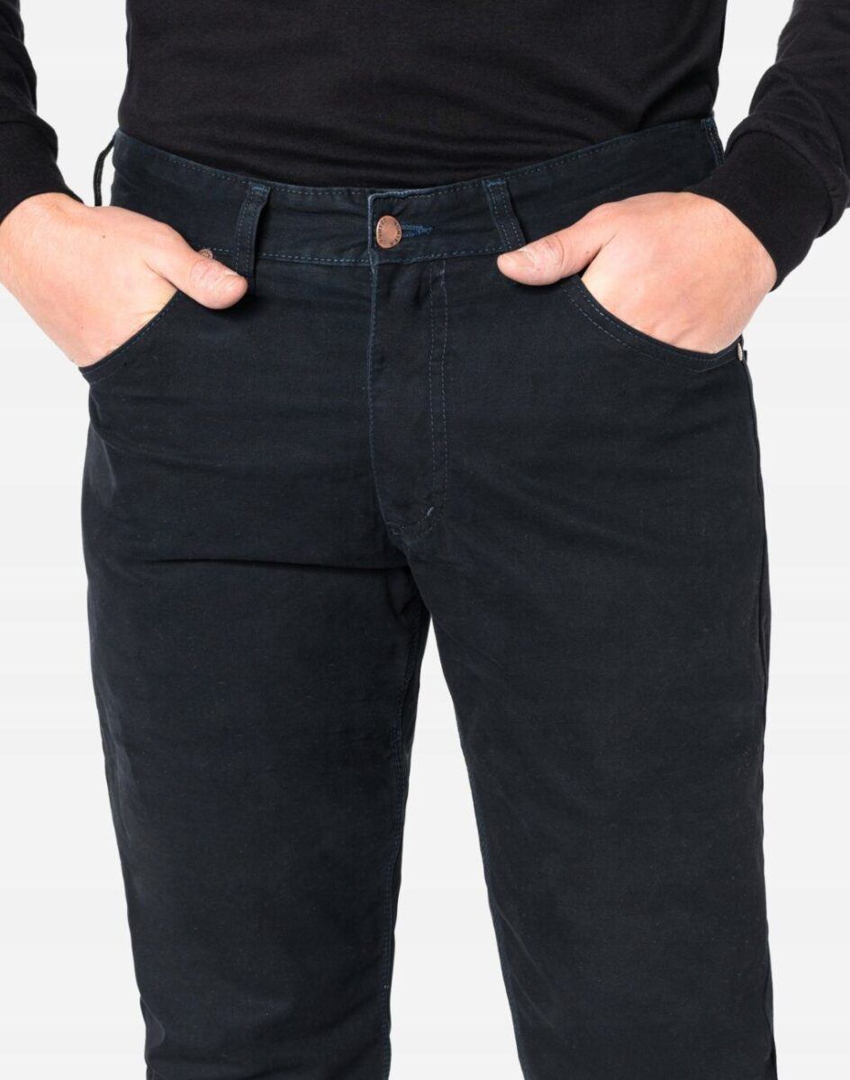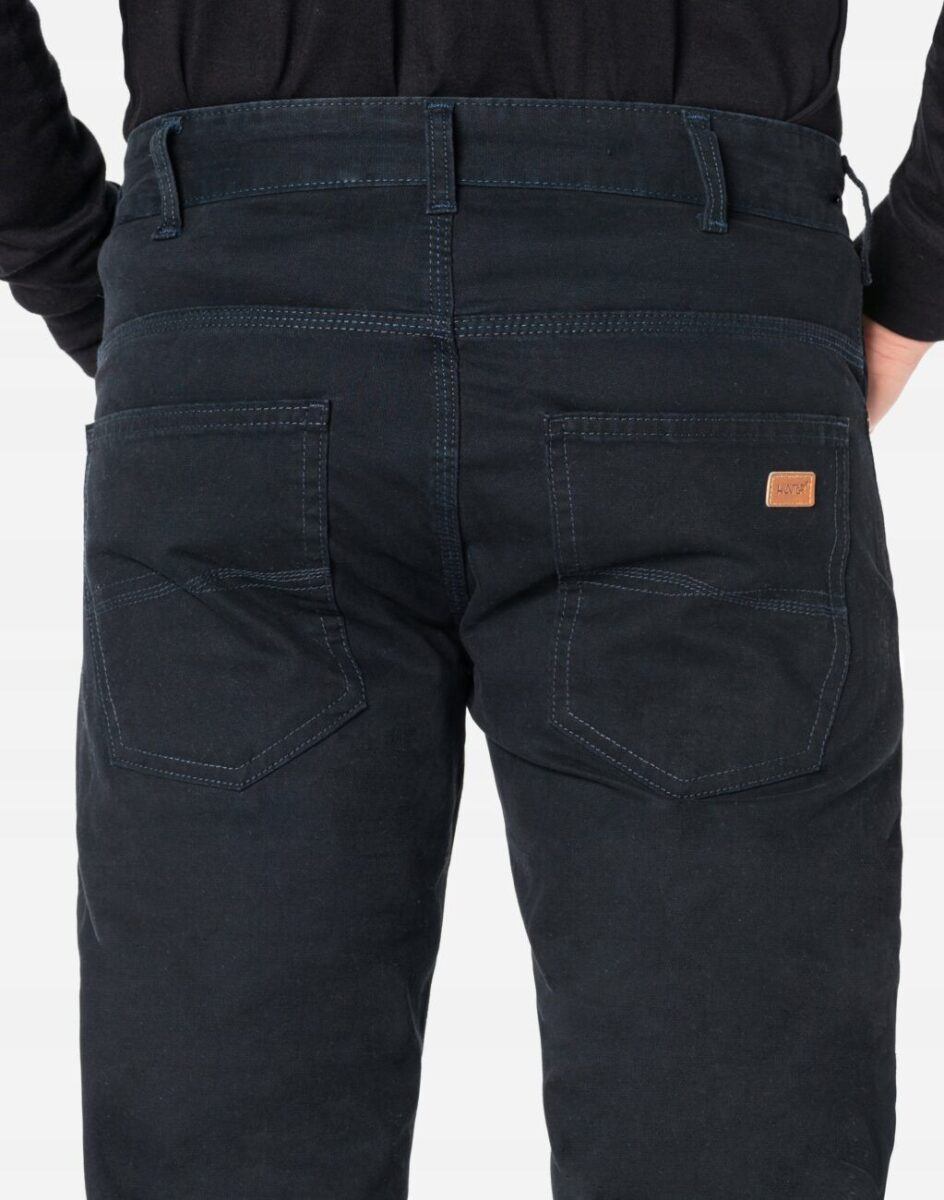 Niesłychanie wygodne i praktyczne podczas użytkowania spodnie męskie bawełniane polskiej firmy HUNTER ze standardowym stanem i klasyczną lekko zwężaną nogawką to jeden z najczęściej wybieranych modeli spodni. Wykonane z wysokiej jakości trwałej i mocnej tkaniny bawełnianej z niewielkim dodatkiem elastanu (strecz) o gęstym, drobnym splocie i jednolitym ciemnym granatowym wybarwieniu „Midnight Blue”. Niewielki dodatek elastanu sprawia, że spodnie są bardziej elastyczne co pozwala na pełną swobodę ruchów, daje komfort przy siadaniu i zapewnia ogromny komfort noszenia. Zapinane są na kryty zamek błyskawiczny i metalowy guzik sygnowany logiem firmy. Z przodu mają dwie kieszonki zaokrąglone oraz mniejszą kieszonkę tzw. bilonówkę, a na tyle klasyczne kieszenie naszywane jak w typowych spodniach jeansowych. W pasie szlufki umożliwiające stylizacje z paskiem. Najbardziej podatne na uszkodzenia miejsca wzmocnione są dodatkowymi przeszyciami oraz nitami.