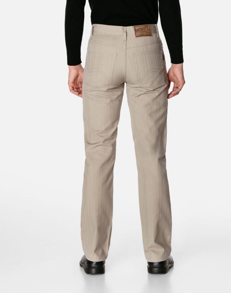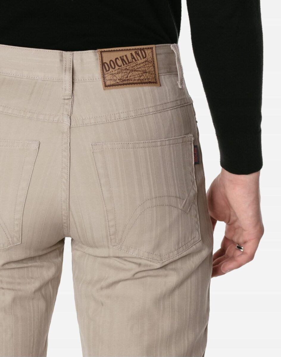 Wygodne i praktyczne podczas użytkowania spodnie męskie bawełniane ze standardowym stanem i klasyczną prostą nogawką to jeden z najczęściej wybieranych obecnie modeli spodni. Wykonane z wysokiej jakości trwałej i mocnej tkaniny bawełnianej średniej grubości o gęstym, drobnym splocie i jednolitym wybarwieniu w drobny prążek. Zapinane są na kryty zamek błyskawiczny i metalowy guzik sygnowany logiem firmy. Z przodu mają dwie kieszonki zaokrąglone oraz mniejszą kieszonkę tzw. bilonówkę, a na tyle klasyczne kieszenie naszywane jak w typowych spodniach jeansowych. W pasie szlufki umożliwiające stylizacje z paskiem. Najbardziej podatne na uszkodzenia miejsca wzmocnione są dodatkowymi przeszyciami oraz metalowymi nitami.