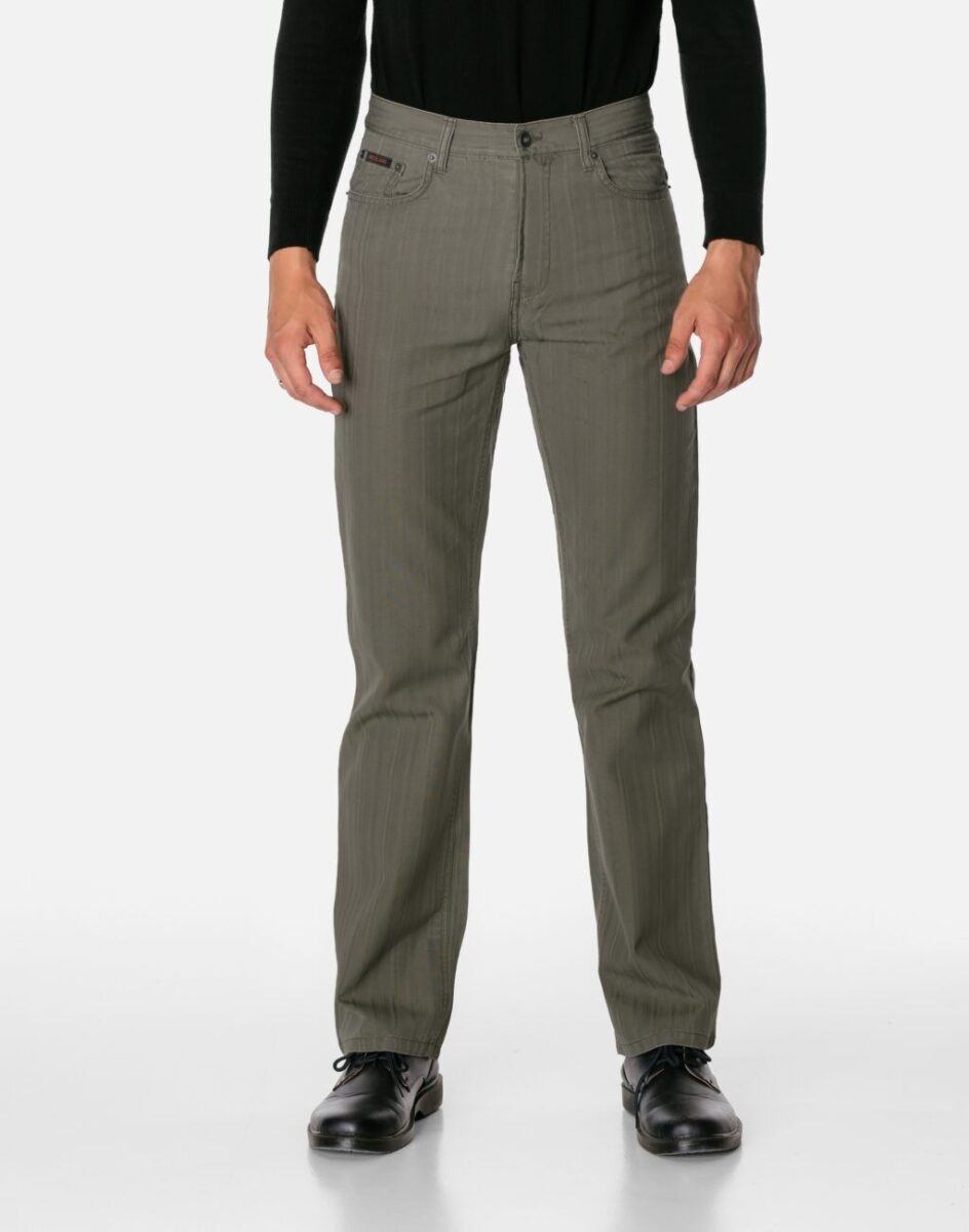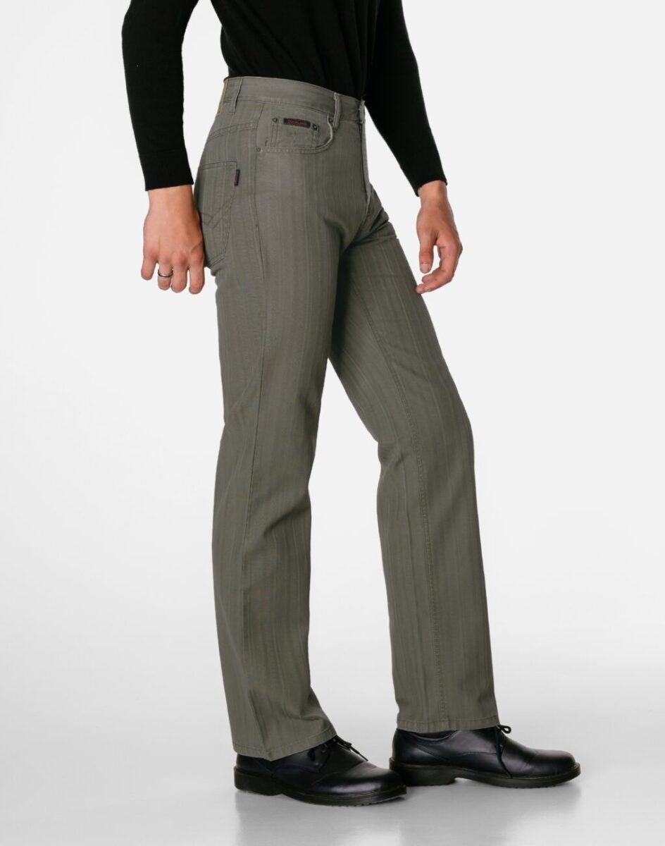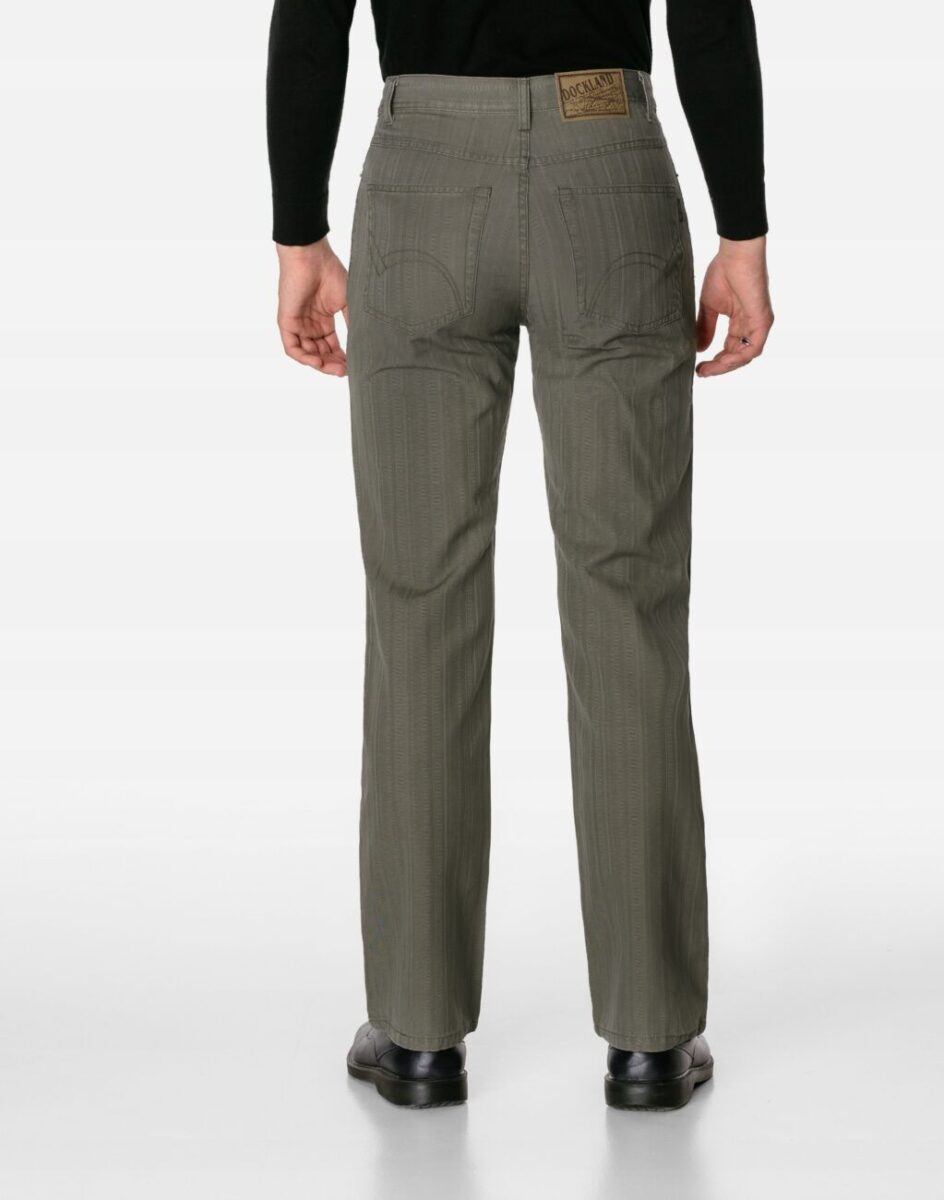 Wygodne i praktyczne podczas użytkowania spodnie męskie bawełniane ze standardowym stanem i klasyczną prostą nogawką to jeden z najczęściej wybieranych obecnie modeli spodni. Wykonane z wysokiej jakości trwałej i mocnej tkaniny bawełnianej średniej grubości o gęstym, drobnym splocie i jednolitym wybarwieniu w drobny prążek. Zapinane są na kryty zamek błyskawiczny i metalowy guzik sygnowany logiem firmy. Z przodu mają dwie kieszonki zaokrąglone oraz mniejszą kieszonkę tzw. bilonówkę, a na tyle klasyczne kieszenie naszywane jak w typowych spodniach jeansowych. W pasie szlufki umożliwiające stylizacje z paskiem. Najbardziej podatne na uszkodzenia miejsca wzmocnione są dodatkowymi przeszyciami oraz metalowymi nitami.