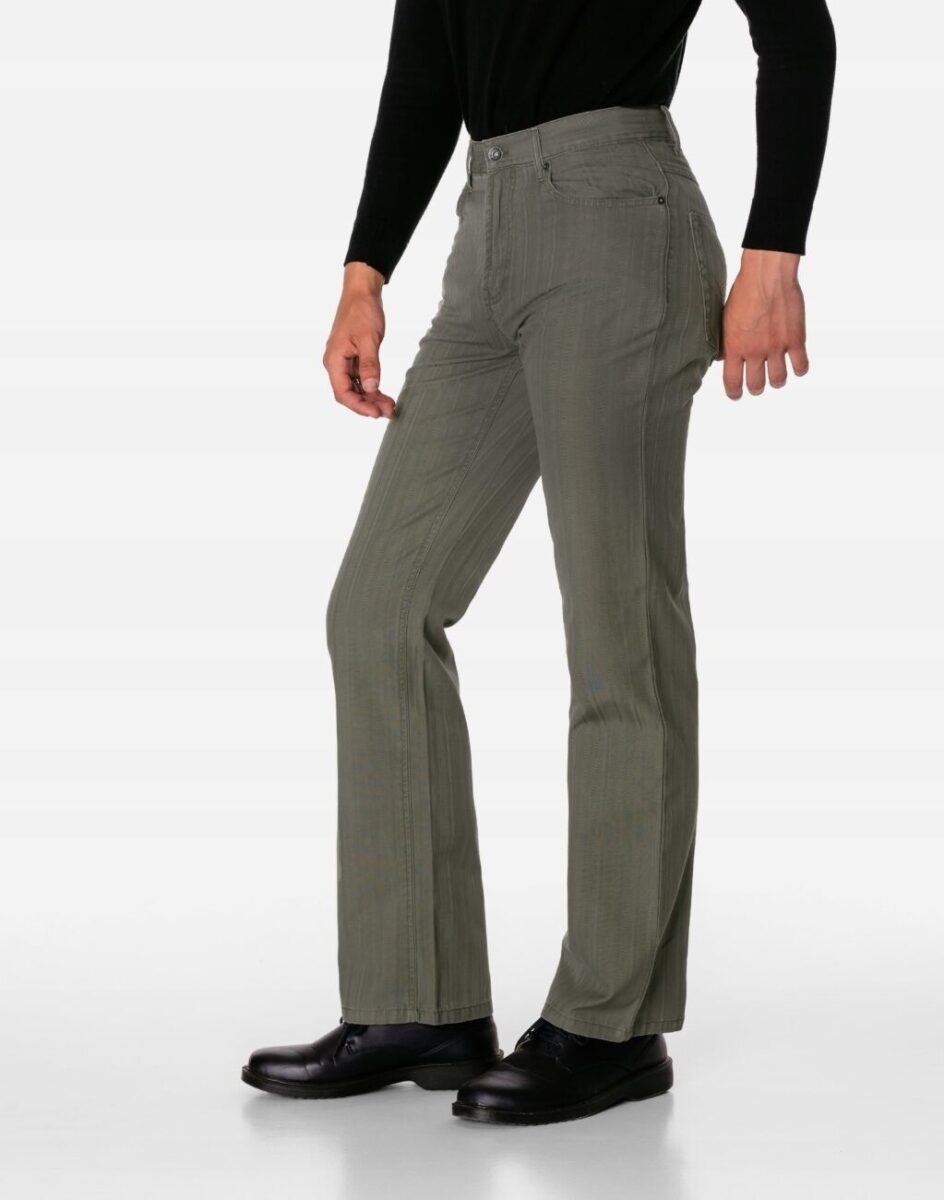 Wygodne i praktyczne podczas użytkowania spodnie męskie bawełniane ze standardowym stanem i klasyczną prostą nogawką to jeden z najczęściej wybieranych obecnie modeli spodni. Wykonane z wysokiej jakości trwałej i mocnej tkaniny bawełnianej średniej grubości o gęstym, drobnym splocie i jednolitym wybarwieniu w drobny prążek. Zapinane są na kryty zamek błyskawiczny i metalowy guzik sygnowany logiem firmy. Z przodu mają dwie kieszonki zaokrąglone oraz mniejszą kieszonkę tzw. bilonówkę, a na tyle klasyczne kieszenie naszywane jak w typowych spodniach jeansowych. W pasie szlufki umożliwiające stylizacje z paskiem. Najbardziej podatne na uszkodzenia miejsca wzmocnione są dodatkowymi przeszyciami oraz metalowymi nitami.