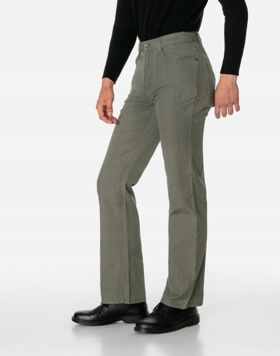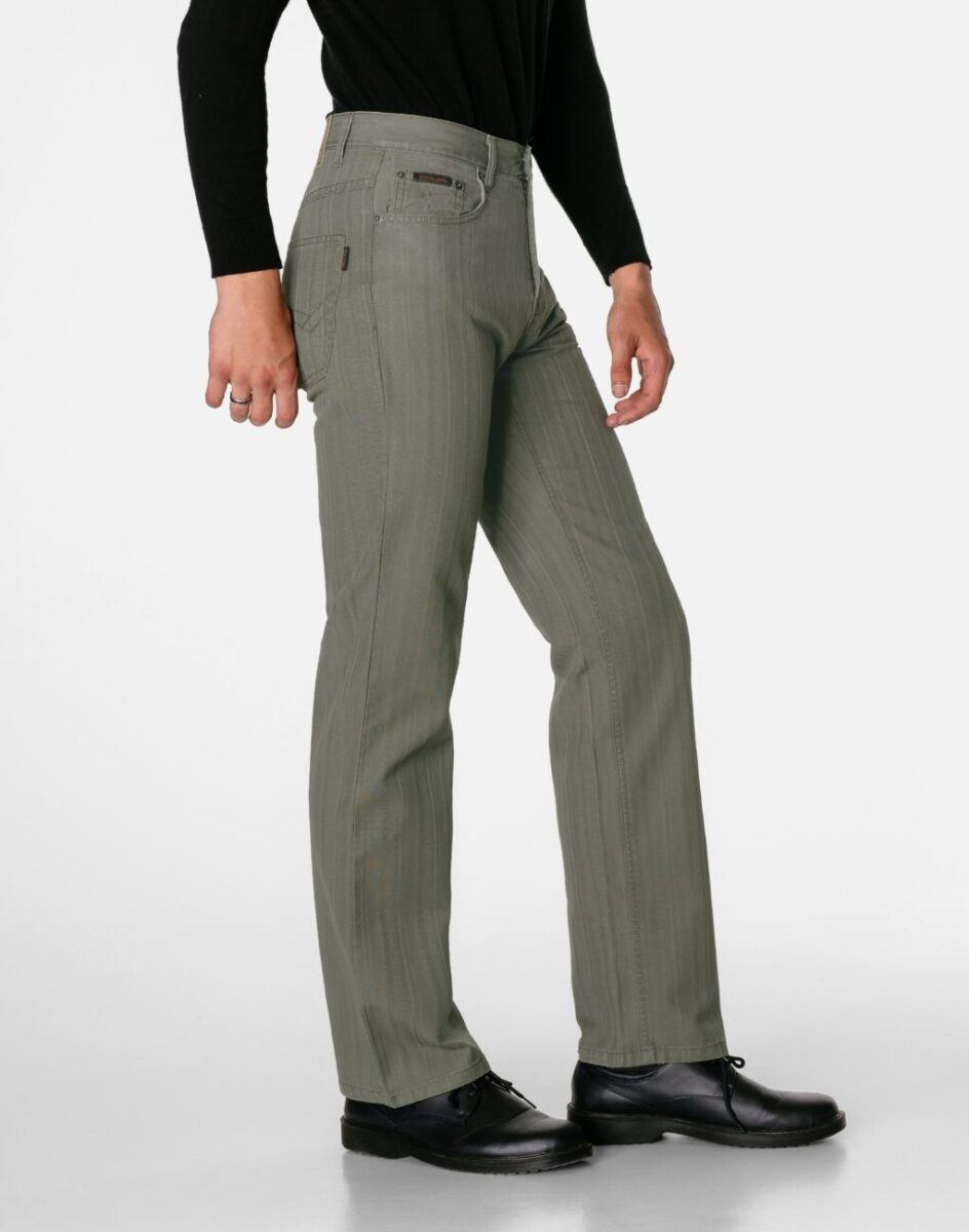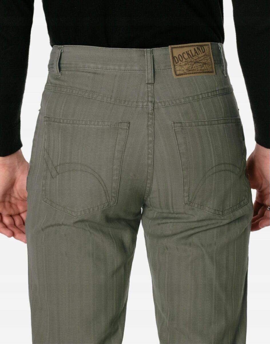 Wygodne i praktyczne podczas użytkowania spodnie męskie bawełniane ze standardowym stanem i klasyczną prostą nogawką to jeden z najczęściej wybieranych obecnie modeli spodni. Wykonane z wysokiej jakości trwałej i mocnej tkaniny bawełnianej średniej grubości o gęstym, drobnym splocie i jednolitym wybarwieniu w drobny prążek. Zapinane są na kryty zamek błyskawiczny i metalowy guzik sygnowany logiem firmy. Z przodu mają dwie kieszonki zaokrąglone oraz mniejszą kieszonkę tzw. bilonówkę, a na tyle klasyczne kieszenie naszywane jak w typowych spodniach jeansowych. W pasie szlufki umożliwiające stylizacje z paskiem. Najbardziej podatne na uszkodzenia miejsca wzmocnione są dodatkowymi przeszyciami oraz metalowymi nitami.