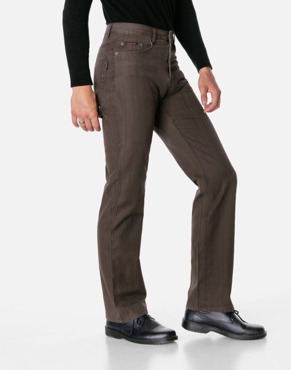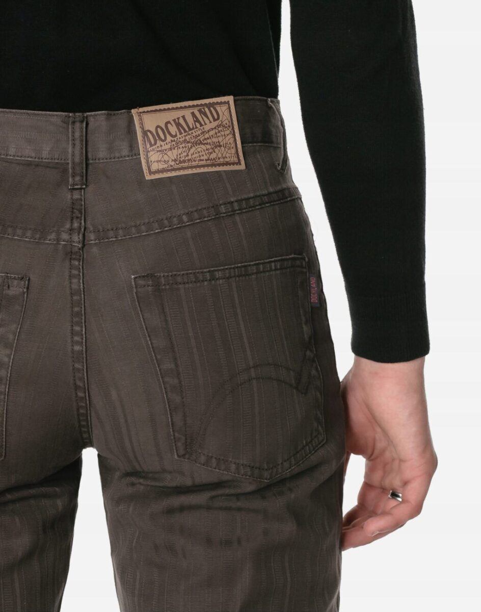 Wygodne i praktyczne podczas użytkowania spodnie męskie bawełniane ze standardowym stanem i klasyczną prostą nogawką to jeden z najczęściej wybieranych obecnie modeli spodni. Wykonane z wysokiej jakości trwałej i mocnej tkaniny bawełnianej średniej grubości o gęstym, drobnym splocie i jednolitym wybarwieniu w drobny prążek. Zapinane są na kryty zamek błyskawiczny i metalowy guzik sygnowany logiem firmy. Z przodu mają dwie kieszonki zaokrąglone oraz mniejszą kieszonkę tzw. bilonówkę, a na tyle klasyczne kieszenie naszywane jak w typowych spodniach jeansowych. W pasie szlufki umożliwiające stylizacje z paskiem. Najbardziej podatne na uszkodzenia miejsca wzmocnione są dodatkowymi przeszyciami oraz metalowymi nitami.