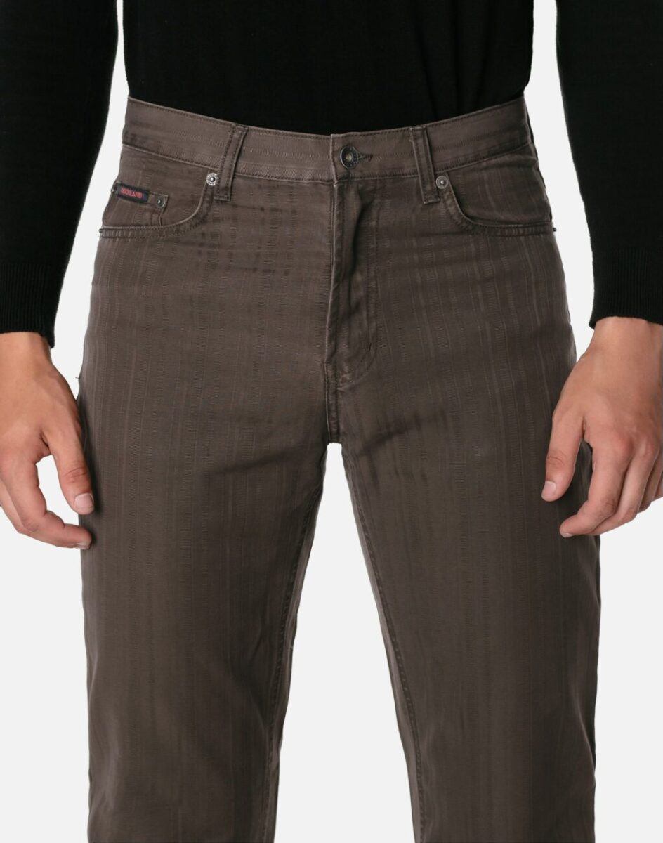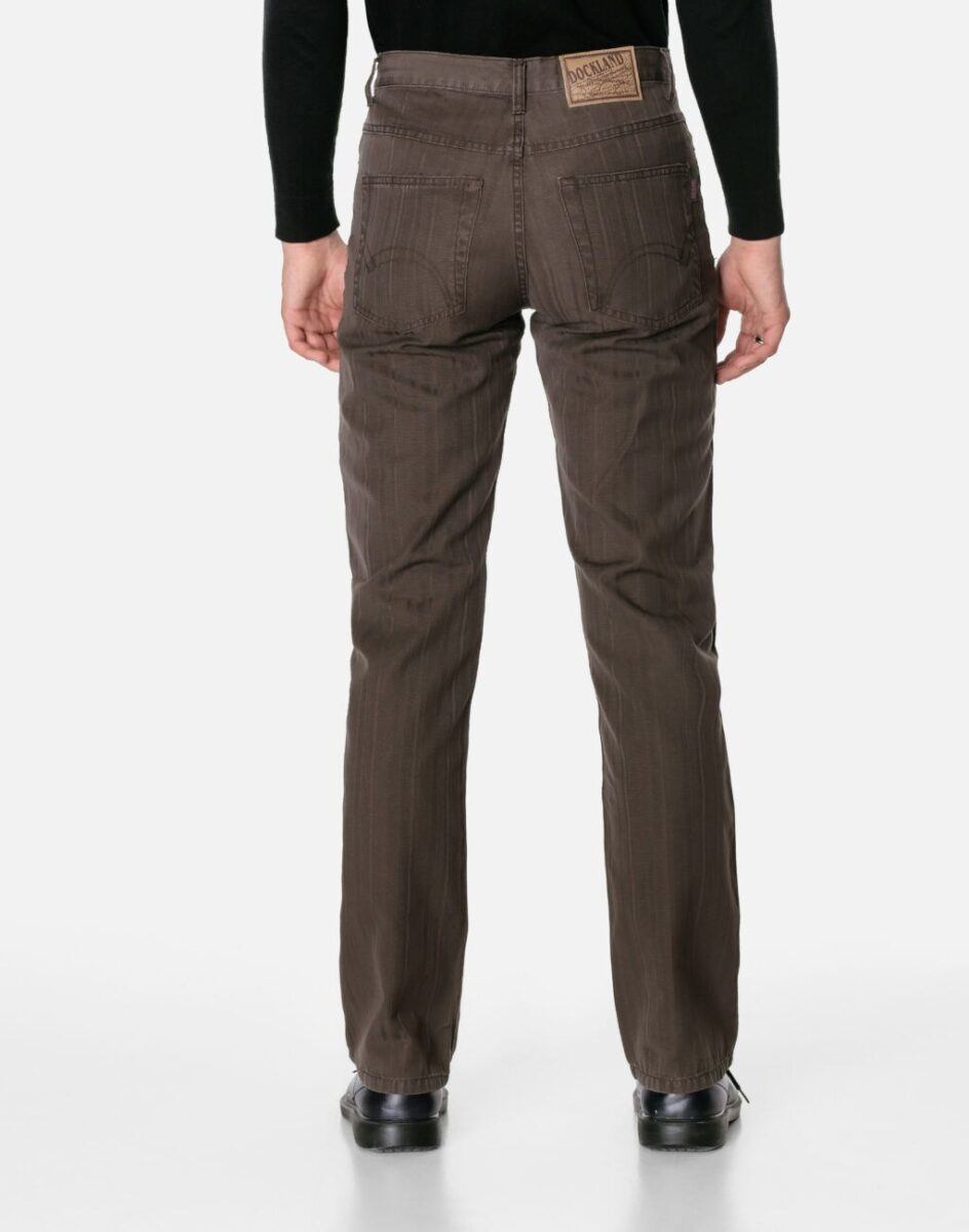 Wygodne i praktyczne podczas użytkowania spodnie męskie bawełniane ze standardowym stanem i klasyczną prostą nogawką to jeden z najczęściej wybieranych obecnie modeli spodni. Wykonane z wysokiej jakości trwałej i mocnej tkaniny bawełnianej średniej grubości o gęstym, drobnym splocie i jednolitym wybarwieniu w drobny prążek. Zapinane są na kryty zamek błyskawiczny i metalowy guzik sygnowany logiem firmy. Z przodu mają dwie kieszonki zaokrąglone oraz mniejszą kieszonkę tzw. bilonówkę, a na tyle klasyczne kieszenie naszywane jak w typowych spodniach jeansowych. W pasie szlufki umożliwiające stylizacje z paskiem. Najbardziej podatne na uszkodzenia miejsca wzmocnione są dodatkowymi przeszyciami oraz metalowymi nitami.
