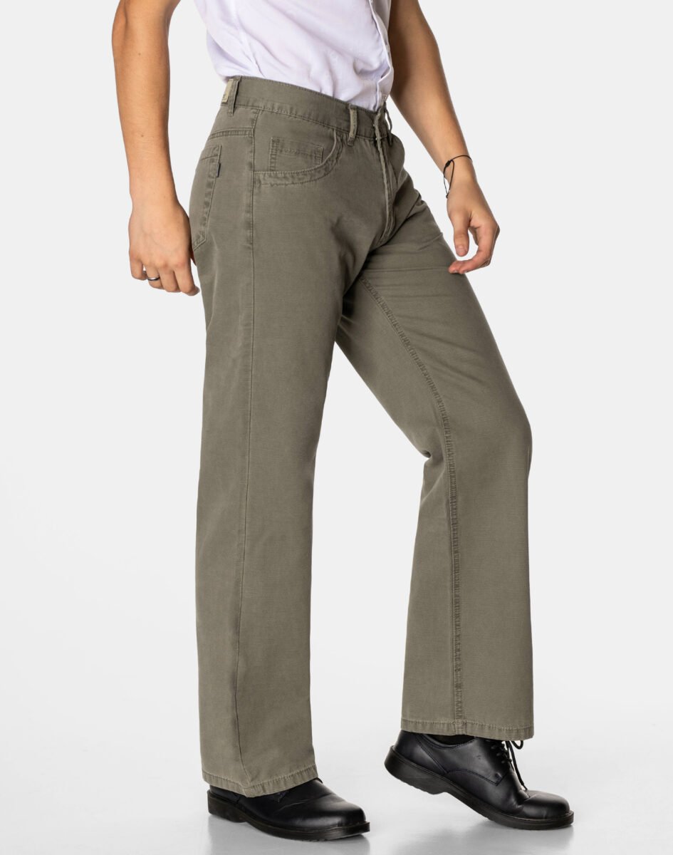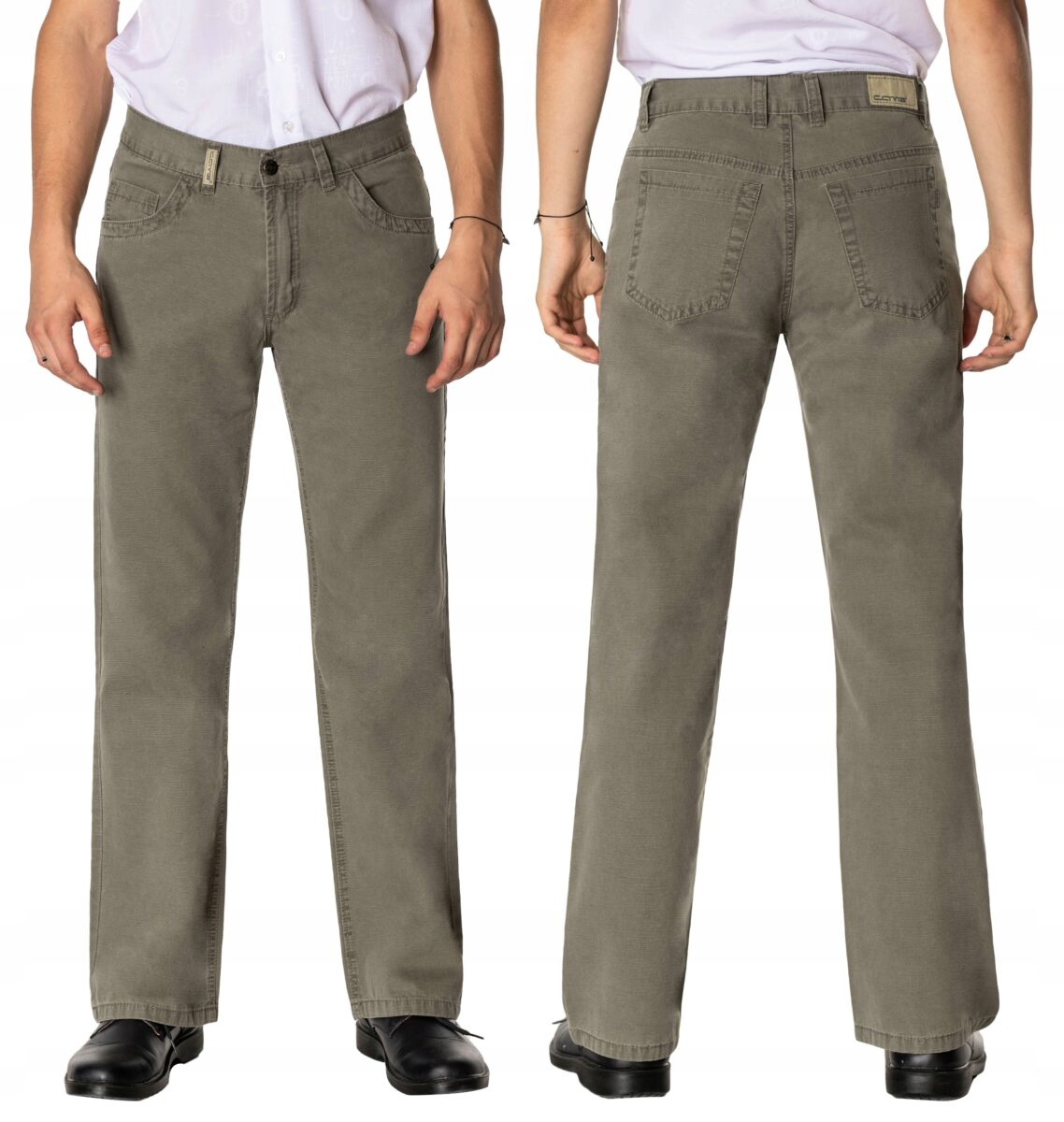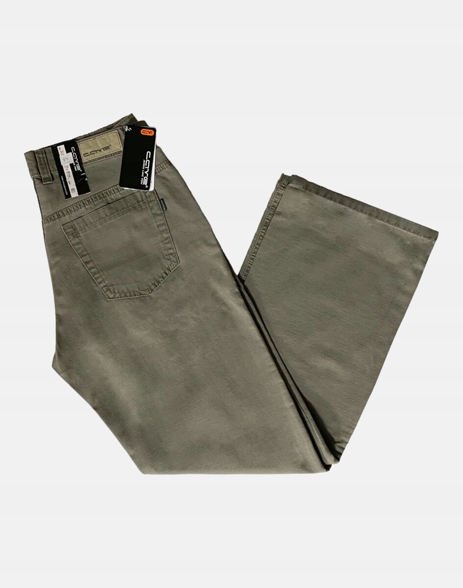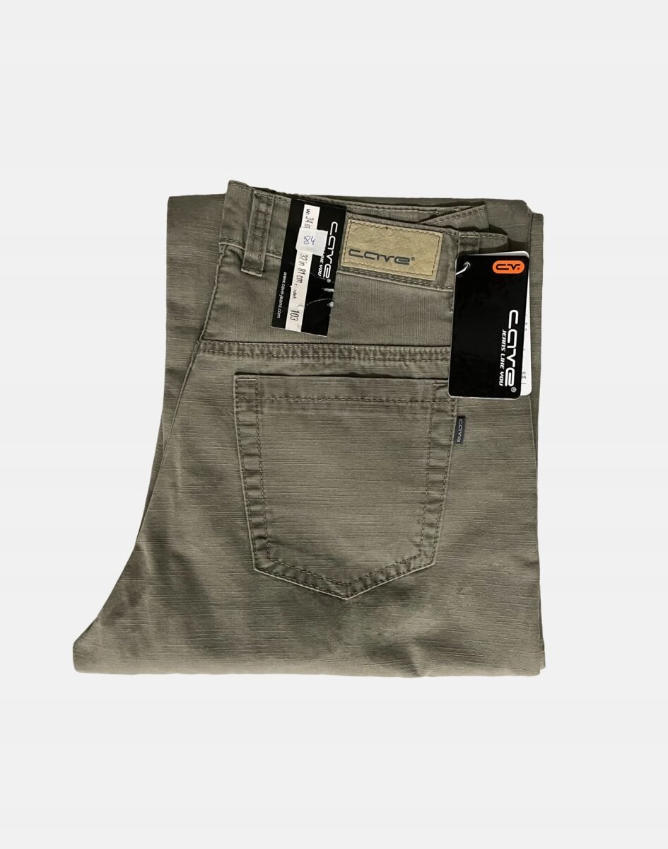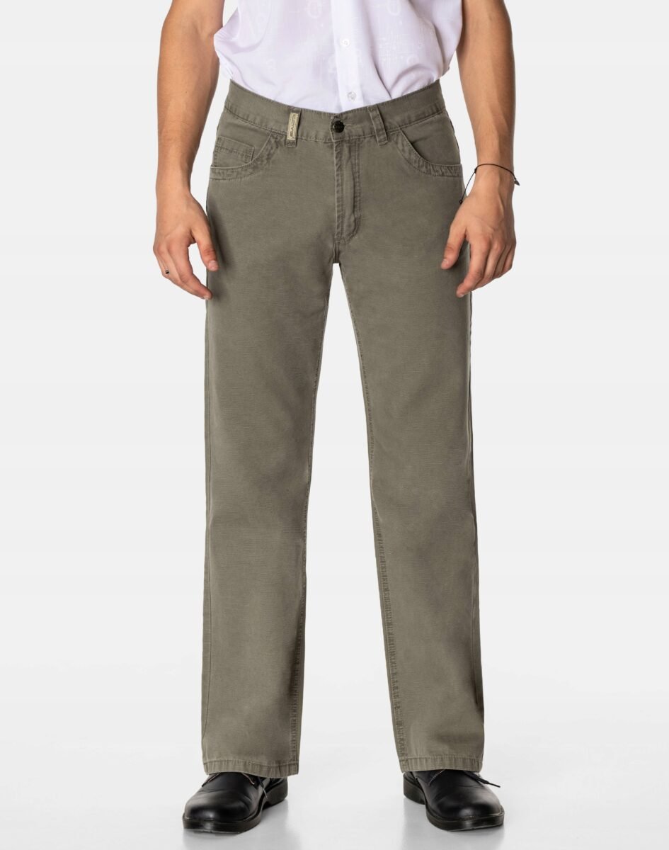 Klasyczne i ponadczasowe spodnie męskie bawełniane, umiarkowanie swobodne w biodrach, o prostych, smukłych nogawkach to jeden z najczęściej wybieranych przez mężczyzn modeli spodni. Wykonane z wysokiej jakości trwałej i mocnej tkaniny 100% bawełnianej o drobnym, gęstym splocie i eleganckim beżowo-szarym wybarwieniu, wyjątkowo wygodnej w użytkowaniu. Zapinane na kryty zamek błyskawiczny i metalowy guzik sygnowany logiem firmy. Z przodu mają dwie zaokrąglone kieszonki oraz jedną mniejszą tzw. bilonówkę, a na tyle klasyczne naszywane kieszenie jak w typowych spodniach jeansowych. Najbardziej podatne na uszkodzenia miejsca wzmocnione są podwójnymi przeszyciami oraz metalowymi nitami. W pasie szlufki umożliwiające eleganckie stylizacje z paskiem.
