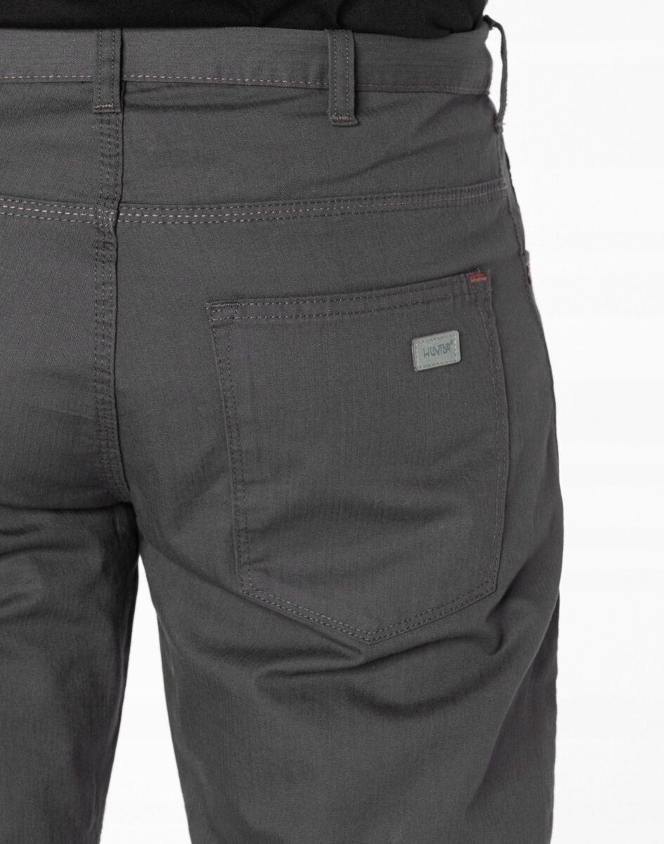 Niesłychanie wygodne i praktyczne podczas użytkowania spodnie męskie bawełniane polskiej firmy HUNTER ze standardowym stanem i klasyczną lekko zwężaną nogawką to jeden z najczęściej wybieranych modeli spodni. Wykonane z wysokiej jakości trwałej i mocnej tkaniny bawełnianej o gęstym, drobnym splocie i jednolitym wybarwieniu. Zapinane są na kryty zamek błyskawiczny i metalowy guzik sygnowany logiem firmy. Z przodu mają dwie kieszonki zaokrąglone oraz mniejszą kieszonkę tzw. bilonówkę, a na tyle klasyczne kieszenie naszywane jak w typowych spodniach jeansowych. W pasie szlufki umożliwiające stylizacje z paskiem. Najbardziej podatne na uszkodzenia miejsca wzmocnione są dodatkowymi przeszyciami oraz nitami.