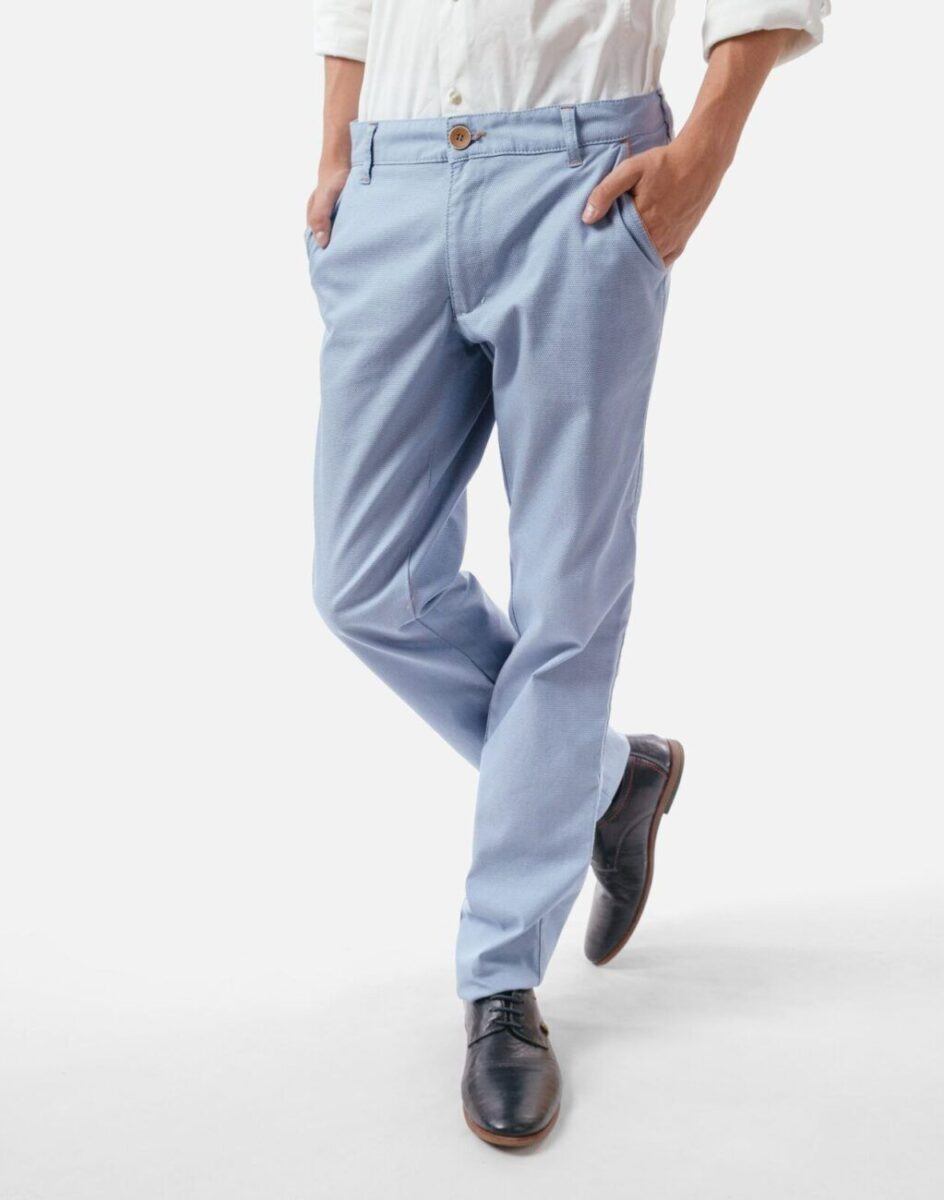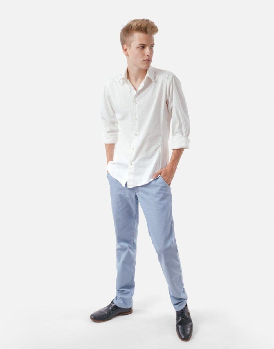 Casualowe spodnie męskie typu Chinosy uszyte z wysokiej jakości ekologicznej tkaniny będącej mieszanką bawełny i elastanu to wygodne rozwiązanie na ciepłe dni wiosny i lata oraz niezbędny element wakacyjnej garderoby. Wygodne, z nieco luźniejszą nogawką, niekrępujące ruchów, idealne na co dzień jako element casualowego stroju, czyniąc go lekkim i dostosowanym do wysokich temperatur. Zapinane na kryty zamek błyskawiczny i guzik posiadają charakterystyczne dla Chinosów dwie skośne kieszenie na dłonie na bokach spodni i dwie wpuszczane kieszenie zapinane na guzik z tyłu. W pasie szlufki umożliwiające stylizacje z paskiem. Klasyczna lekko zwężana nogawka nie zaprasowana na kant.