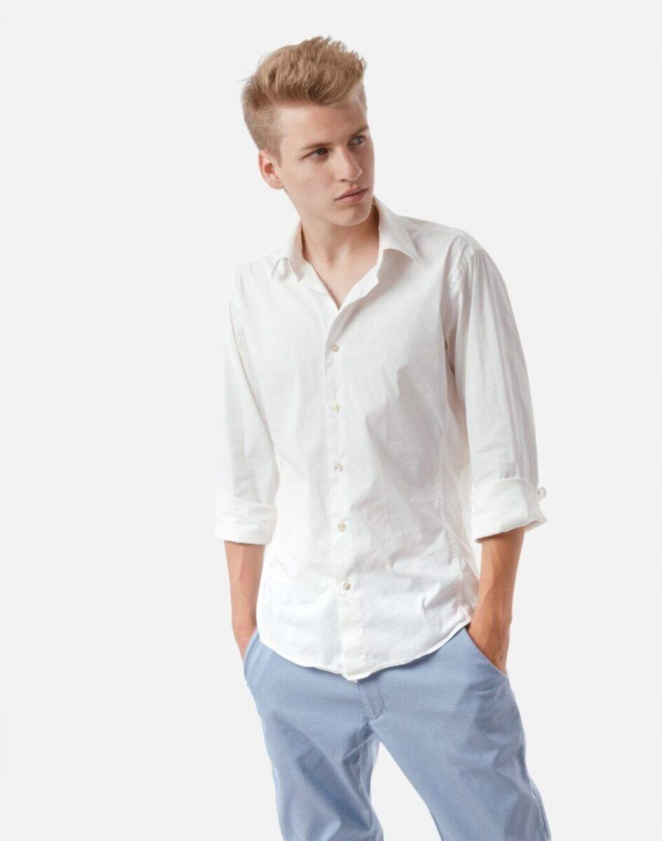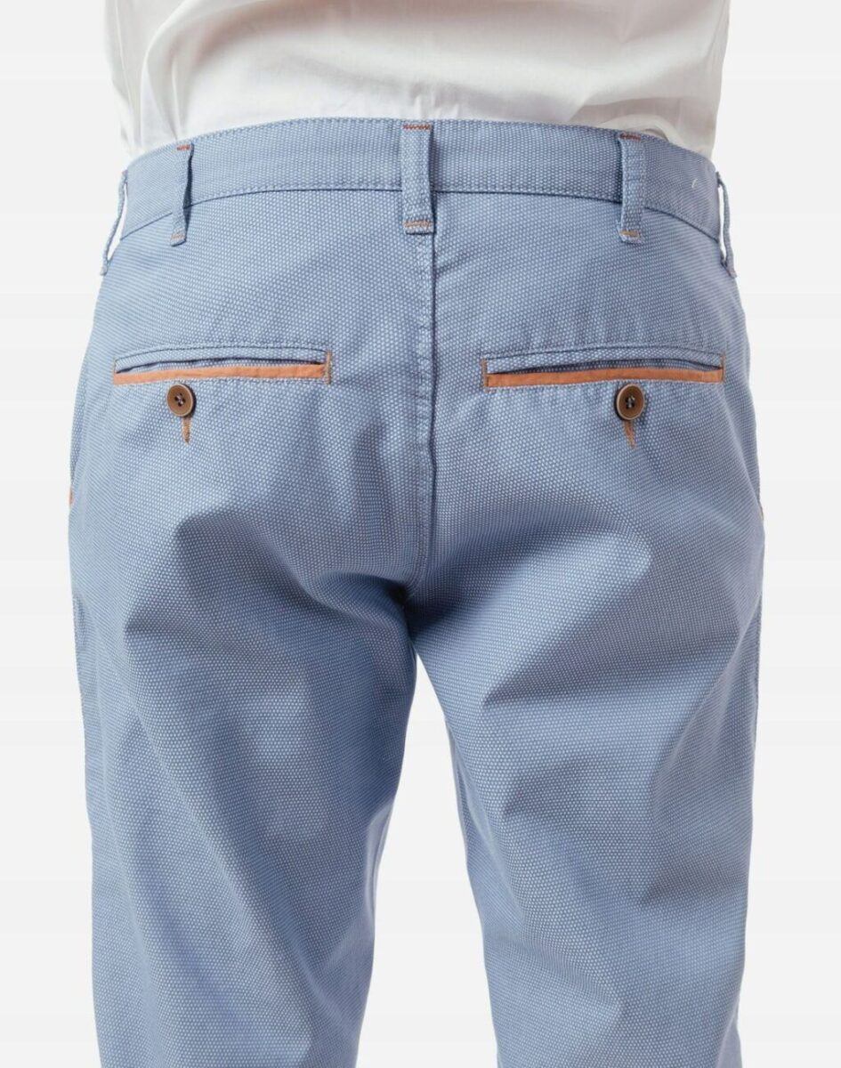 Casualowe spodnie męskie typu Chinosy uszyte z wysokiej jakości ekologicznej tkaniny będącej mieszanką bawełny i elastanu to wygodne rozwiązanie na ciepłe dni wiosny i lata oraz niezbędny element wakacyjnej garderoby. Wygodne, z nieco luźniejszą nogawką, niekrępujące ruchów, idealne na co dzień jako element casualowego stroju, czyniąc go lekkim i dostosowanym do wysokich temperatur. Zapinane na kryty zamek błyskawiczny i guzik posiadają charakterystyczne dla Chinosów dwie skośne kieszenie na dłonie na bokach spodni i dwie wpuszczane kieszenie zapinane na guzik z tyłu. W pasie szlufki umożliwiające stylizacje z paskiem. Klasyczna lekko zwężana nogawka nie zaprasowana na kant.