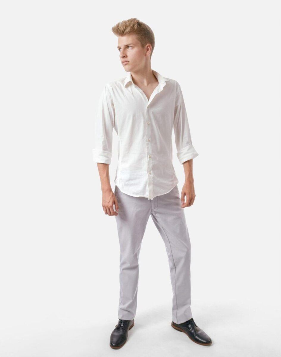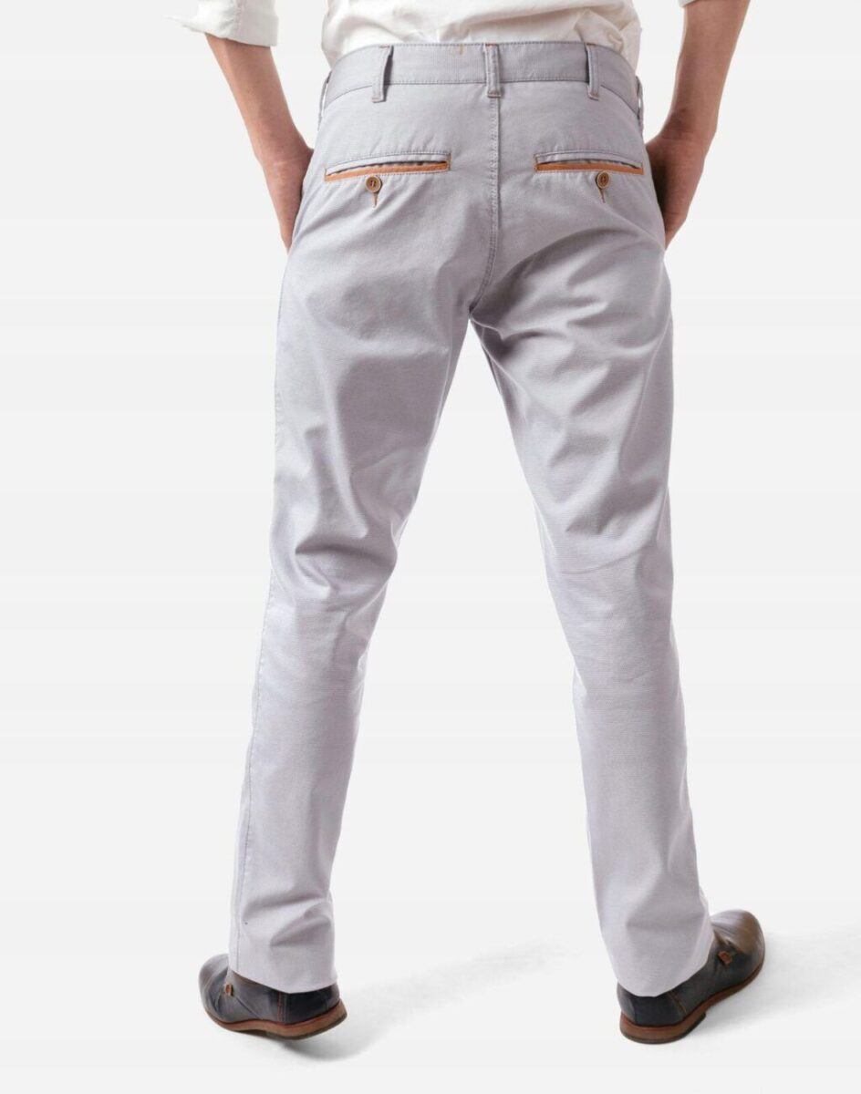 Casualowe spodnie męskie typu Chinosy uszyte z wysokiej jakości ekologicznej tkaniny będącej mieszanką bawełny i elastanu to wygodne rozwiązanie na ciepłe dni wiosny i lata oraz niezbędny element wakacyjnej garderoby. Wygodne, z nieco luźniejszą nogawką, niekrępujące ruchów, idealne na co dzień jako element casualowego stroju, czyniąc go lekkim i dostosowanym do wysokich temperatur. Zapinane na kryty zamek błyskawiczny i guzik posiadają charakterystyczne dla Chinosów dwie skośne kieszenie na dłonie na bokach spodni i dwie wpuszczane kieszenie zapinane na guzik z tyłu. W pasie szlufki umożliwiające stylizacje z paskiem. Klasyczna lekko zwężana nogawka nie zaprasowana na kant.